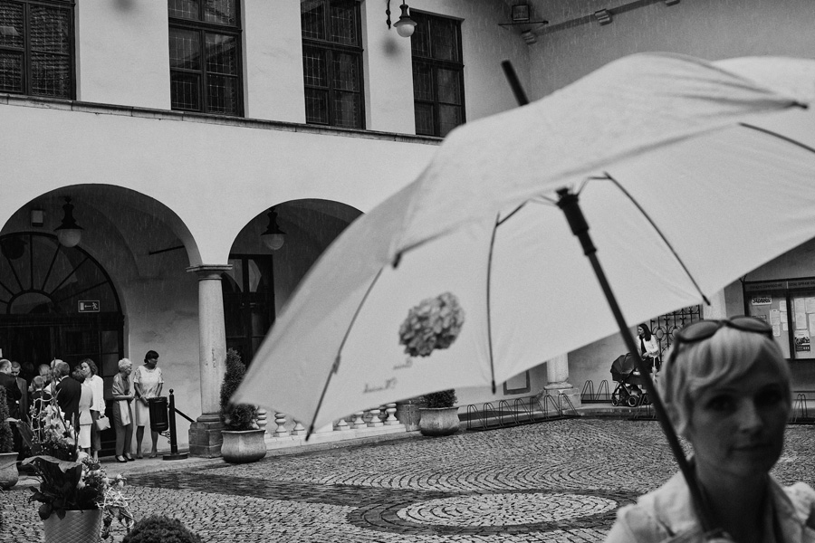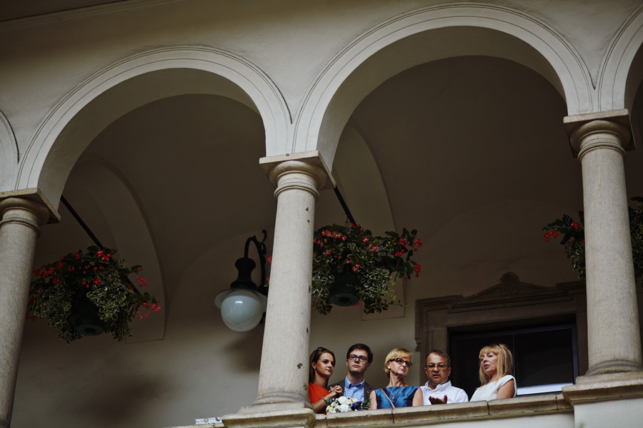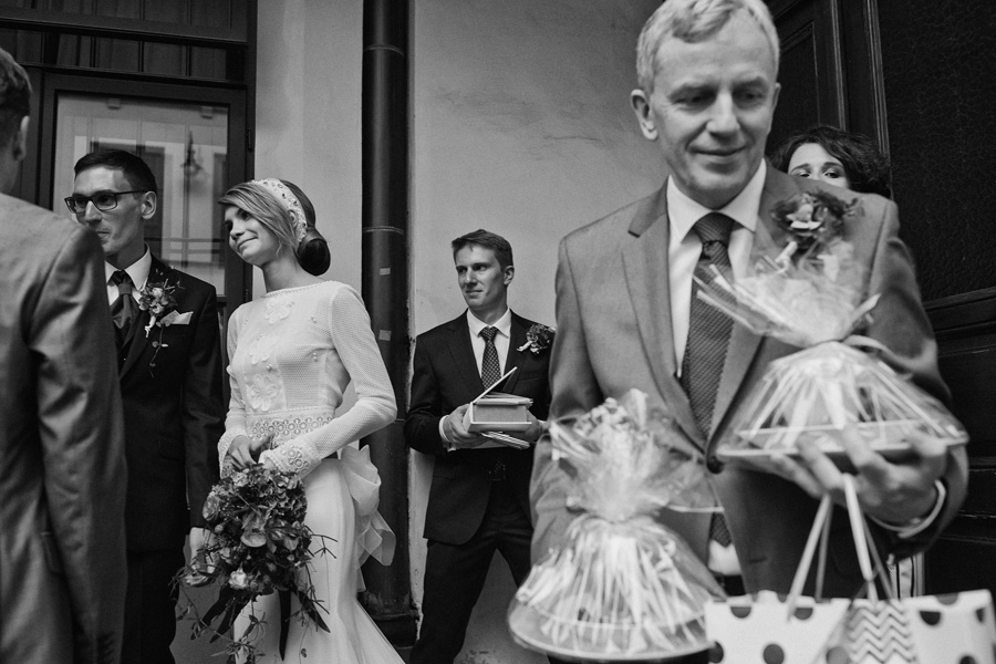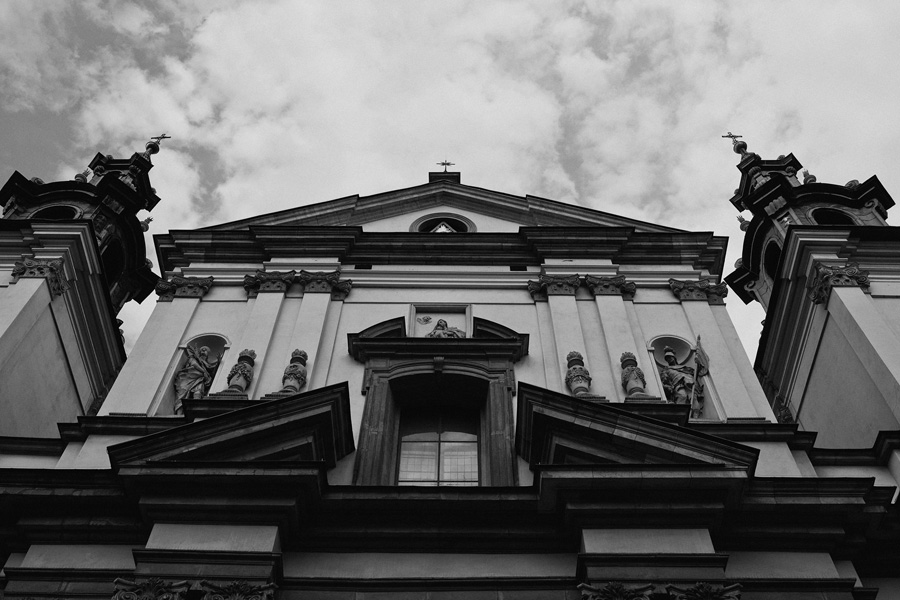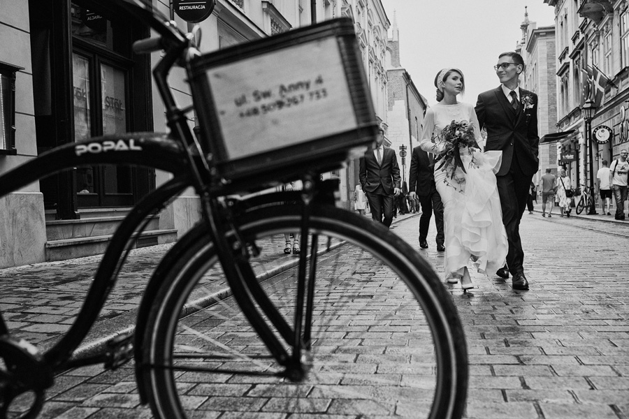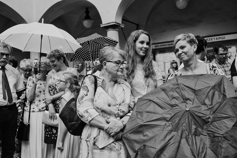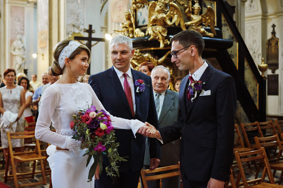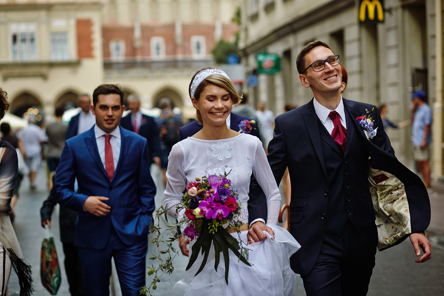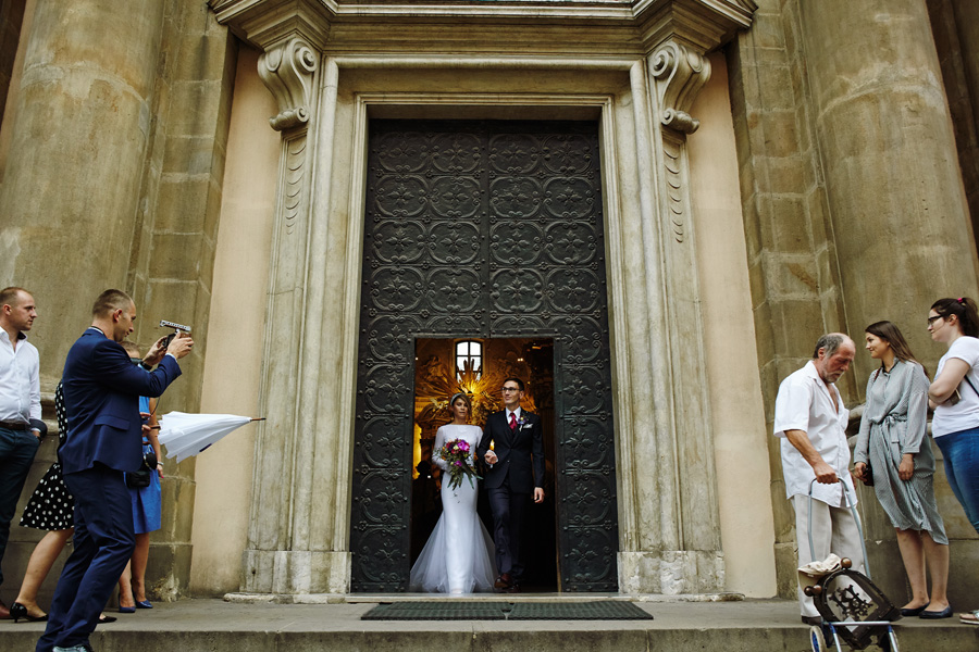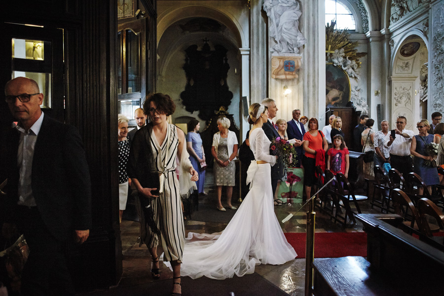 Wybór zdjęć nigdy nie jest łatwy, ale czasem z napisaniem tekstu jest jeszcze trudniej. To był jeden z tych momentów, kiedy faktycznie sobie uświadamiasz, że reportaż ślubny to ludzie i że to, co oni budują sobą i swoimi emocjami jest tysiąc razy więcej warte, niż najpiękniejsze dekoracje ślubne w najpiękniejszych hotelach czy pałacach. Niby truizm, ale jednak jesteśmy zanurzeni po uszy w kulturze obrazkowej, sprzedajemy obrazy, cała ta zewnętrzna oprawa zawsze jest ważna, bo dodaje zdjęciom atrakcyjności, to oczywiste. Ale kiedy widzę, że na maleńki, kameralny ślub przychodzi do kościoła dwustu gości, żeby złożyć Młodej Parze życzenia, to myślę sobie, że jestem świadkiem czegoś absolutnie wyjątkowego. Tylko naprawdę niesamowite dobro i piękno może mieć taką siłę przyciągania – czyli ONI. Ania i Maciek pobrali się w Kolegiacie św. Anny w Krakowie. Ceremonię uświetnił Chór Mariański, czyniąc ją jeszcze bardziej wzruszającą. Ania i Maciek mieli zupełnie niestandardowy pomysł na swój dzień, a właściwie dwa dni, więc w tym pierwszym dniu skupili się całkowicie tylko na sobie nawzajem i na swoich najbliższych, których po ceremonii zaprosili na krótkie przyjęcie do Hotelu Starego. Wcześniej jednak odebrali masę życzeń od życzliwych im osób.