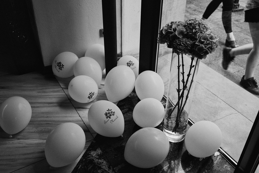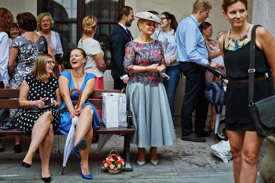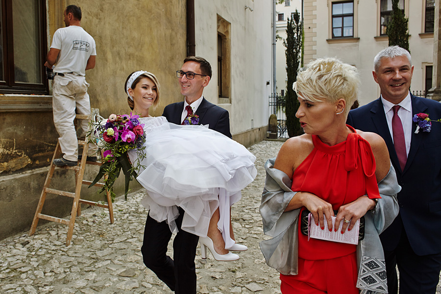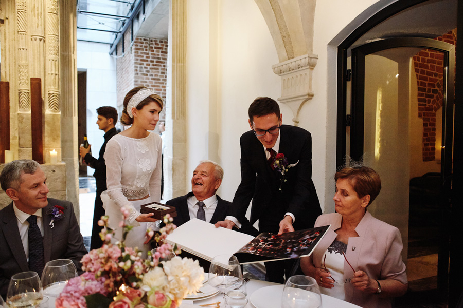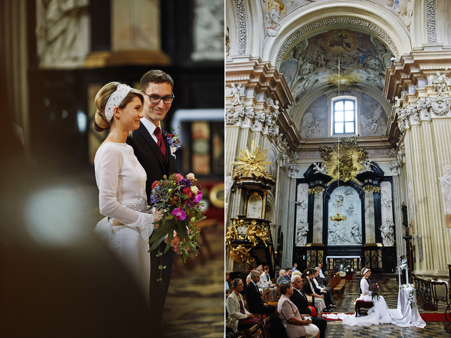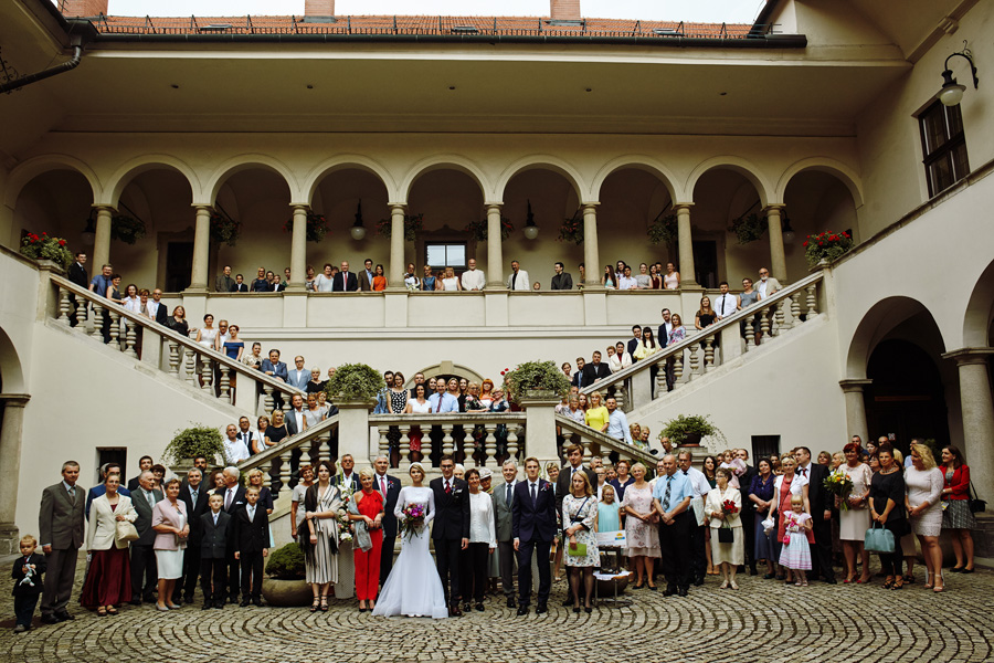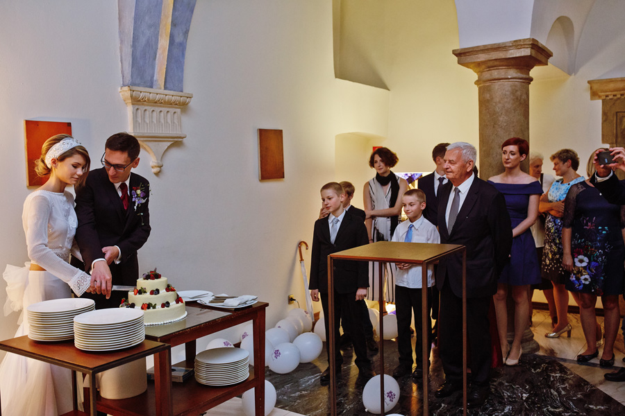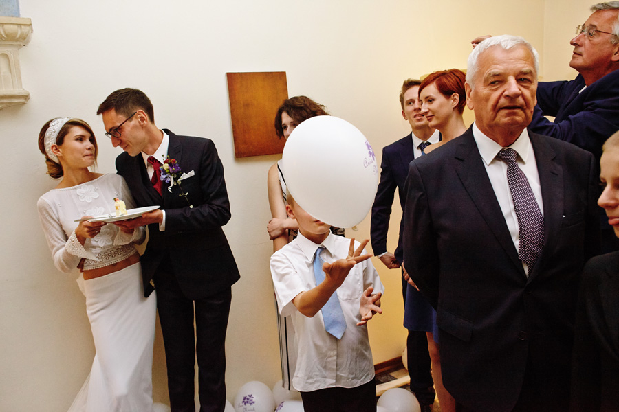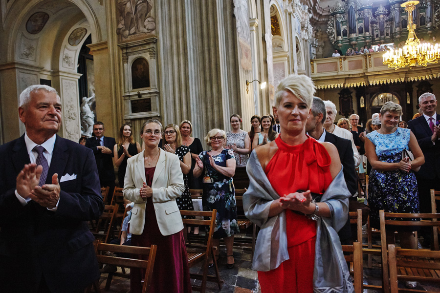 Wybór zdjęć nigdy nie jest łatwy, ale czasem z napisaniem tekstu jest jeszcze trudniej. To był jeden z tych momentów, kiedy faktycznie sobie uświadamiasz, że reportaż ślubny to ludzie i że to, co oni budują sobą i swoimi emocjami jest tysiąc razy więcej warte, niż najpiękniejsze dekoracje ślubne w najpiękniejszych hotelach czy pałacach. Niby truizm, ale jednak jesteśmy zanurzeni po uszy w kulturze obrazkowej, sprzedajemy obrazy, cała ta zewnętrzna oprawa zawsze jest ważna, bo dodaje zdjęciom atrakcyjności, to oczywiste. Ale kiedy widzę, że na maleńki, kameralny ślub przychodzi do kościoła dwustu gości, żeby złożyć Młodej Parze życzenia, to myślę sobie, że jestem świadkiem czegoś absolutnie wyjątkowego. Tylko naprawdę niesamowite dobro i piękno może mieć taką siłę przyciągania – czyli ONI. Ania i Maciek pobrali się w Kolegiacie św. Anny w Krakowie. Ceremonię uświetnił Chór Mariański, czyniąc ją jeszcze bardziej wzruszającą. Ania i Maciek mieli zupełnie niestandardowy pomysł na swój dzień, a właściwie dwa dni, więc w tym pierwszym dniu skupili się całkowicie tylko na sobie nawzajem i na swoich najbliższych, których po ceremonii zaprosili na krótkie przyjęcie do Hotelu Starego. Wcześniej jednak odebrali masę życzeń od życzliwych im osób.