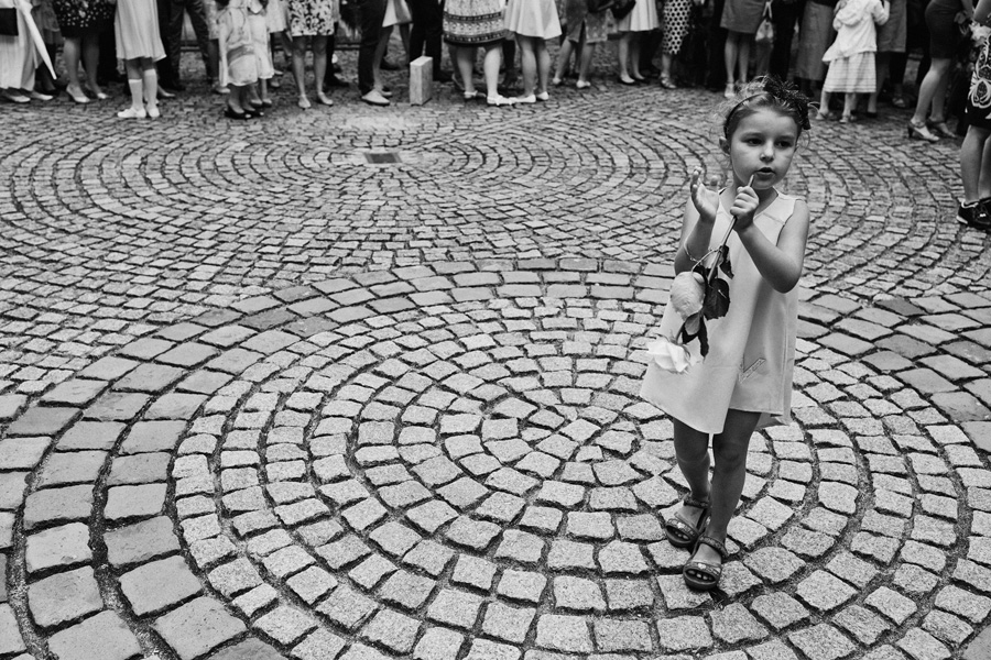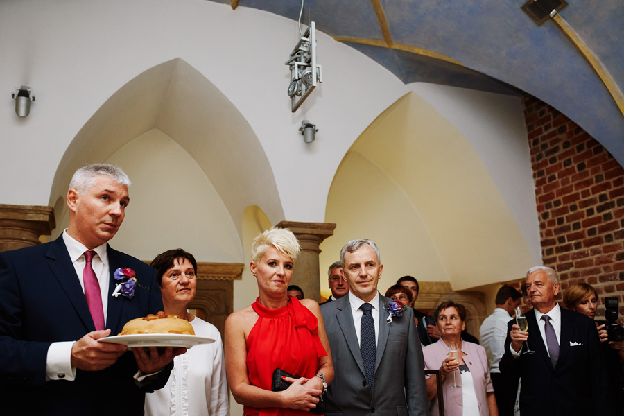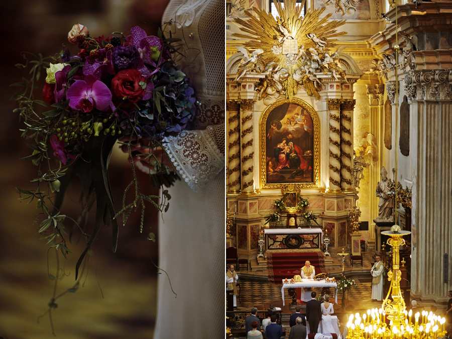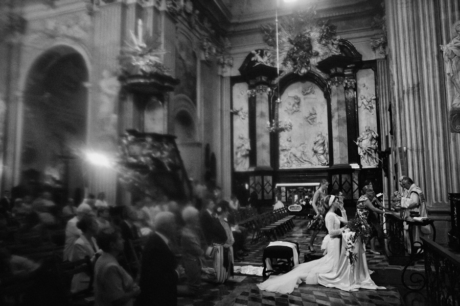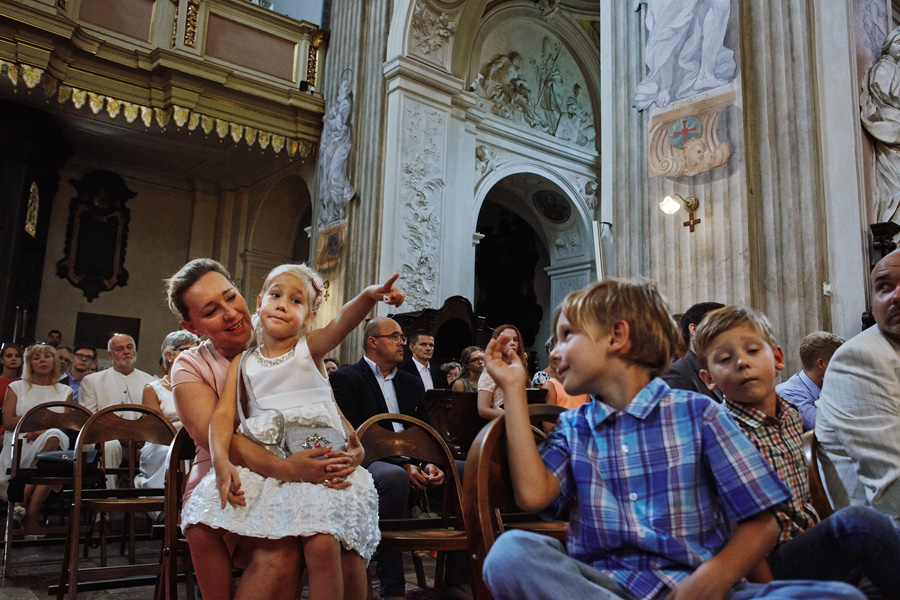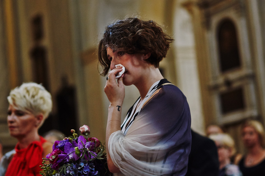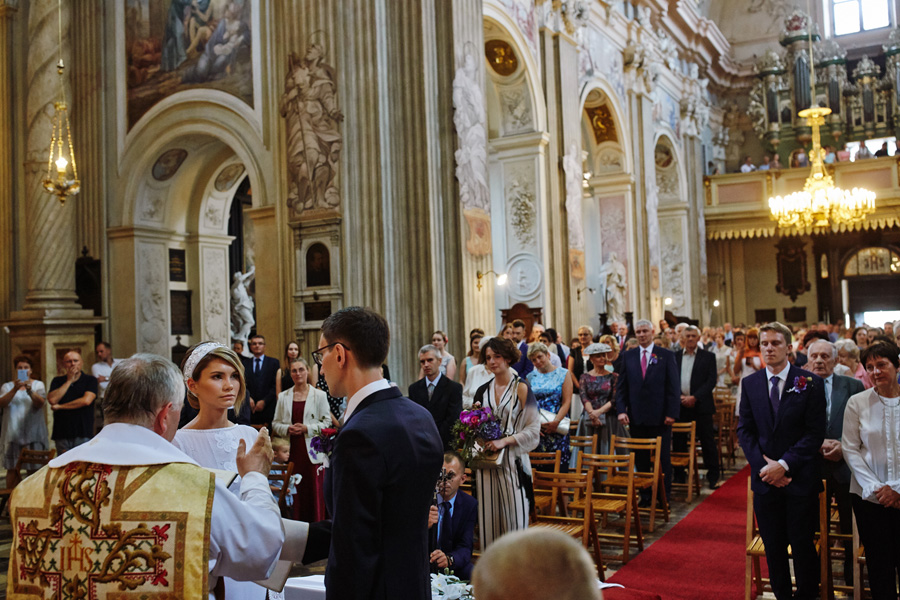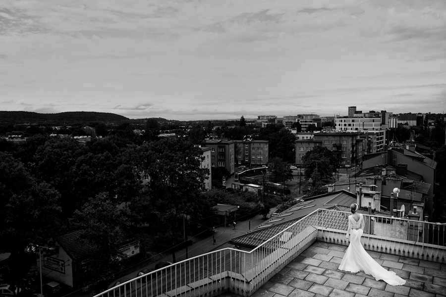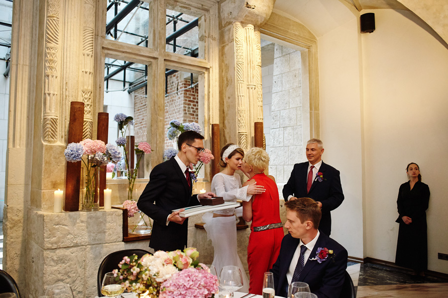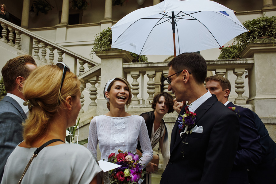 Wybór zdjęć nigdy nie jest łatwy, ale czasem z napisaniem tekstu jest jeszcze trudniej. To był jeden z tych momentów, kiedy faktycznie sobie uświadamiasz, że reportaż ślubny to ludzie i że to, co oni budują sobą i swoimi emocjami jest tysiąc razy więcej warte, niż najpiękniejsze dekoracje ślubne w najpiękniejszych hotelach czy pałacach. Niby truizm, ale jednak jesteśmy zanurzeni po uszy w kulturze obrazkowej, sprzedajemy obrazy, cała ta zewnętrzna oprawa zawsze jest ważna, bo dodaje zdjęciom atrakcyjności, to oczywiste. Ale kiedy widzę, że na maleńki, kameralny ślub przychodzi do kościoła dwustu gości, żeby złożyć Młodej Parze życzenia, to myślę sobie, że jestem świadkiem czegoś absolutnie wyjątkowego. Tylko naprawdę niesamowite dobro i piękno może mieć taką siłę przyciągania – czyli ONI. Ania i Maciek pobrali się w Kolegiacie św. Anny w Krakowie. Ceremonię uświetnił Chór Mariański, czyniąc ją jeszcze bardziej wzruszającą. Ania i Maciek mieli zupełnie niestandardowy pomysł na swój dzień, a właściwie dwa dni, więc w tym pierwszym dniu skupili się całkowicie tylko na sobie nawzajem i na swoich najbliższych, których po ceremonii zaprosili na krótkie przyjęcie do Hotelu Starego. Wcześniej jednak odebrali masę życzeń od życzliwych im osób.