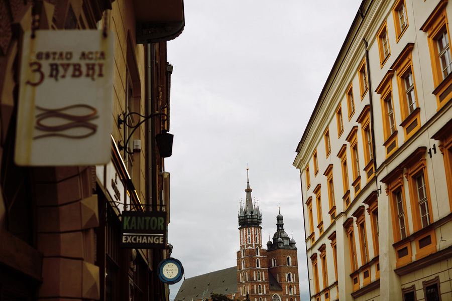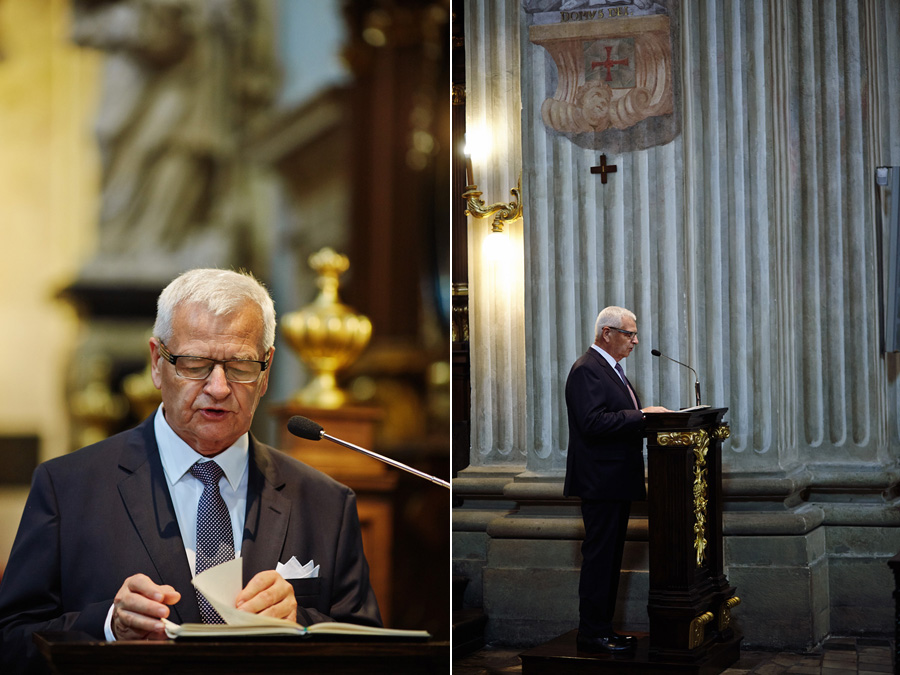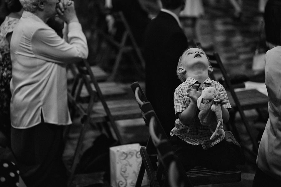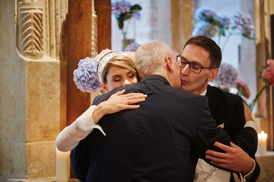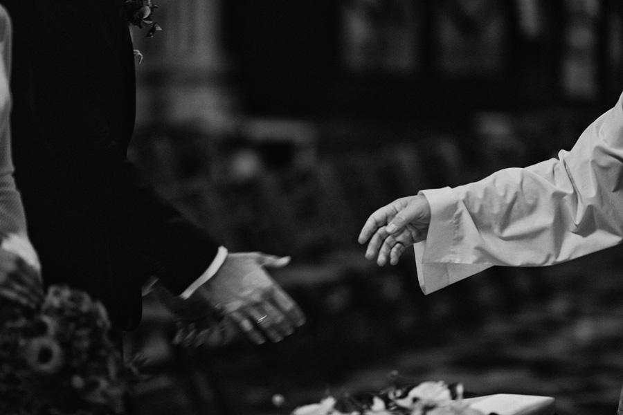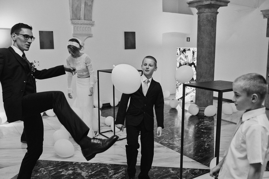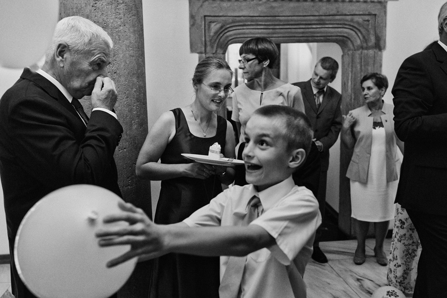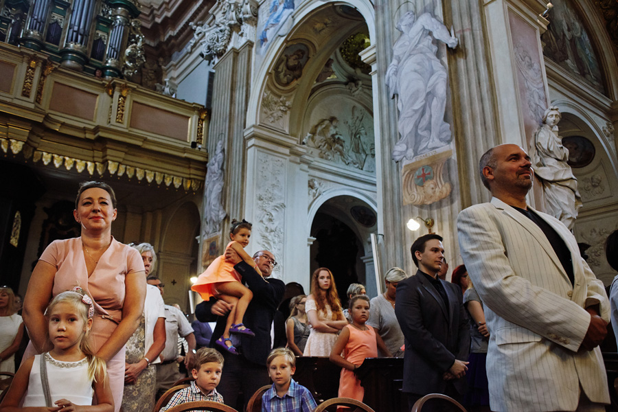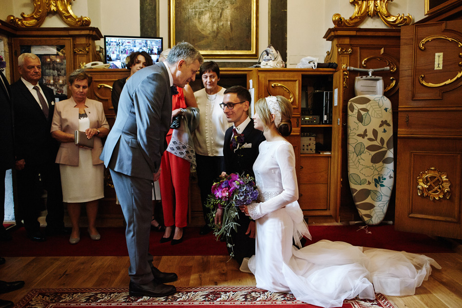 Wybór zdjęć nigdy nie jest łatwy, ale czasem z napisaniem tekstu jest jeszcze trudniej. To był jeden z tych momentów, kiedy faktycznie sobie uświadamiasz, że reportaż ślubny to ludzie i że to, co oni budują sobą i swoimi emocjami jest tysiąc razy więcej warte, niż najpiękniejsze dekoracje ślubne w najpiękniejszych hotelach czy pałacach. Niby truizm, ale jednak jesteśmy zanurzeni po uszy w kulturze obrazkowej, sprzedajemy obrazy, cała ta zewnętrzna oprawa zawsze jest ważna, bo dodaje zdjęciom atrakcyjności, to oczywiste. Ale kiedy widzę, że na maleńki, kameralny ślub przychodzi do kościoła dwustu gości, żeby złożyć Młodej Parze życzenia, to myślę sobie, że jestem świadkiem czegoś absolutnie wyjątkowego. Tylko naprawdę niesamowite dobro i piękno może mieć taką siłę przyciągania – czyli ONI. Ania i Maciek pobrali się w Kolegiacie św. Anny w Krakowie. Ceremonię uświetnił Chór Mariański, czyniąc ją jeszcze bardziej wzruszającą. Ania i Maciek mieli zupełnie niestandardowy pomysł na swój dzień, a właściwie dwa dni, więc w tym pierwszym dniu skupili się całkowicie tylko na sobie nawzajem i na swoich najbliższych, których po ceremonii zaprosili na krótkie przyjęcie do Hotelu Starego. Wcześniej jednak odebrali masę życzeń od życzliwych im osób.