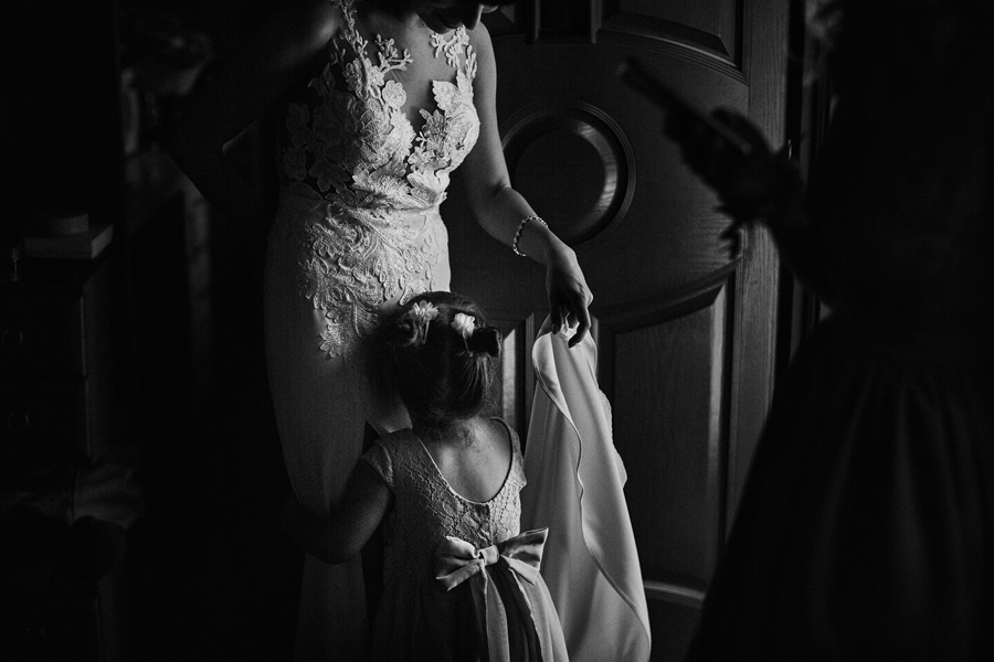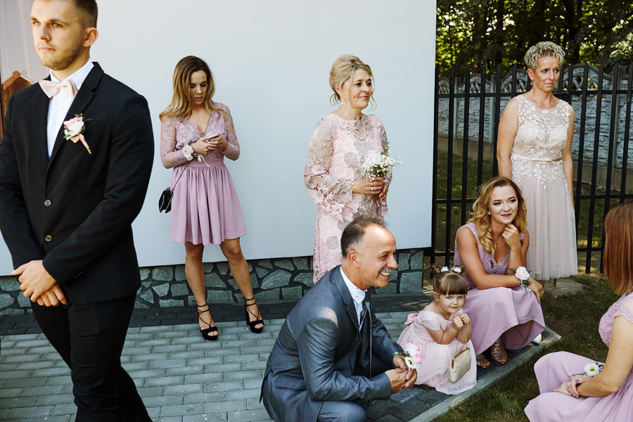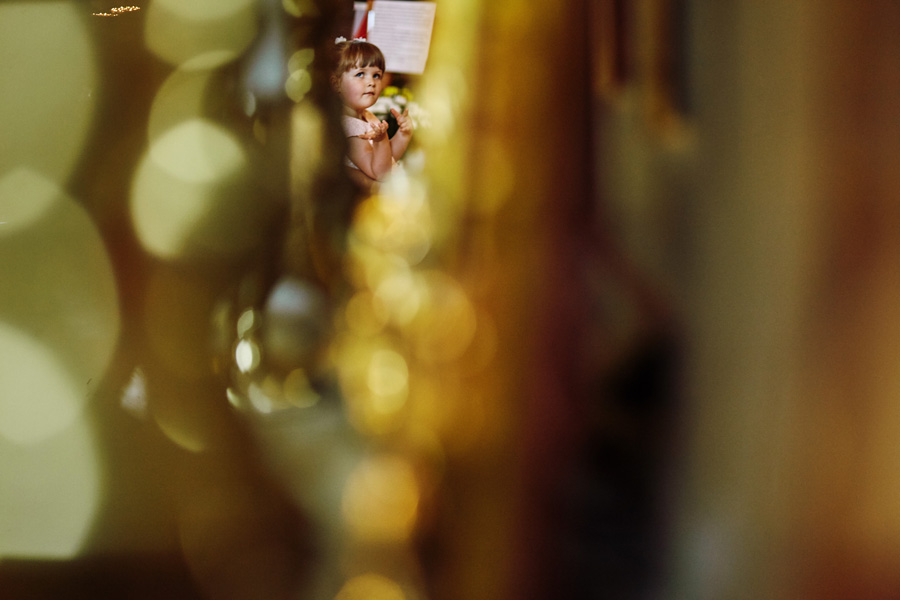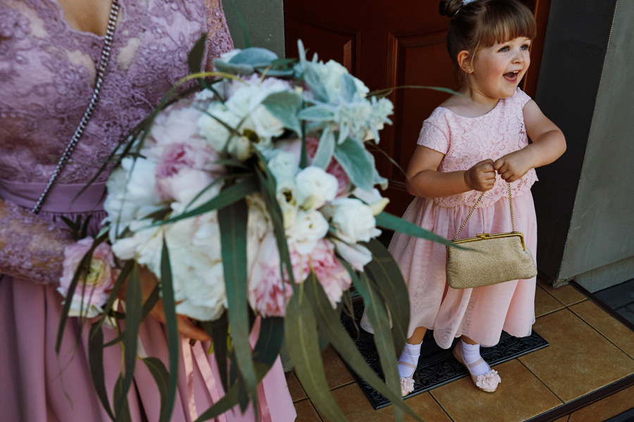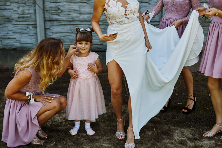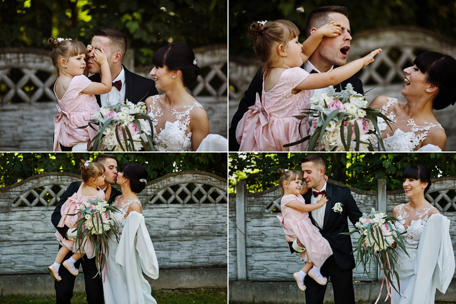 Jeśli mówimy o Paulinie i Tomku, nie możemy nie wspomnieć o Liwii, ich małej córeczce. Liwia dopełniła pastelowy orszak druhen panny młodej. Ciekawie jest obserwować, jak mała dziewczynka nagle staje się kobietą, prawdziwą damą. Koronkowa sukienka, zgrabna, mała torebka, a w rączce bułka wielkości głowy :D. Trudno oczekiwać, że mała dama wytrzyma bez marudzenia do weselnego obiadu :). Korzystając z okazji, że jest z nami Liwia, postanowiliśmy wykonać również krótką rodzinną sesję, rodzinne zdjęcia ślubne. Bardzo zabawnie było obserwować, jak córeczka rywalizuje z mamą o względy taty i wcale jej się nie podoba to, że rodzice ciągle chcą się całować :).