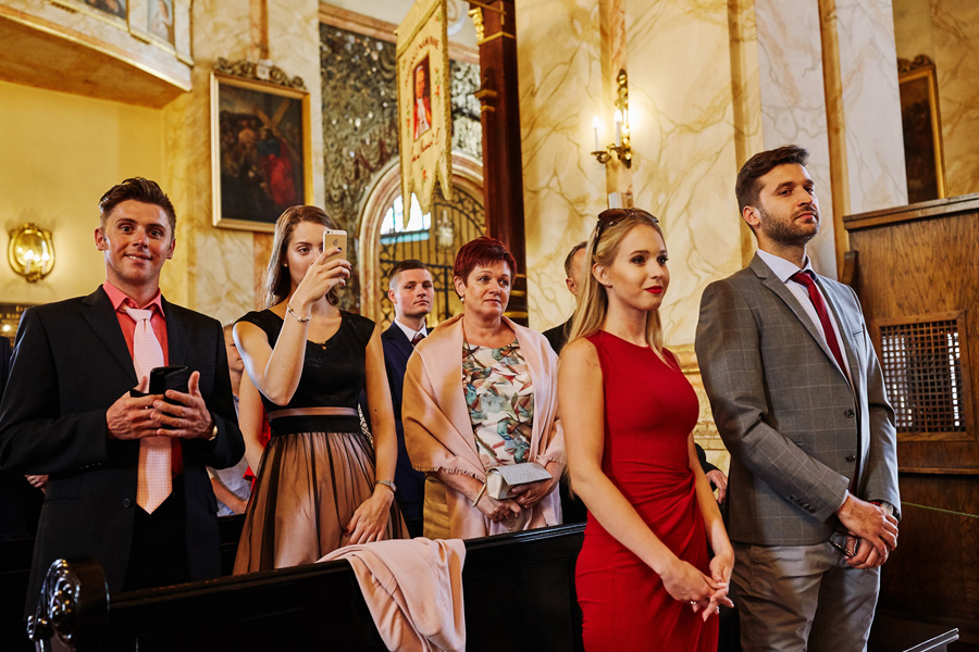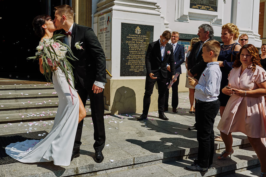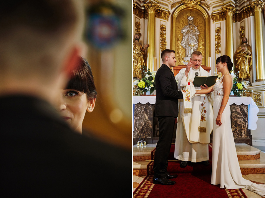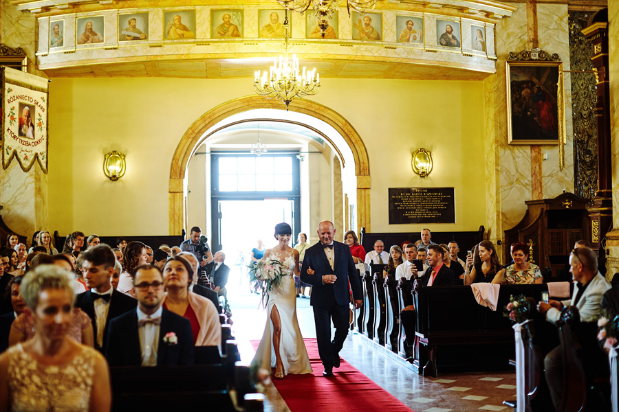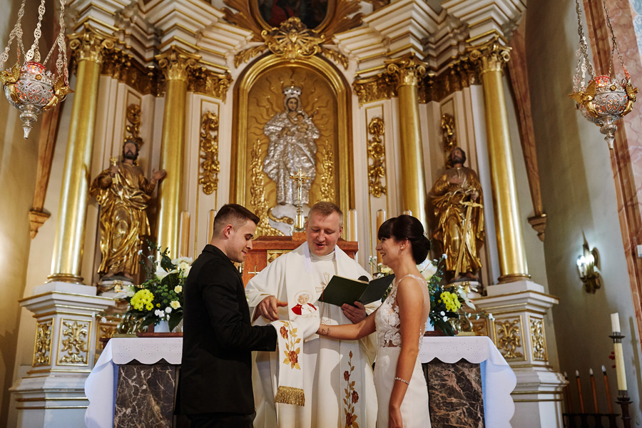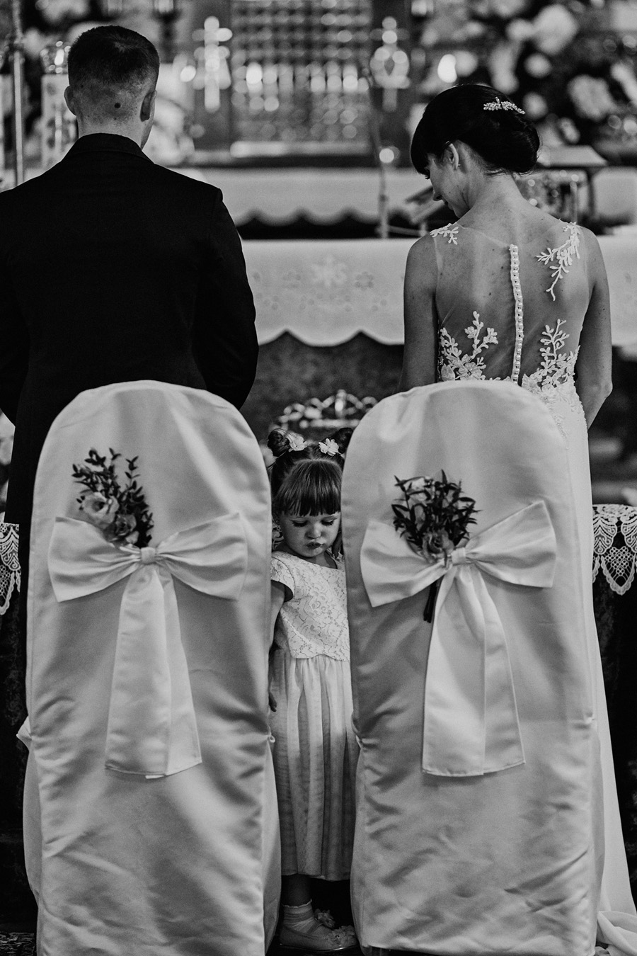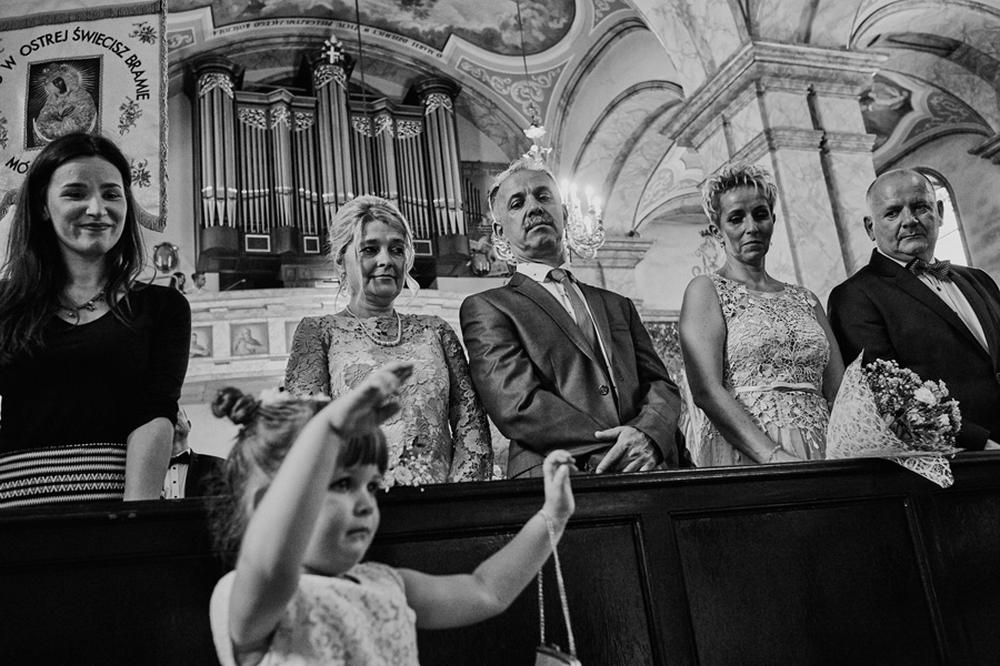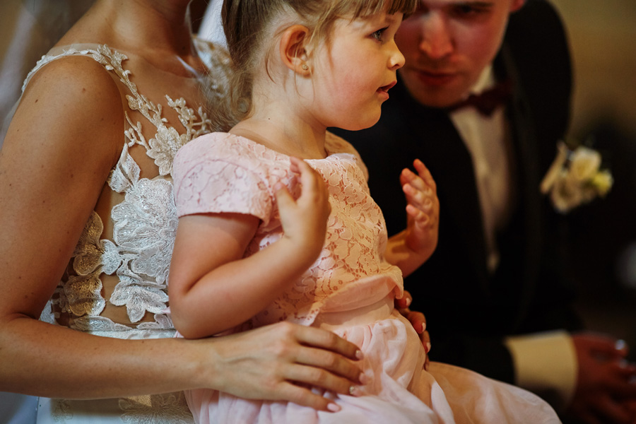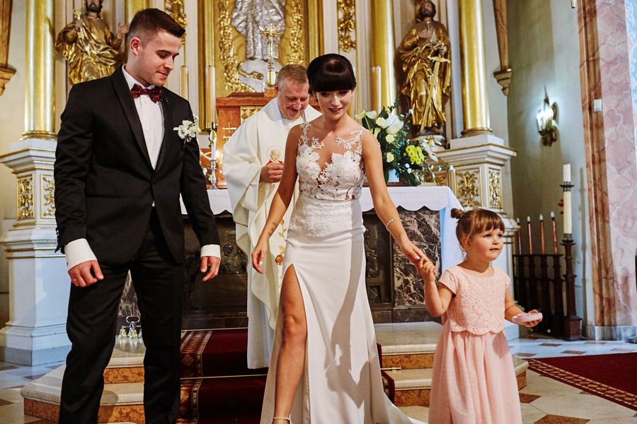 Bazylika wadowicka to przepiękny kościół, który przyciąga ogromne rzesze turystów. Chcą zobaczyć miejsce, przy którym dorastał Jan Paweł II, dotknąć jego chrzcielnicy. Na szczęście reguły tam są jasno ustalone i w ceremoniach ślubnych nic nie przeszkadza, a księża otaczają przyszłych małżonków atencją i opieką. Była to szczególna ceremonia, ze względu na udział w niej Liwii – córeczki młodej pary. To oczywiście nie jest rzadka okoliczność, że para młoda ma dzieci. Czasem młode pary obawiają się mieć przy sobie swoje pociechy i oddają je pod opiekę dziadkom. Nie ma jednak nic piękniejszego i bardziej emocjonalnego dla młodych rodziców, niż bliskość ich dzieci w tak ważnym momencie życia. Więc Liwia była blisko, siedziała na kolanach, tuliła się do rodziców, podała im obrączki ślubne. Dla nas, fotografów, to szansa na niepowtarzalne, ciepłe rodzinne ślubne zdjęcia, które będą mieć po latach największe znaczenie.