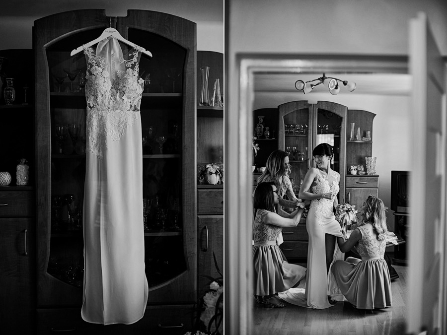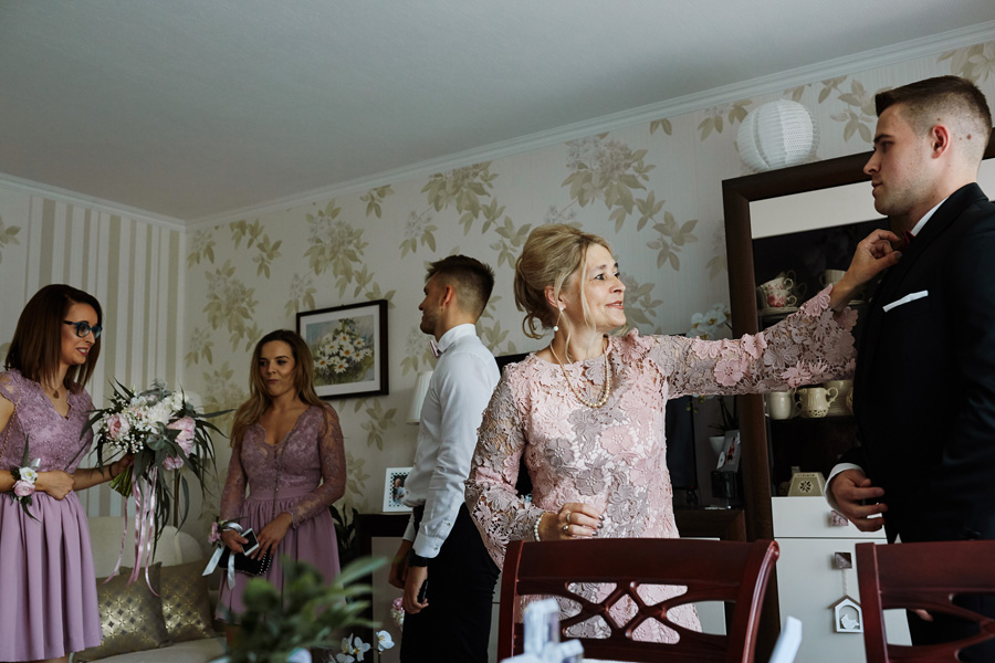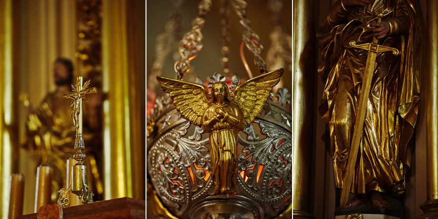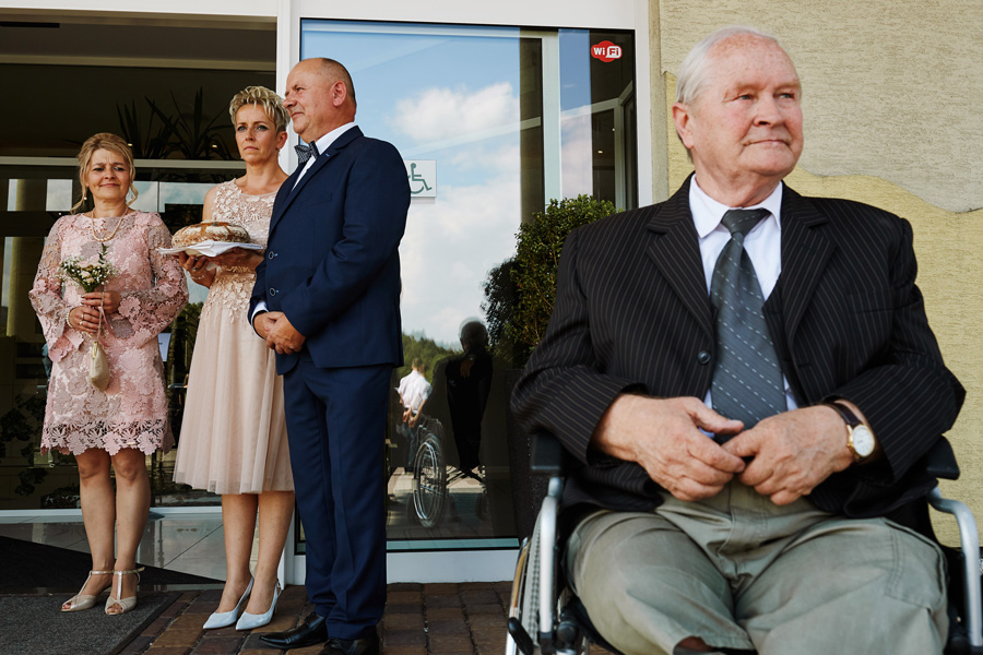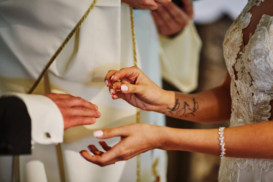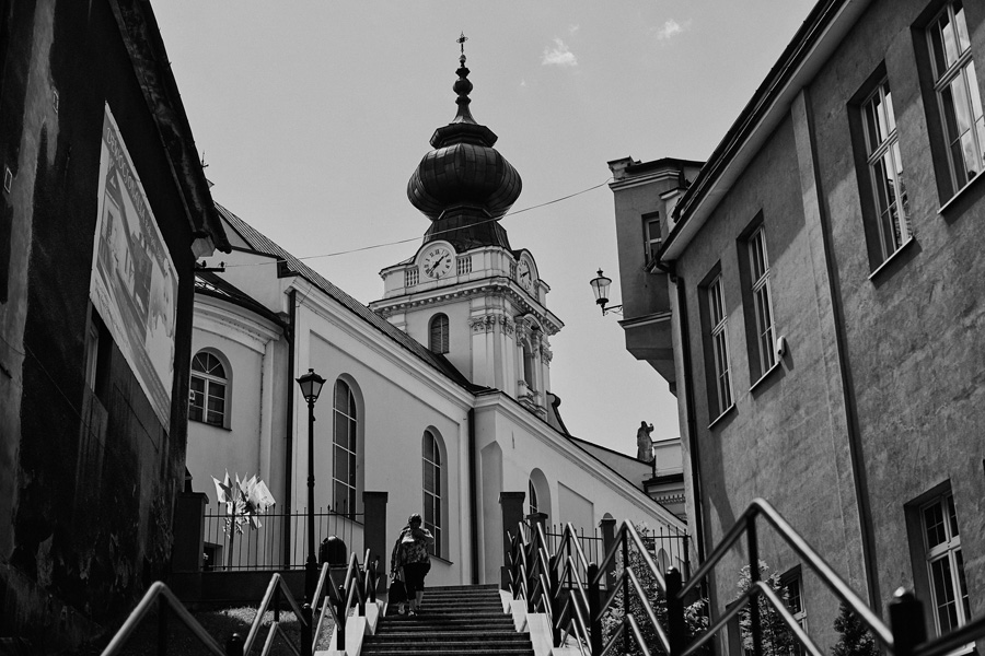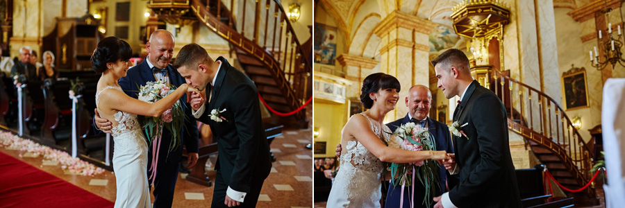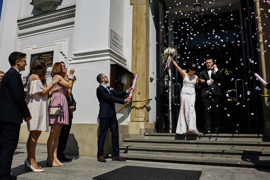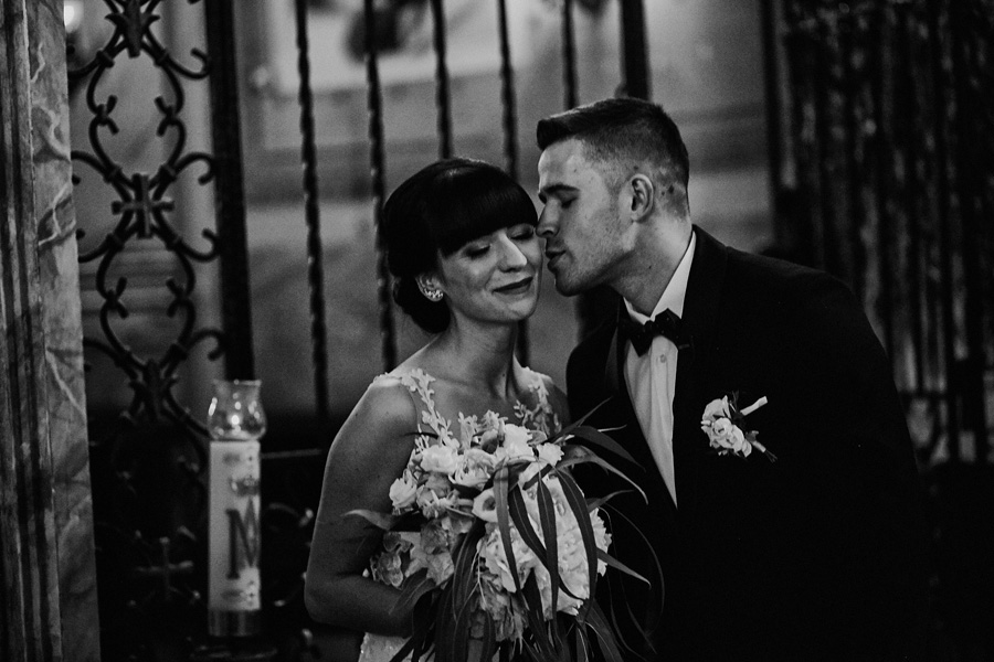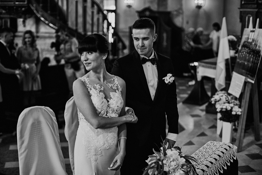 Bazylika wadowicka to przepiękny kościół, który przyciąga ogromne rzesze turystów. Chcą zobaczyć miejsce, przy którym dorastał Jan Paweł II, dotknąć jego chrzcielnicy. Na szczęście reguły tam są jasno ustalone i w ceremoniach ślubnych nic nie przeszkadza, a księża otaczają przyszłych małżonków atencją i opieką. Była to szczególna ceremonia, ze względu na udział w niej Liwii – córeczki młodej pary. To oczywiście nie jest rzadka okoliczność, że para młoda ma dzieci. Czasem młode pary obawiają się mieć przy sobie swoje pociechy i oddają je pod opiekę dziadkom. Nie ma jednak nic piękniejszego i bardziej emocjonalnego dla młodych rodziców, niż bliskość ich dzieci w tak ważnym momencie życia. Więc Liwia była blisko, siedziała na kolanach, tuliła się do rodziców, podała im obrączki ślubne. Dla nas, fotografów, to szansa na niepowtarzalne, ciepłe rodzinne ślubne zdjęcia, które będą mieć po latach największe znaczenie.