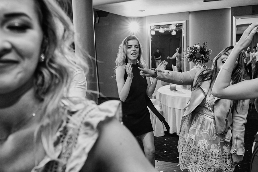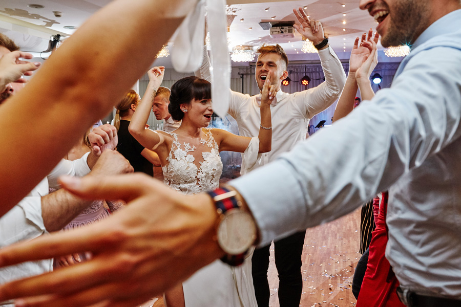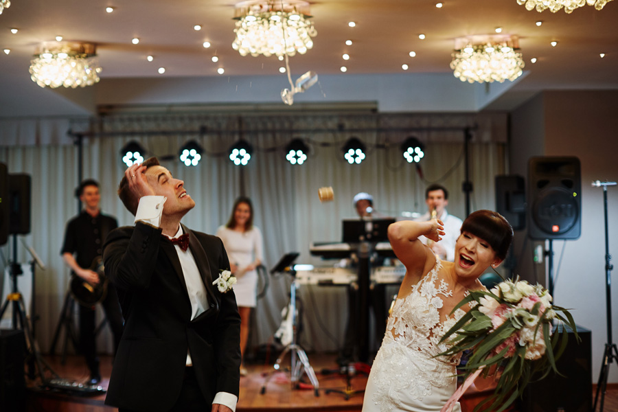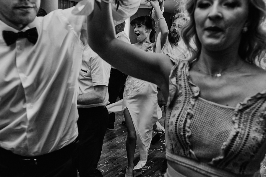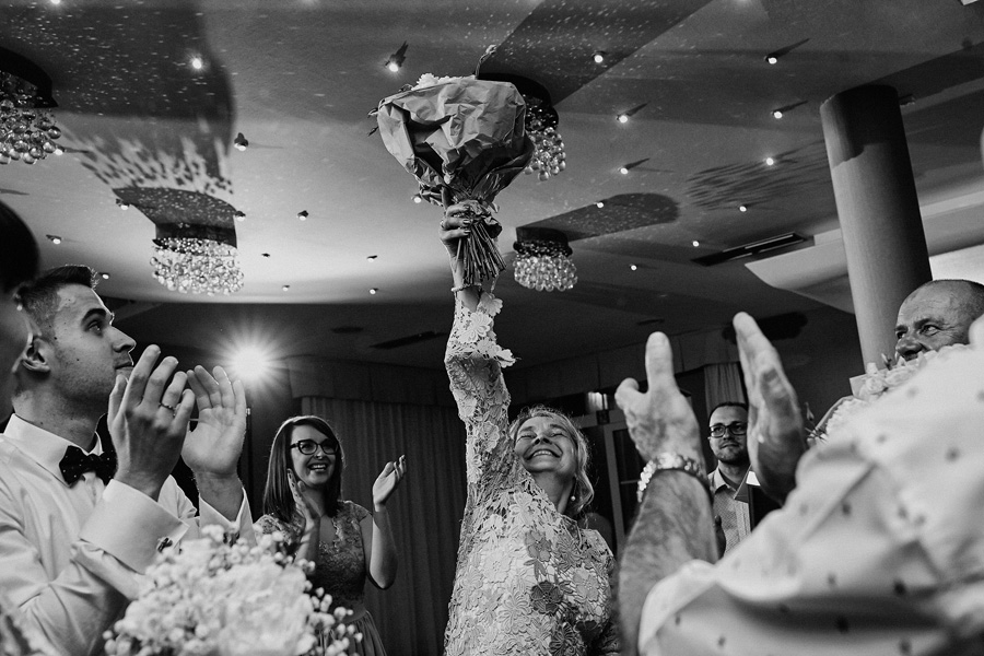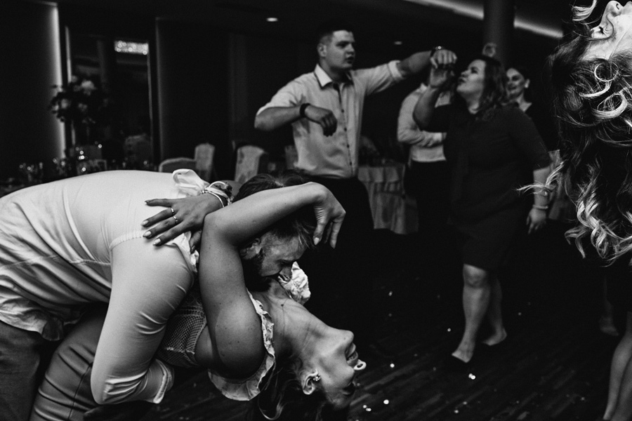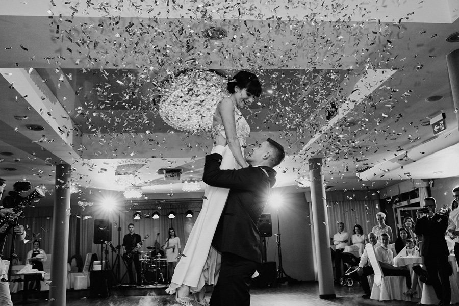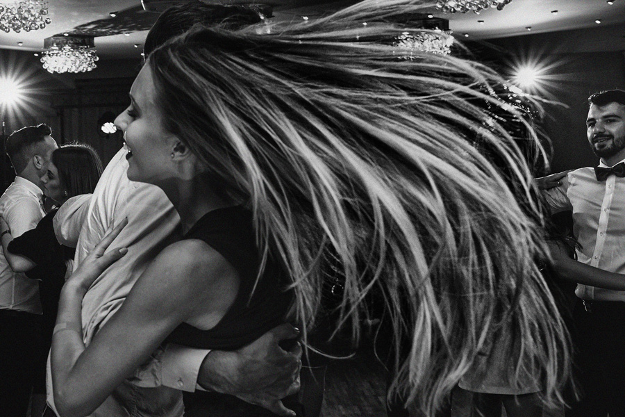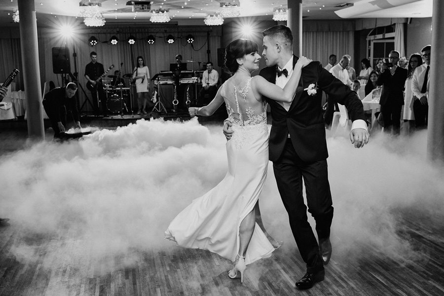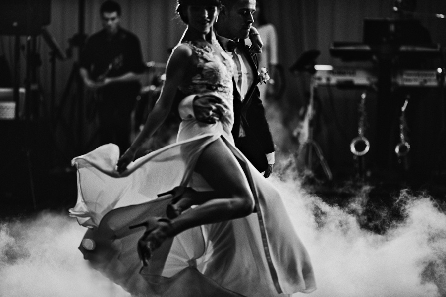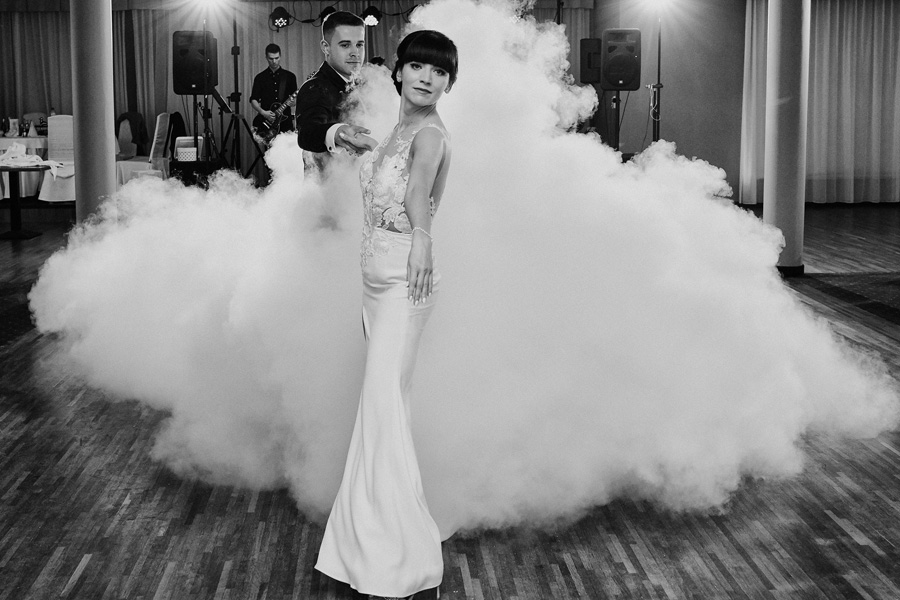 Tak piękna i wysportowana para nie mogła nie zaskoczyć gości swoim zjawiskowym pierwszym tańcem. Chmura ciężkiego dymu potęgowała jeszcze ten efekt, ale sam taniec był naprawdę filmowy. Nie wiem, kto był autorem choreografii, ale wykonał naprawdę fantastyczną robotę, bo pierwszemu tańcowi raz po raz towarzyszyły okrzyki podziwu. Paulina i Tomek zresztą przez całe wesele bawili się w taki sposób, że trudno było oderwać od nich wzrok. Jedno zdjęcie z ich wspólnego tańca zostało docenione w międzynarodowym konkursie International Society of Professional Wedding Photographers.