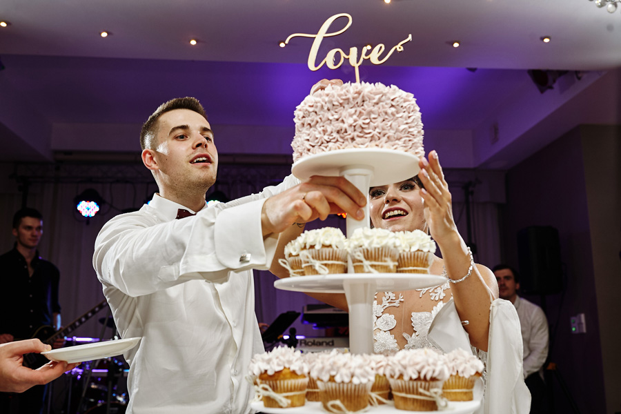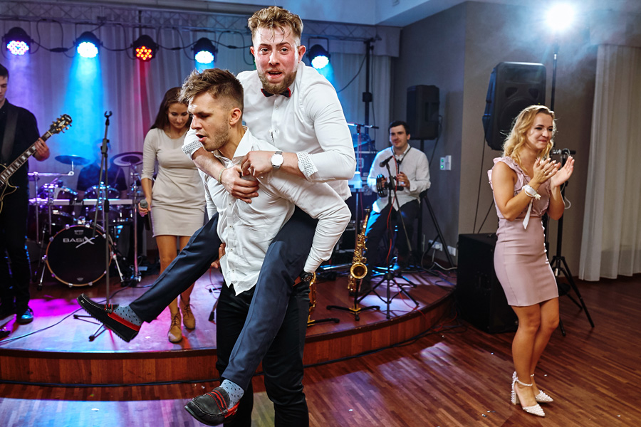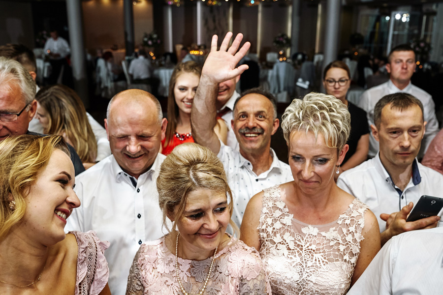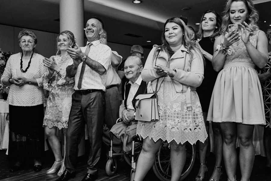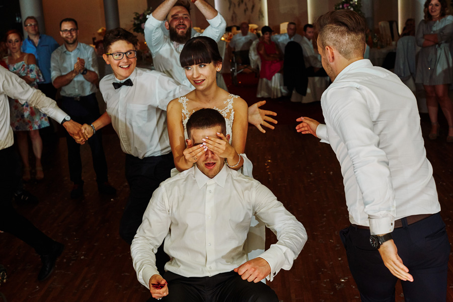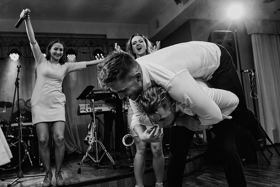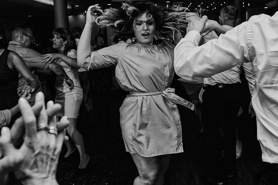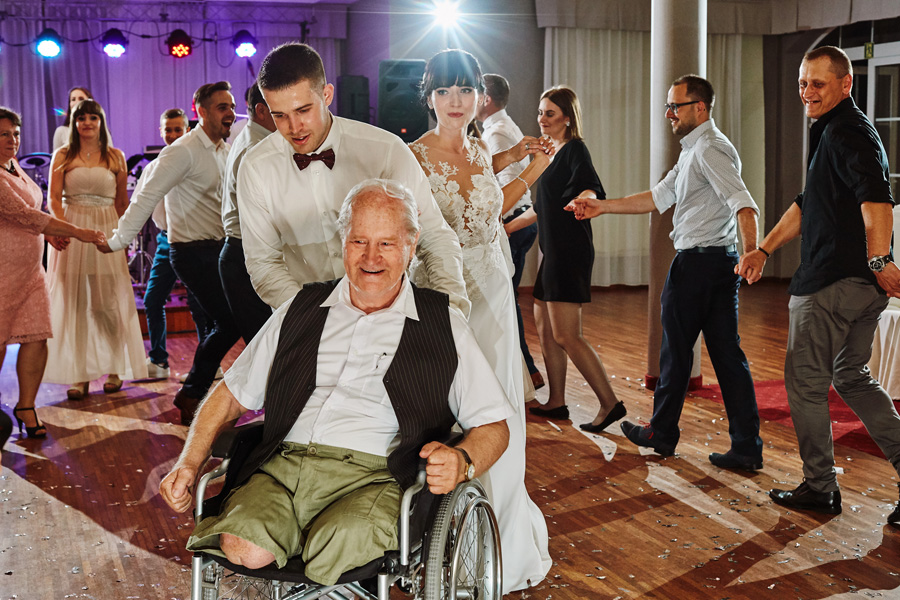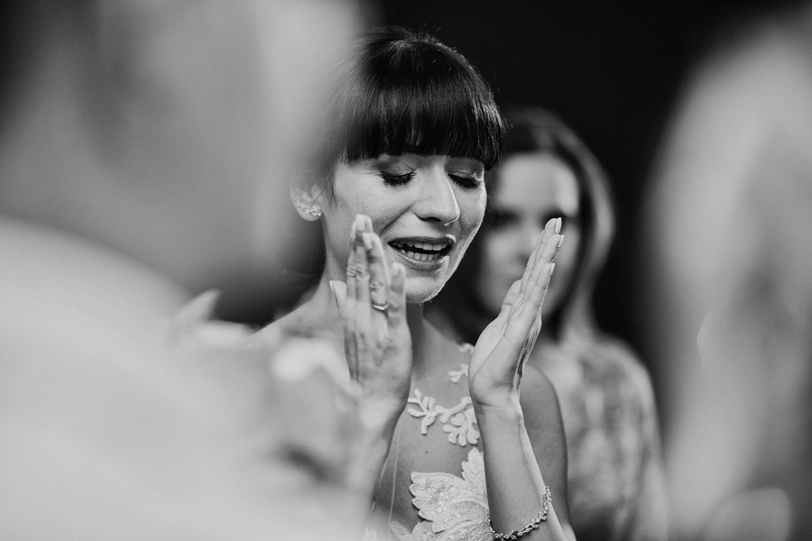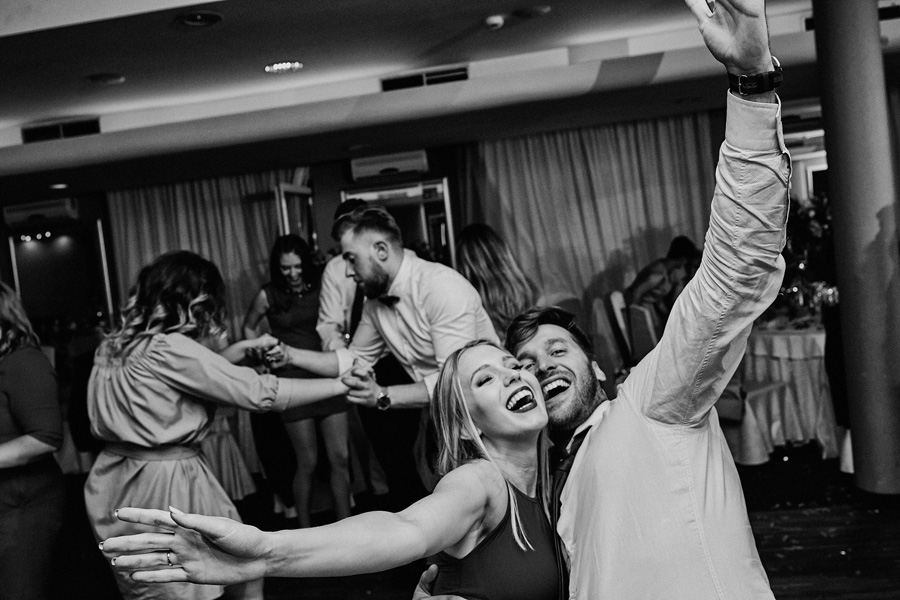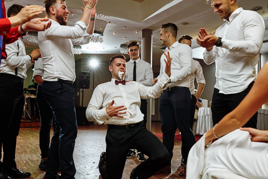 Tak piękna i wysportowana para nie mogła nie zaskoczyć gości swoim zjawiskowym pierwszym tańcem. Chmura ciężkiego dymu potęgowała jeszcze ten efekt, ale sam taniec był naprawdę filmowy. Nie wiem, kto był autorem choreografii, ale wykonał naprawdę fantastyczną robotę, bo pierwszemu tańcowi raz po raz towarzyszyły okrzyki podziwu. Paulina i Tomek zresztą przez całe wesele bawili się w taki sposób, że trudno było oderwać od nich wzrok. Jedno zdjęcie z ich wspólnego tańca zostało docenione w międzynarodowym konkursie International Society of Professional Wedding Photographers.