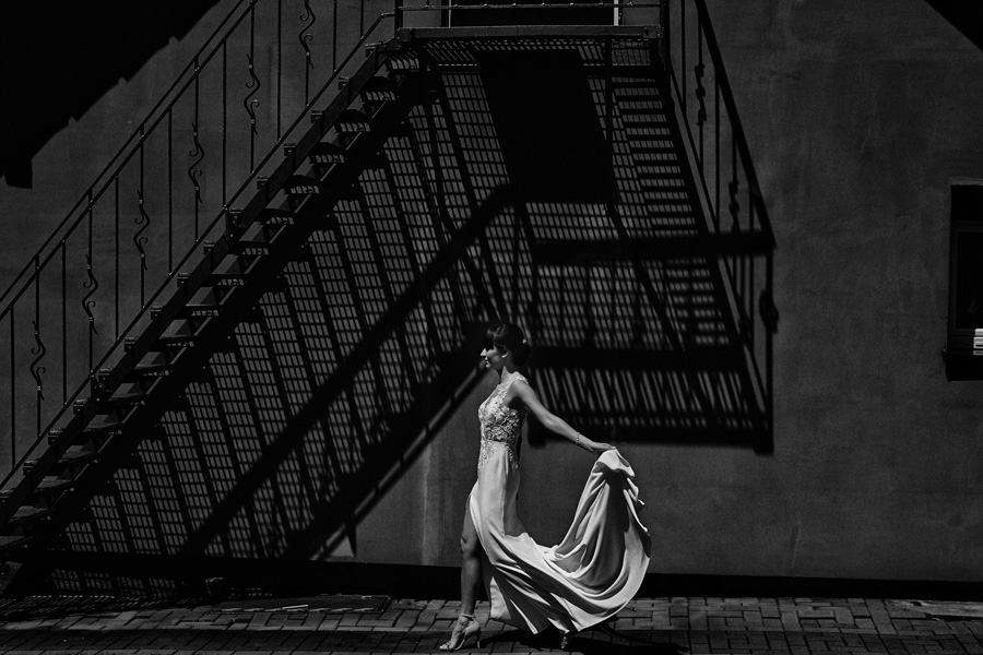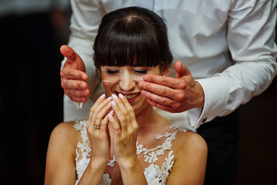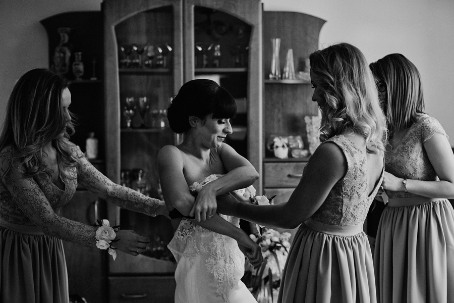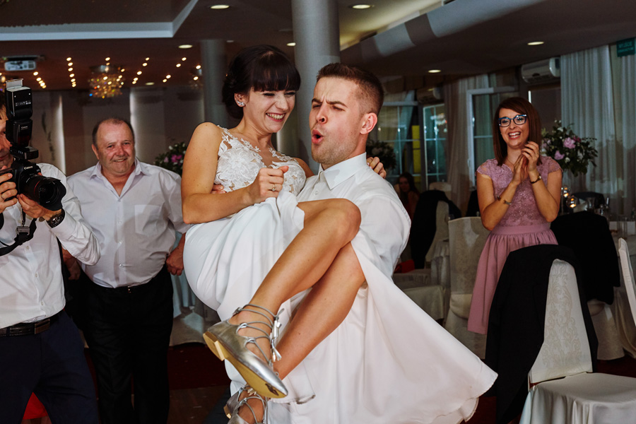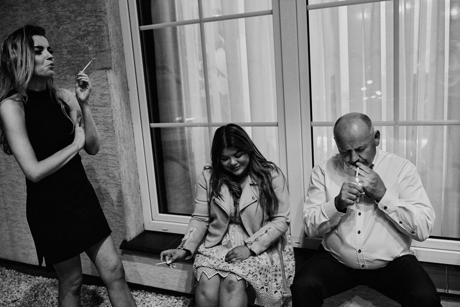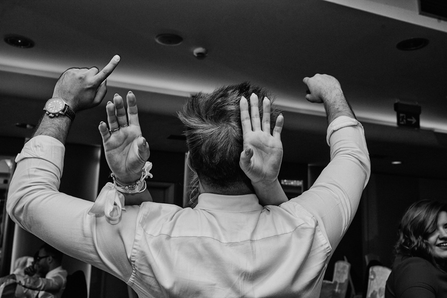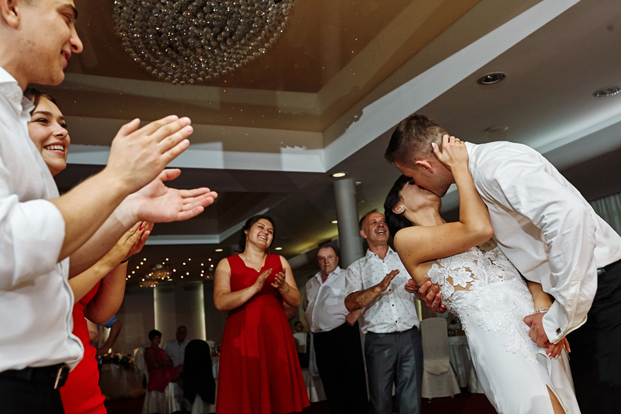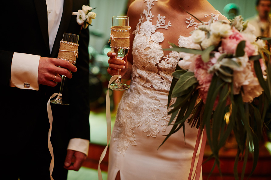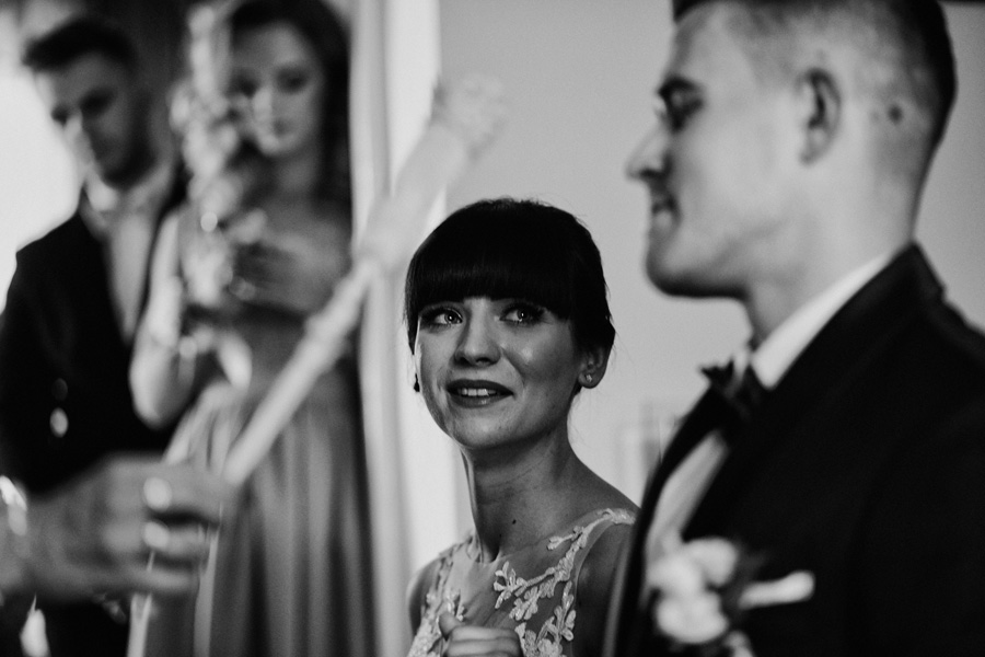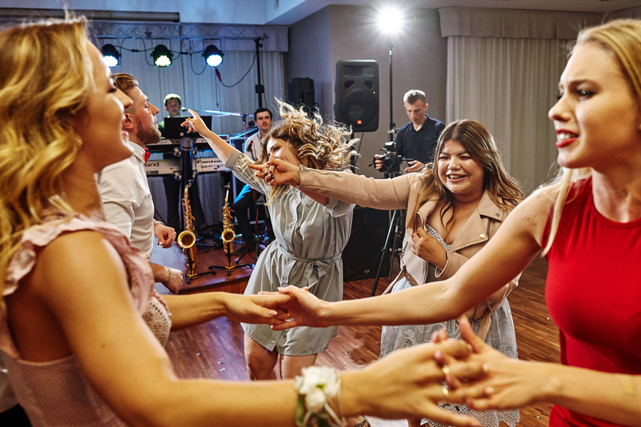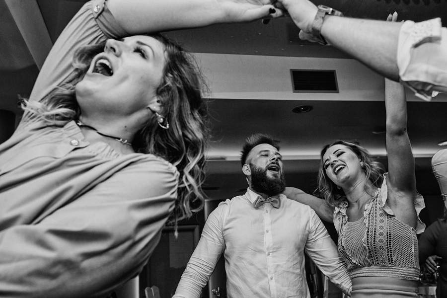 Tak piękna i wysportowana para nie mogła nie zaskoczyć gości swoim zjawiskowym pierwszym tańcem. Chmura ciężkiego dymu potęgowała jeszcze ten efekt, ale sam taniec był naprawdę filmowy. Nie wiem, kto był autorem choreografii, ale wykonał naprawdę fantastyczną robotę, bo pierwszemu tańcowi raz po raz towarzyszyły okrzyki podziwu. Paulina i Tomek zresztą przez całe wesele bawili się w taki sposób, że trudno było oderwać od nich wzrok. Jedno zdjęcie z ich wspólnego tańca zostało docenione w międzynarodowym konkursie International Society of Professional Wedding Photographers.