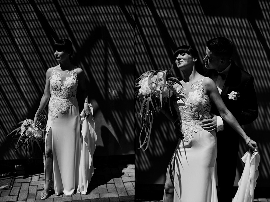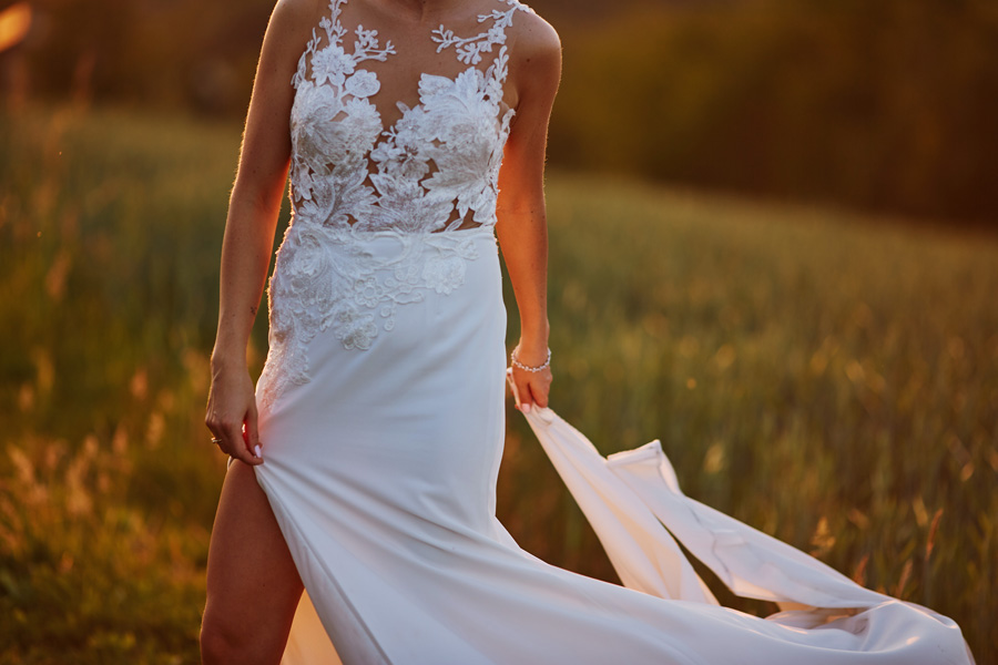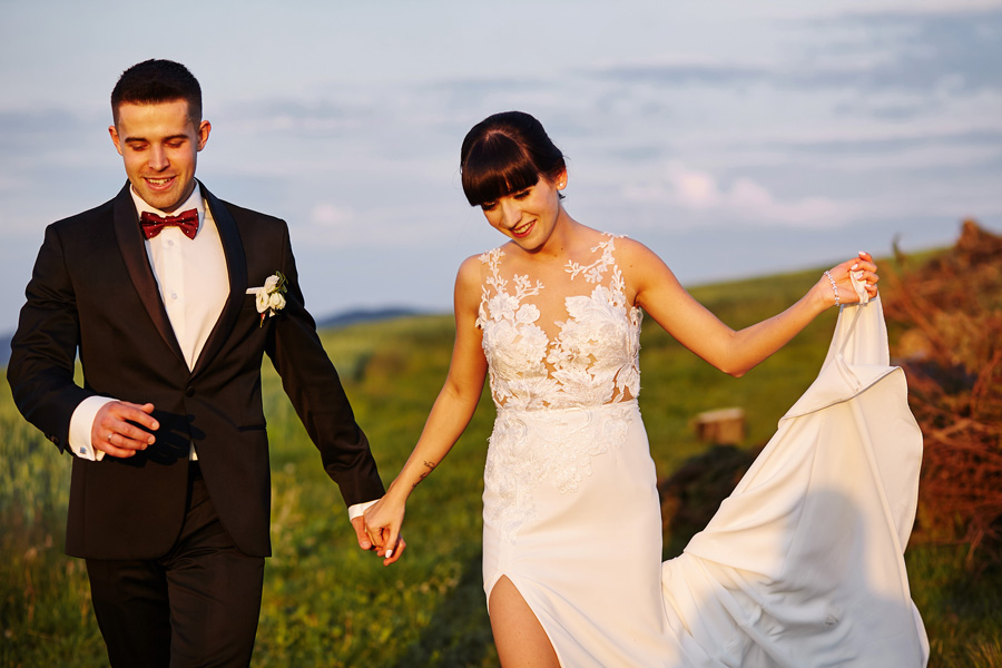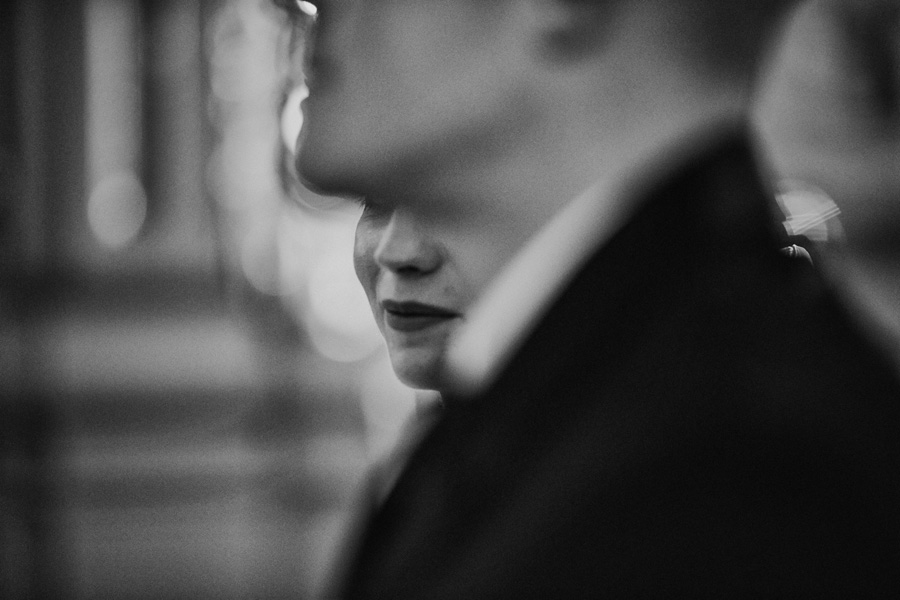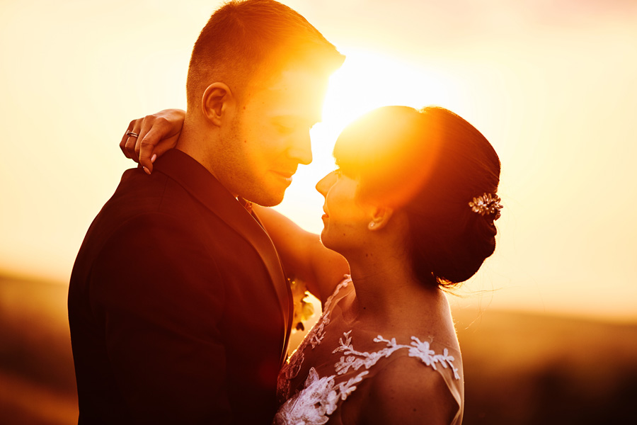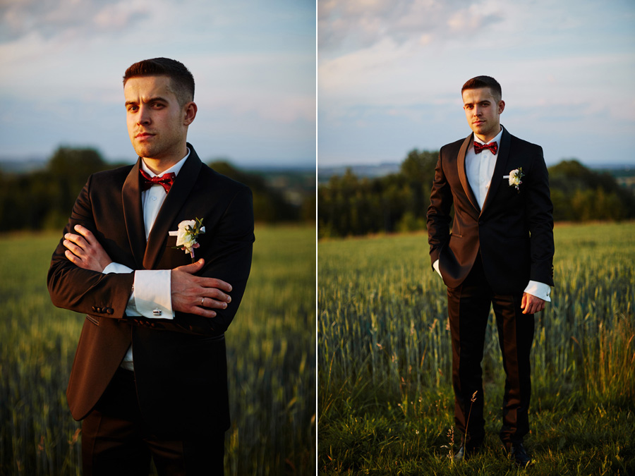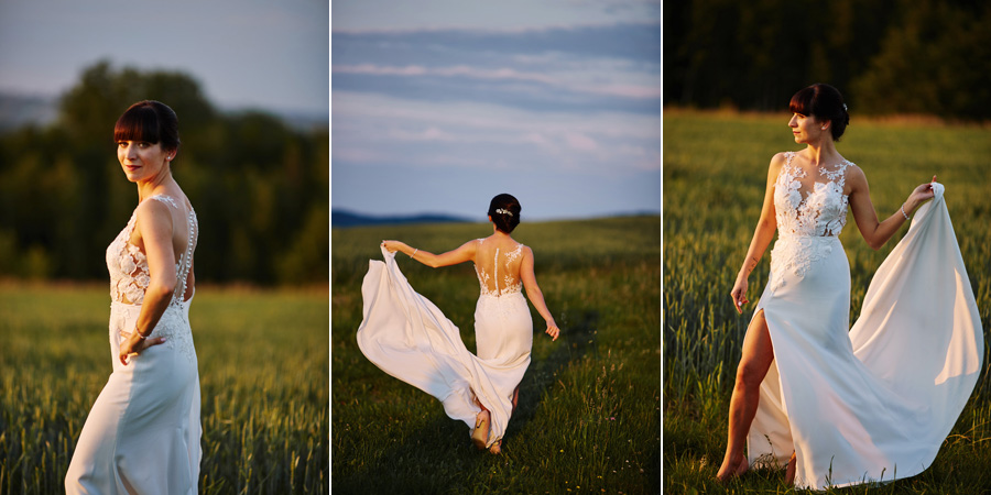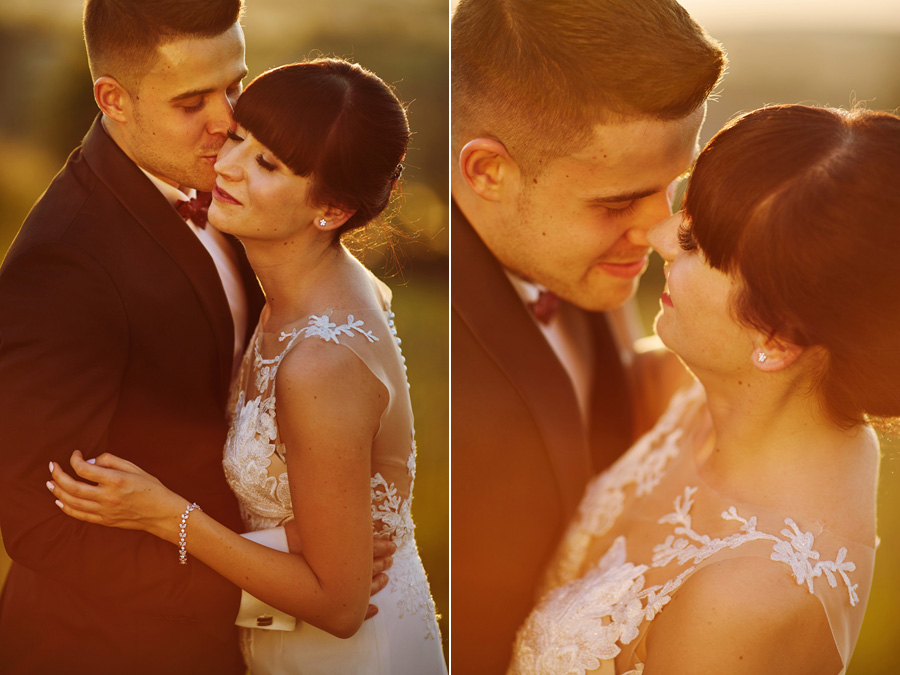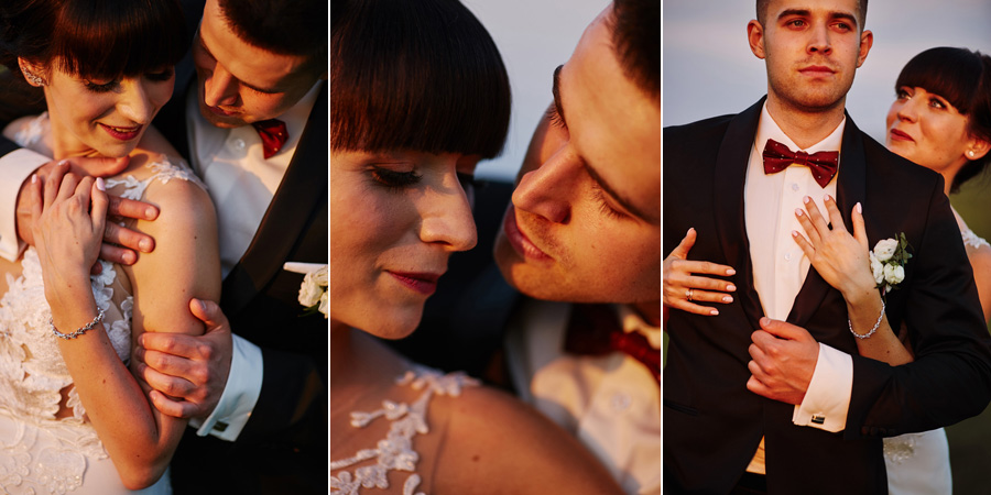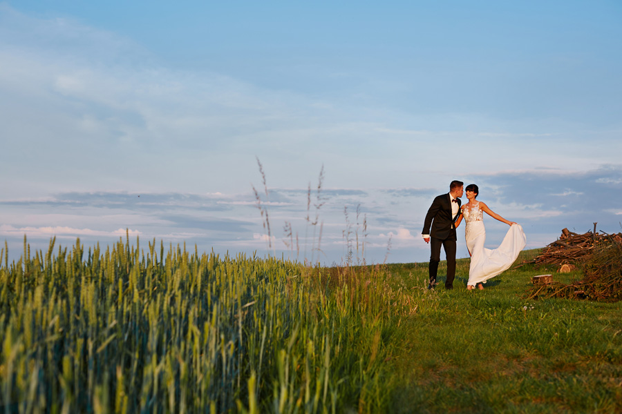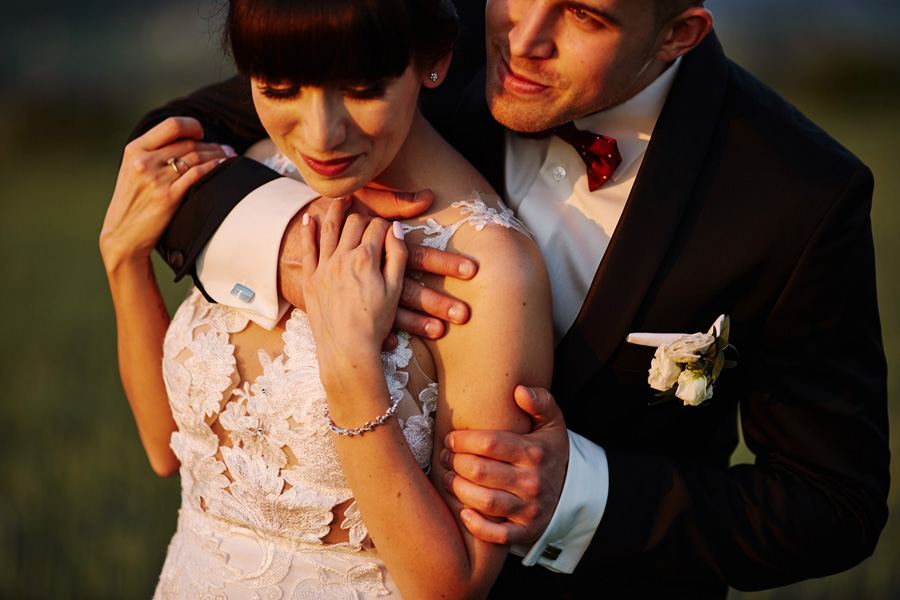 Sesja w dniu ślubu, to dla nas bardzo istotny punkt programu w czasie realizowania reportażu ślubnego. Czas trwania takiej sesji jest na tyle krótki, że warto poświęcić pół godziny na kilka portretów, których pod względem towarzyszących im emocji nie zastąpi żadna sesja innego dnia. Paulinie i Tomkowi znakomicie dopisała pogoda, niemniej jednak nawet jeśli nie ma tak sprzyjających warunków atmosferycznych, to i tak jesteśmy w stanie zaaranżować kawałek przestrzeni do krótkiej sesji portretowej. To jest bardzo ważne, dlatego że wtedy faktycznie każdy gest, każdy uśmiech niesie ze sobą podwójne znaczenie. Jest jeszcze jeden istotny czynnik. Taka sesja to moment, kiedy faktycznie można dać ujście emocjom. Weselny gwar już też się rozpoczął i będzie nabierał intensywności. Wtedy potrzebna jest ta chwila dla nich. Moment niepohamowanej radości, wielkiej ulgi i wspólnego zatopienia się w ciszy, schowania w ramionach ukochanego.