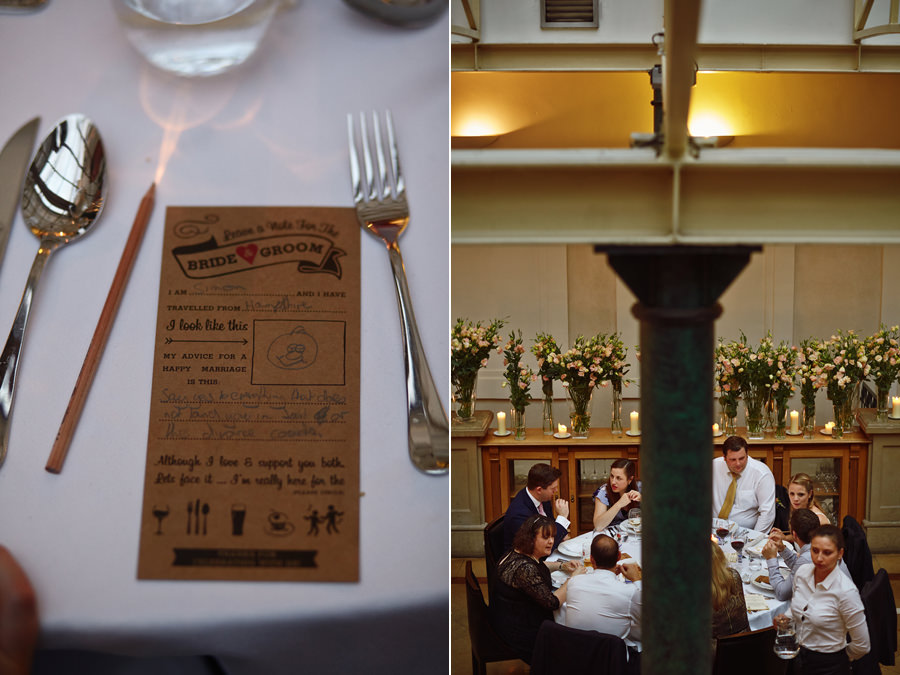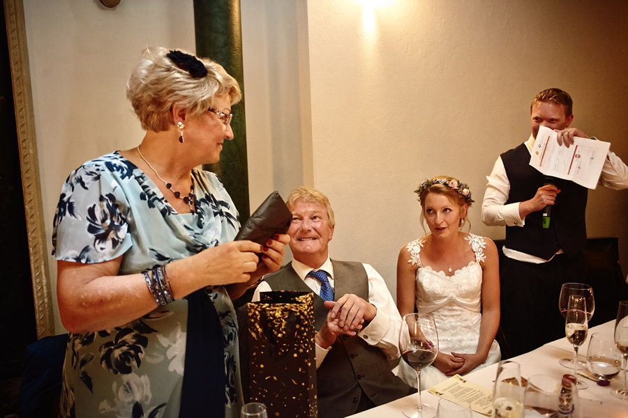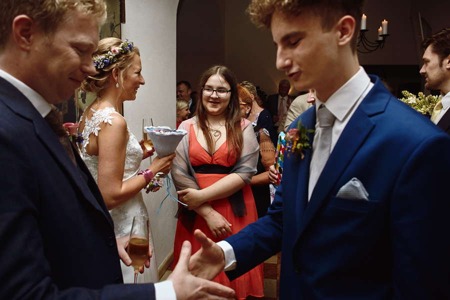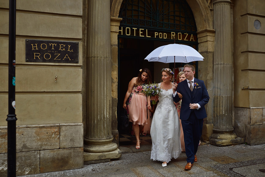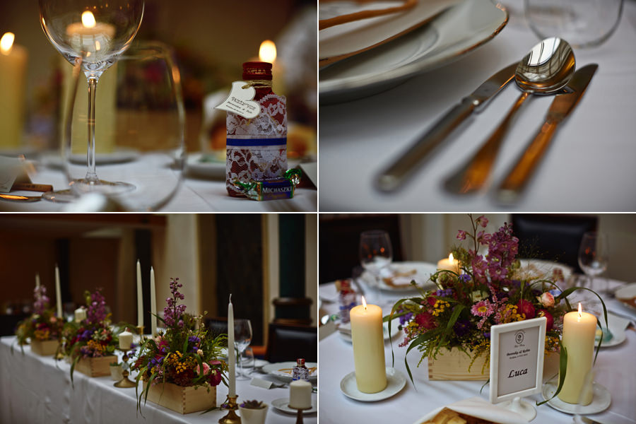 Jeśli tylko ma się trochę czasu i inwencji, wówczas różne dekoracje ślubne czy upominki dla gości weselnych można przygotować samemu. Czasem jest to też świetne lekarstwo na przedślubne ADHD :). A przede wszystkim jest to doskonały sposób na oszczędności. Po pierwsze więc para młoda wybrała na wesele takie miejsce, które jest samo w sobie piękne i architektonicznie ciekawe. Był to stylowy, zabytkowy Hotel pod Różą. Warto zwrócić uwagę na jego piękny przeszklony dach, metalowe filary i ozdobne balustrady w części stołowej. Natomiast część taneczna znajdowała się w ceglanym podpiwniczeniu. Takiemu miejscu wystarczy delikatne kwiatowe dopełnienie i całość wygląda pięknie. Dekoracjami kwiatowymi zajęła się Eva Klimek. Po drugie w ramach upominków dla gości para młoda przygotowała piersiówki z wiśniówką. Przystroili je delikatną koronką i etykietą z podziękowaniem. Po trzecie wreszcie, nawet suknia ślubna i suknie druhen nosiły na sobie ślady przeróbek według pomysłów Bereniki.