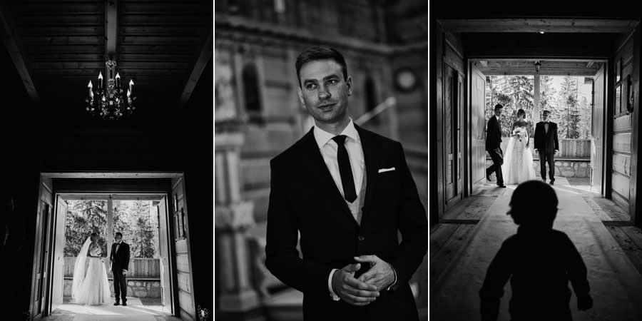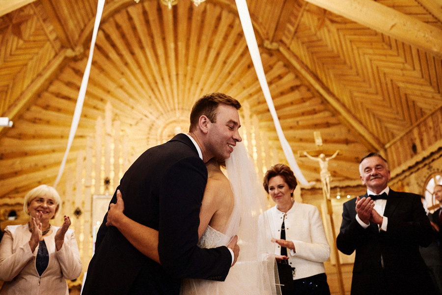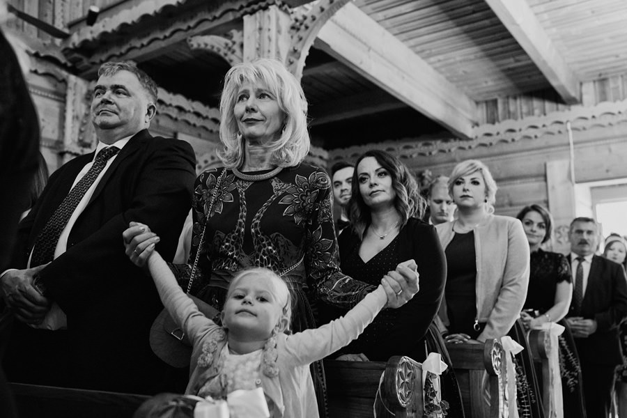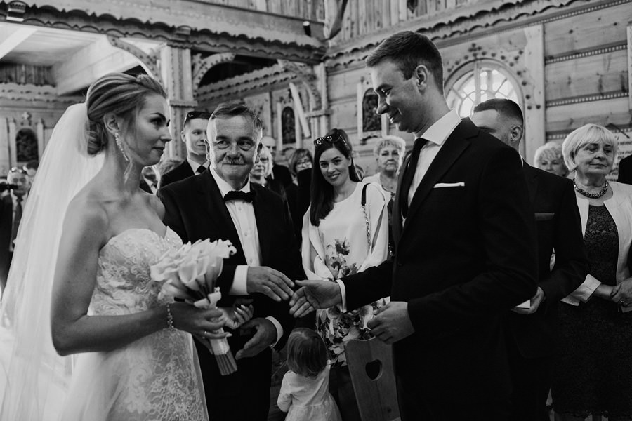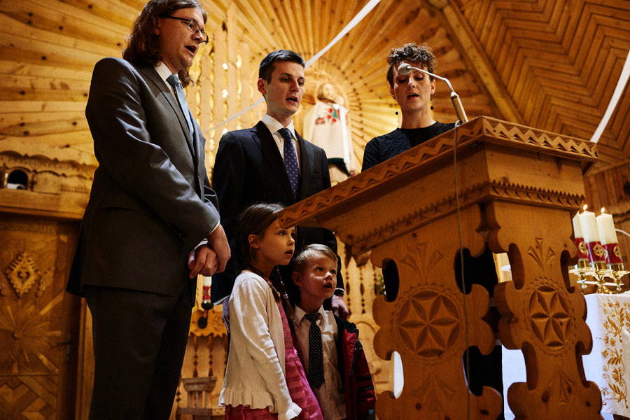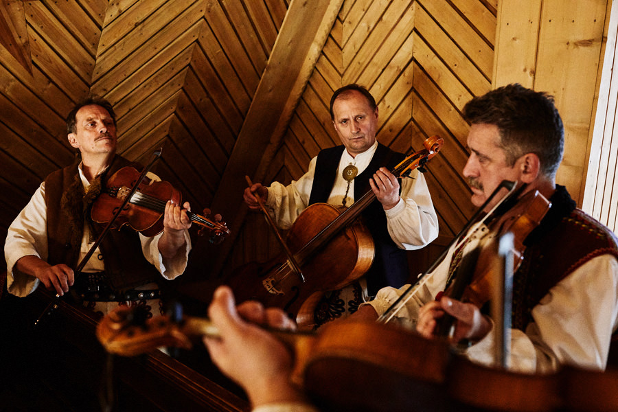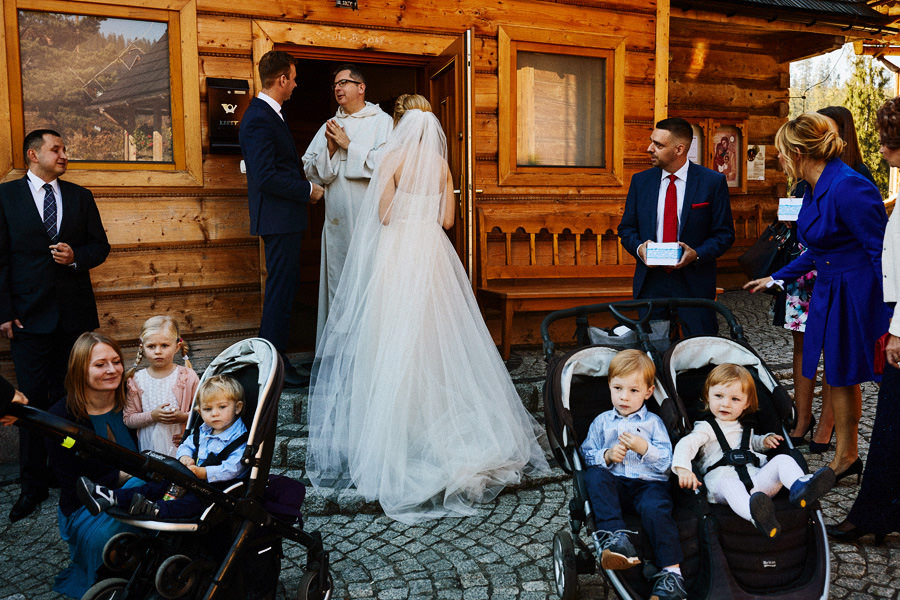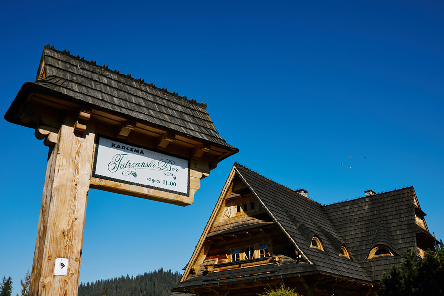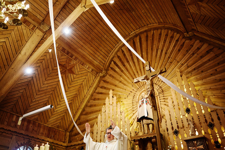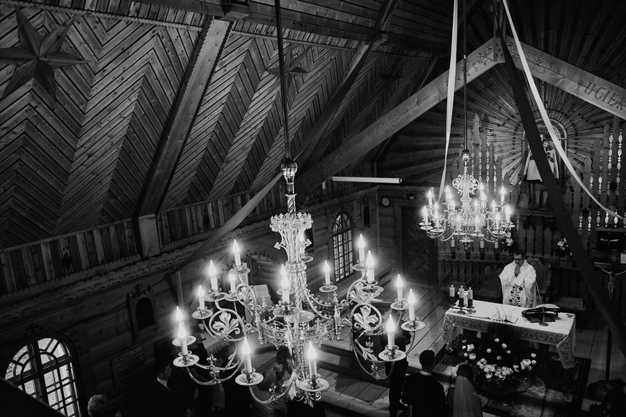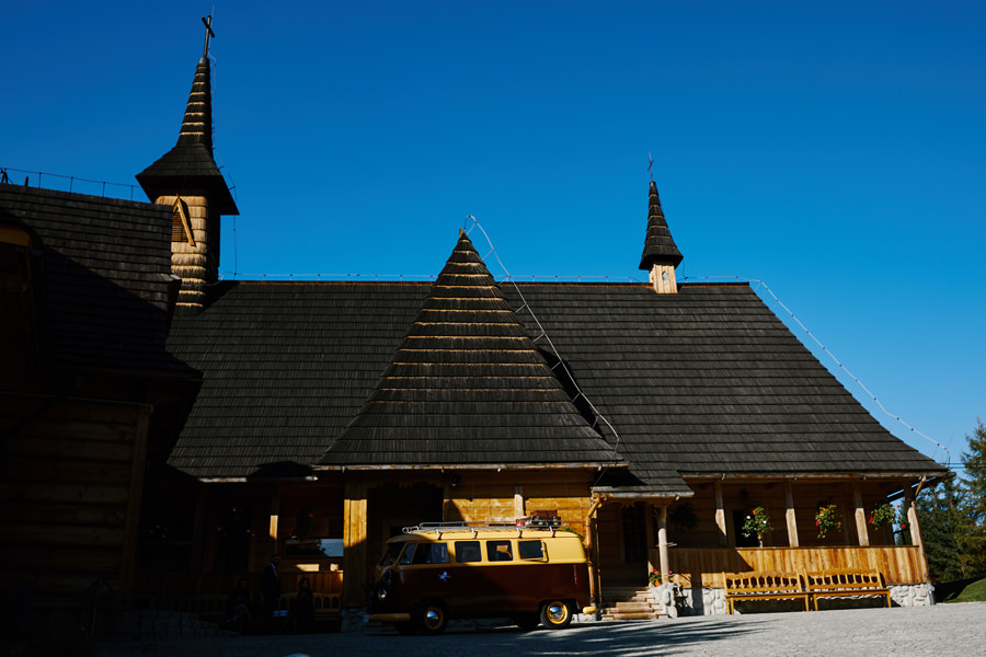 Podhalańska zabudowa jest dość rozmaita, natomiast z pewnością łatwo jest zachować spójność stylistyczną, jeśli planuje się ślub i wesele w tych okolicach. Nasza para zdecydowała się wziąć ślub w maleńkim, pięknym, drewnianym kościółku – prowadzonym przez ojców Dominikanów. Przyjęto ich tam z niezwykłą życzliwością. Dzięki temu ślub był pełen emocji, a góralska architektura stanowiła miłe oku tło do zdjęć.