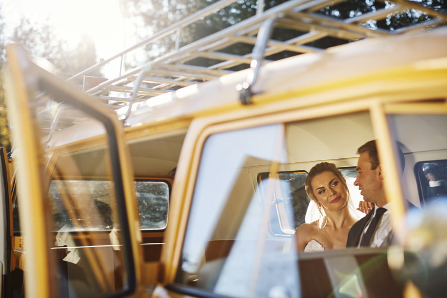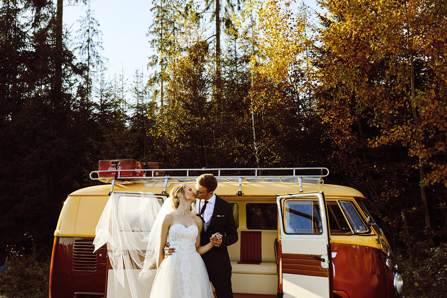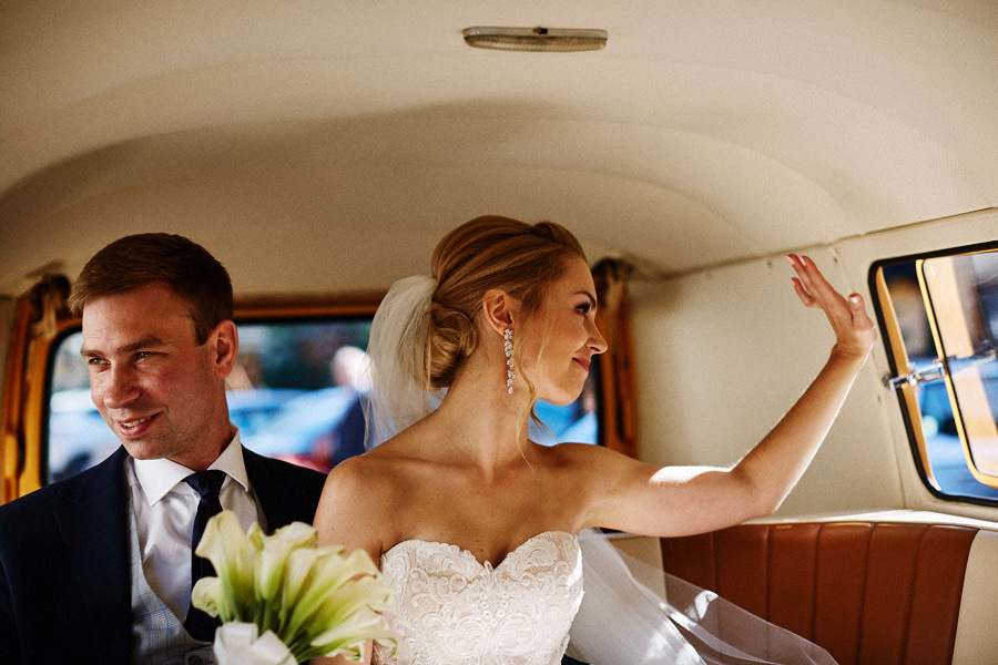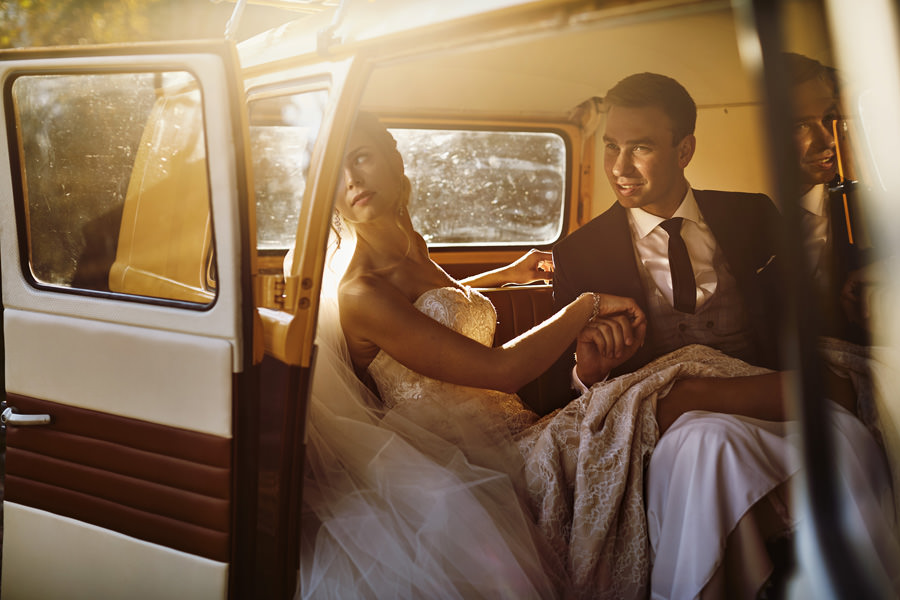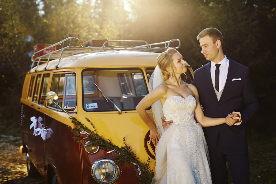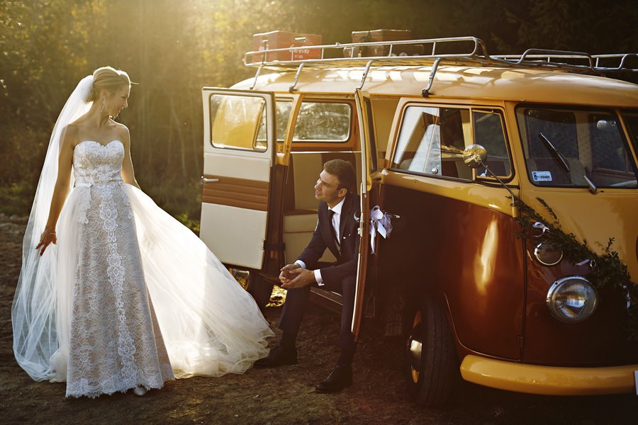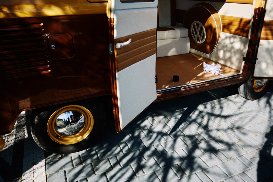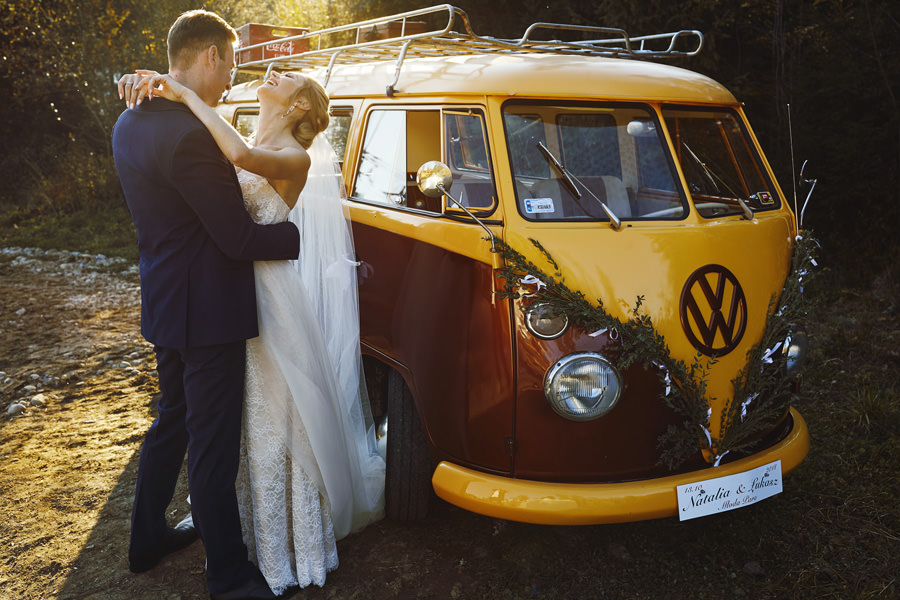 Październik to krótsze dni – to również jedna z obaw, które wymieniają pary młode, rozważające jesienny ślub i wesele. Z perspektywy fotografa, jest to w zasadzie najlepsze światło, jakie spotyka się w ciągu roku. Słońce jest niżej nad horyzontem, przez co boczne, modelujące światło towarzyszy nam przez cały dzień. Nie ma właściwie takich momentów, w których światło na zewnątrz byłoby niesprzyjające. Dodatkowo – tuż po ceremonii (jeśli jest ona w okolicy godziny 15.00/16.00) – słońce jest już na tyle nisko, że można złapać go w tak zwaną kontrę i zaczyna dawać cudowną, mleczną poświatę. Zdjęcia są wtedy dosłownie zalane słońcem – uwielbiamy ten efekt. Temat sesji w ślubu Natalia i Łukasz dodatkowo nam ułatwili wynajmując rozkosznego bulika, którym pojechali do ślubu i na wesele. Autko również było w kolorach jesieni. Sesja w dniu ślubu została zrealizowana między ceremonią a weselem i trwała około 20 minut :).