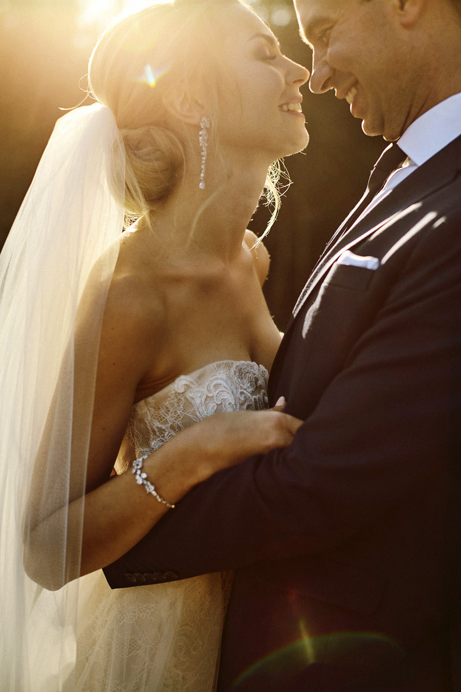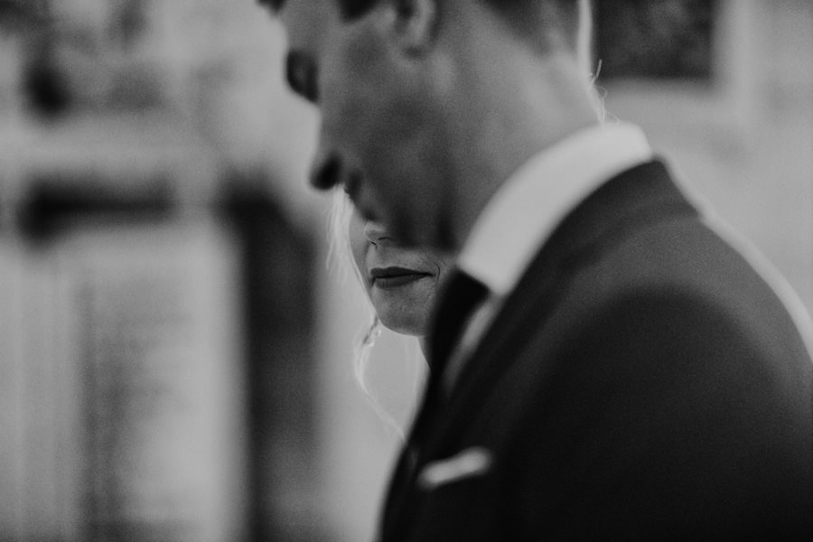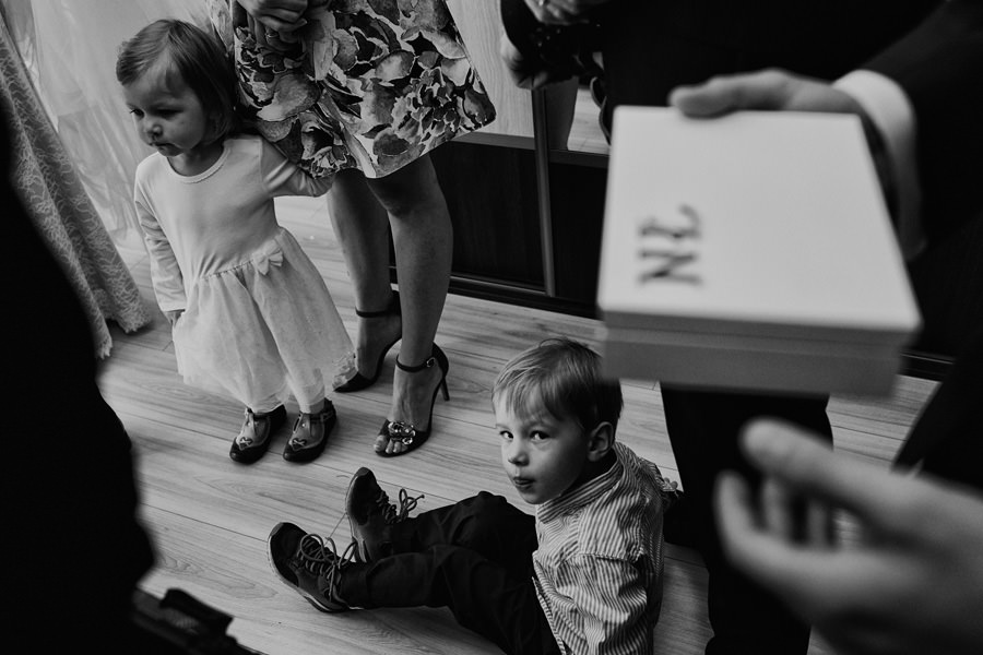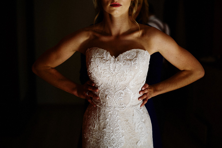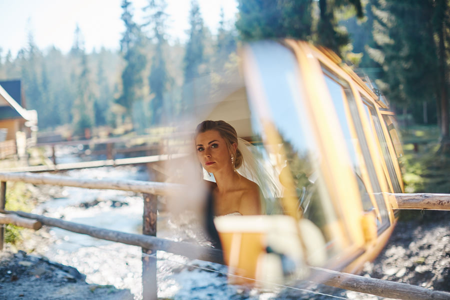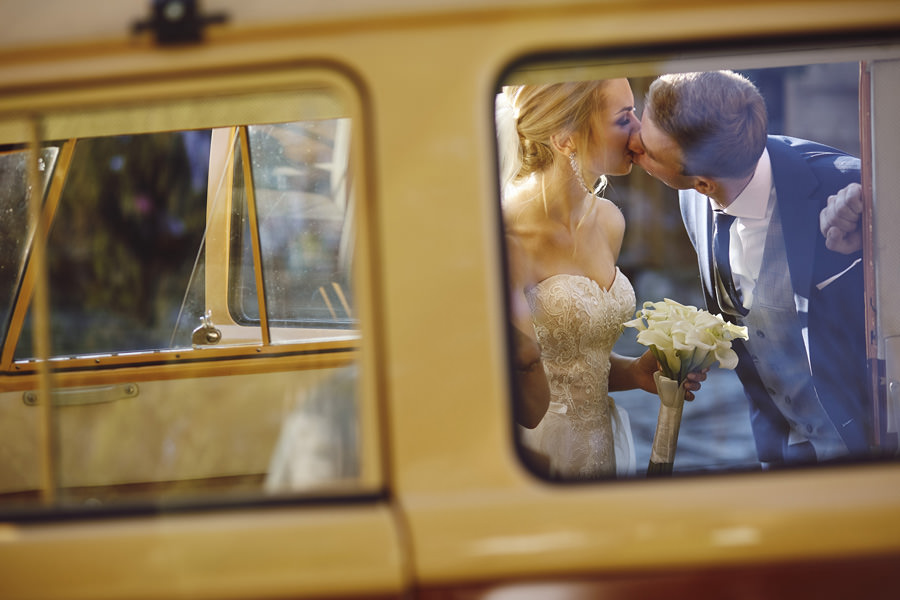 Październik to krótsze dni – to również jedna z obaw, które wymieniają pary młode, rozważające jesienny ślub i wesele. Z perspektywy fotografa, jest to w zasadzie najlepsze światło, jakie spotyka się w ciągu roku. Słońce jest niżej nad horyzontem, przez co boczne, modelujące światło towarzyszy nam przez cały dzień. Nie ma właściwie takich momentów, w których światło na zewnątrz byłoby niesprzyjające. Dodatkowo – tuż po ceremonii (jeśli jest ona w okolicy godziny 15.00/16.00) – słońce jest już na tyle nisko, że można złapać go w tak zwaną kontrę i zaczyna dawać cudowną, mleczną poświatę. Zdjęcia są wtedy dosłownie zalane słońcem – uwielbiamy ten efekt. Temat sesji w ślubu Natalia i Łukasz dodatkowo nam ułatwili wynajmując rozkosznego bulika, którym pojechali do ślubu i na wesele. Autko również było w kolorach jesieni. Sesja w dniu ślubu została zrealizowana między ceremonią a weselem i trwała około 20 minut :).