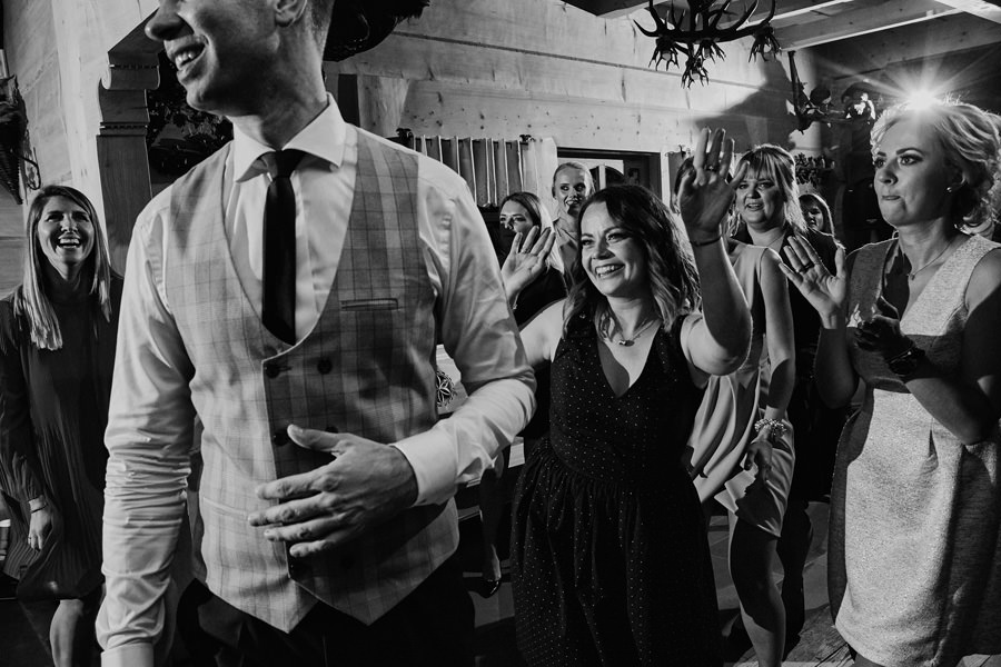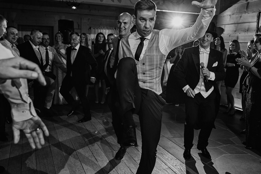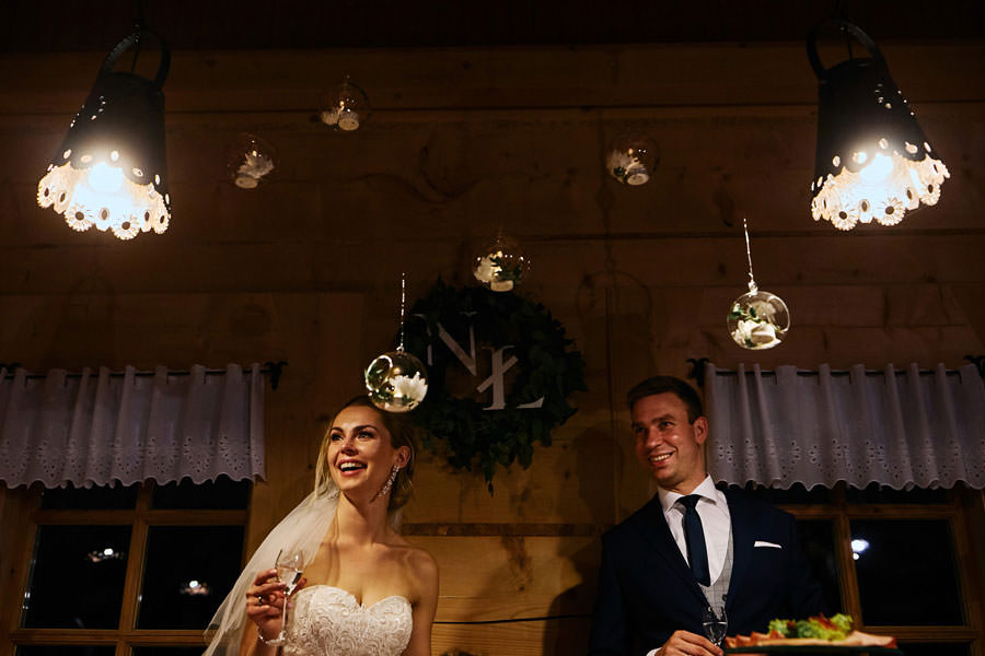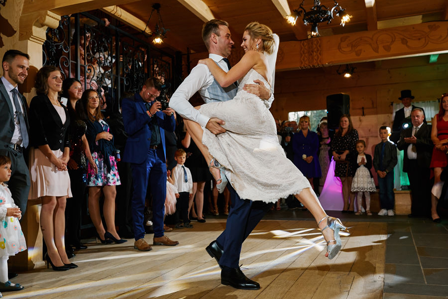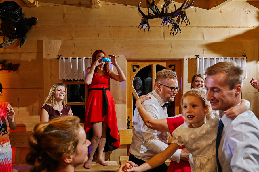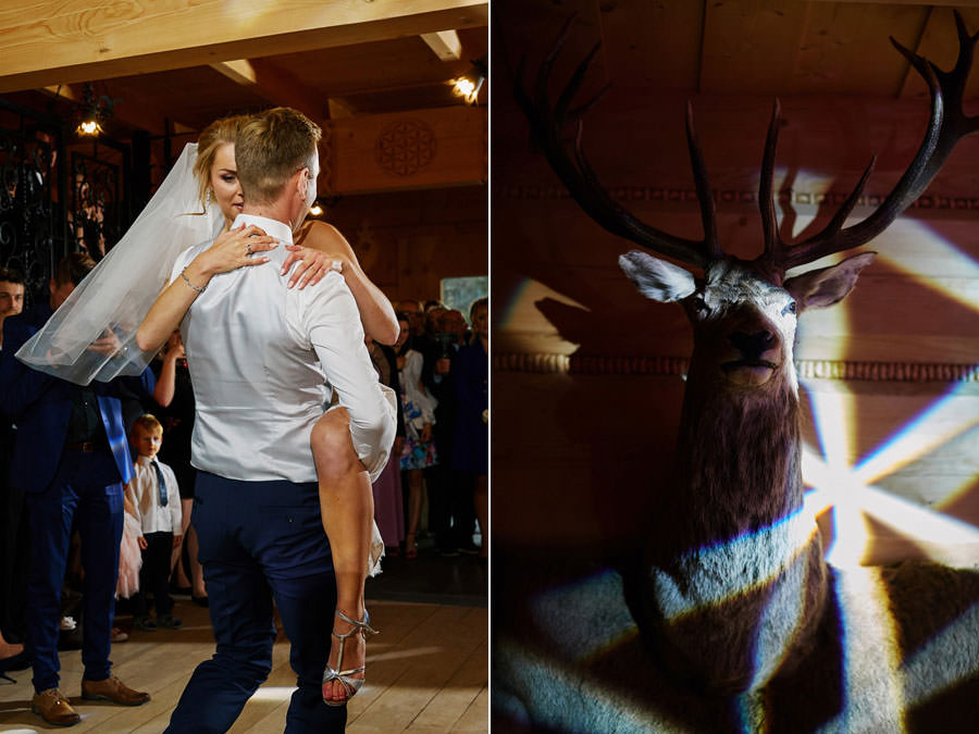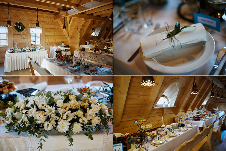 Jeśli chodzi o miejsce wesela – wybór padł na karczmę Tatrzański Bór. Drewniana zabudowa, piękne zdobienia, liczne akcenty myśliwsko-łowieckie – podkreślały górski klimat całego wesela. Do tego delikatne, dopasowane dekoracje, świetna kuchnia i przemiła obsługa lokalu przyczyniła się do tego, że wspominamy to wesele z ogromnym sentymentem. Parkiet był stosunkowo niewielki, więc para młoda zdecydowała się na wybór DJa, a nie żywej muzyki. Był to znakomity wybór, gdyż oprócz dobrej muzyki były liczne zabawy, angażujące wszystkich gości weselnych, nawet tych najstarszych i tych najbardziej opornych :).