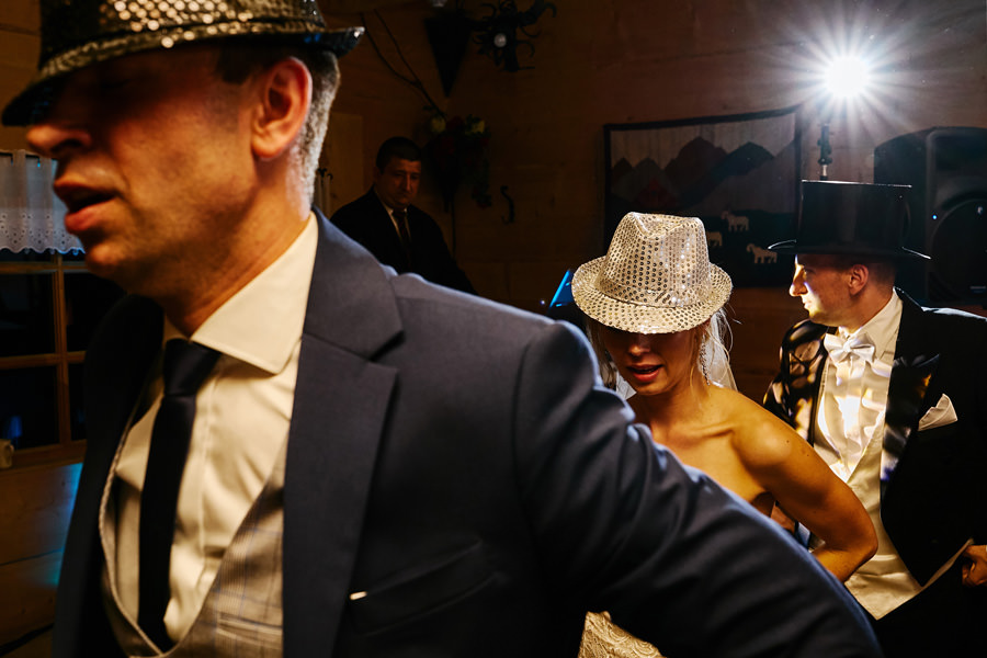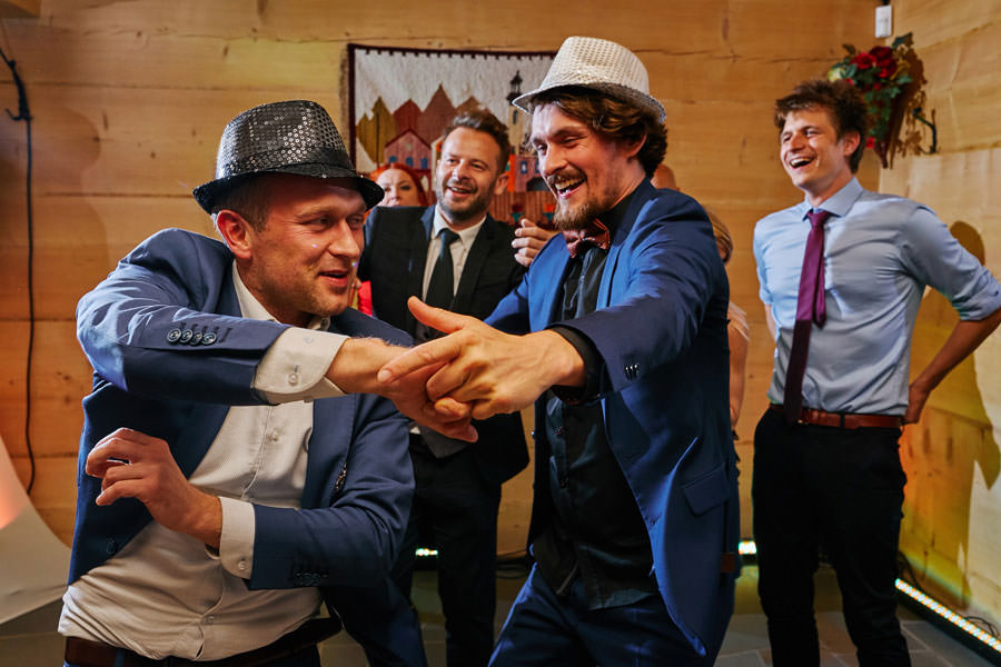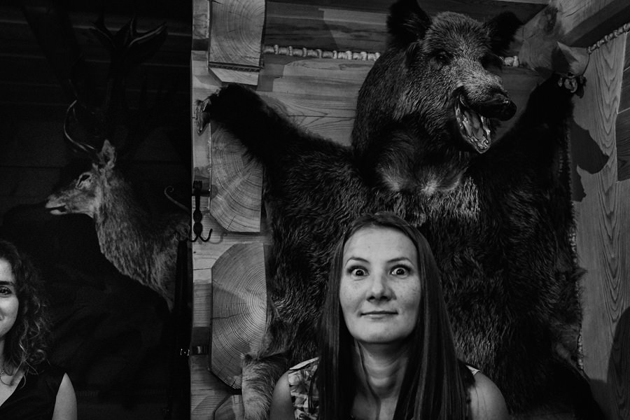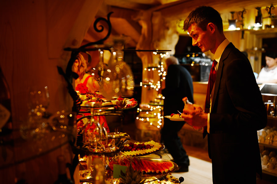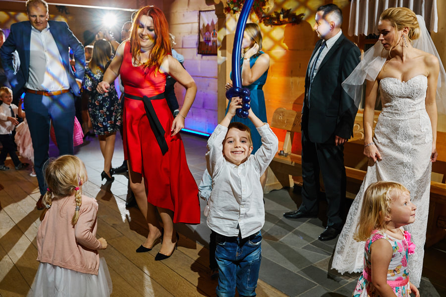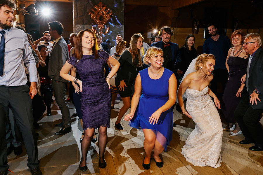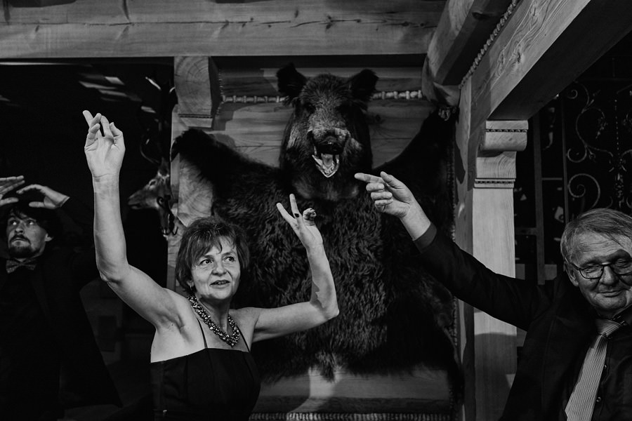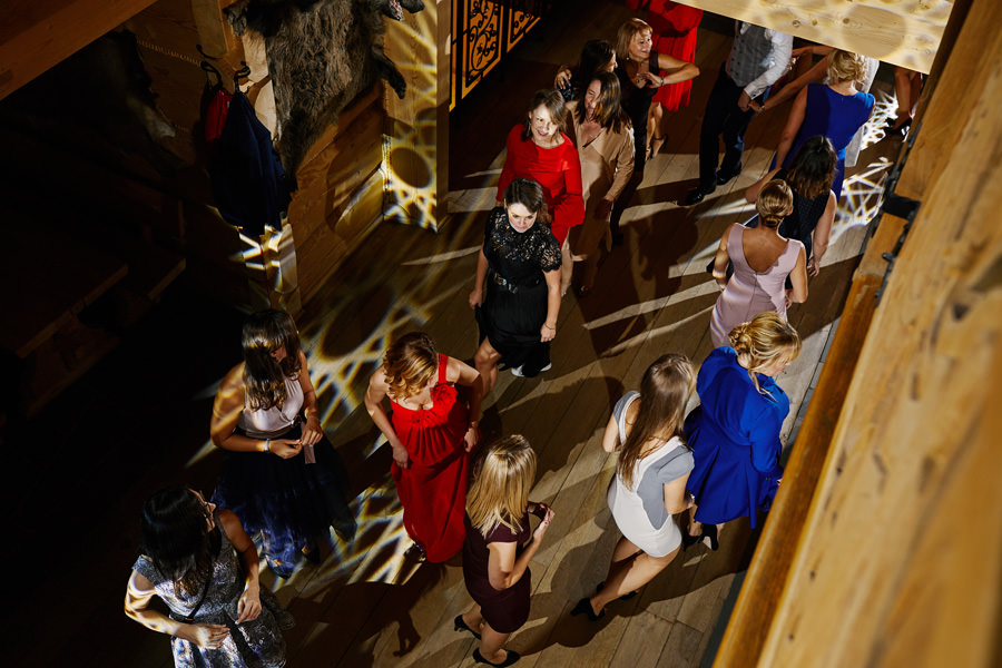 Jeśli chodzi o miejsce wesela – wybór padł na karczmę Tatrzański Bór. Drewniana zabudowa, piękne zdobienia, liczne akcenty myśliwsko-łowieckie – podkreślały górski klimat całego wesela. Do tego delikatne, dopasowane dekoracje, świetna kuchnia i przemiła obsługa lokalu przyczyniła się do tego, że wspominamy to wesele z ogromnym sentymentem. Parkiet był stosunkowo niewielki, więc para młoda zdecydowała się na wybór DJa, a nie żywej muzyki. Był to znakomity wybór, gdyż oprócz dobrej muzyki były liczne zabawy, angażujące wszystkich gości weselnych, nawet tych najstarszych i tych najbardziej opornych :).