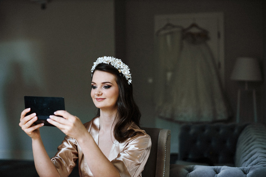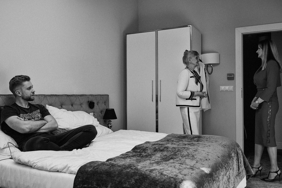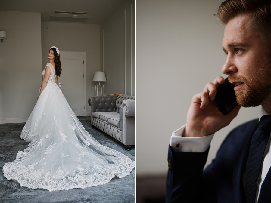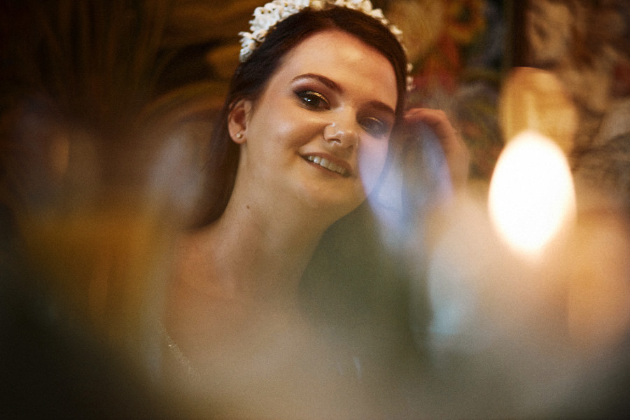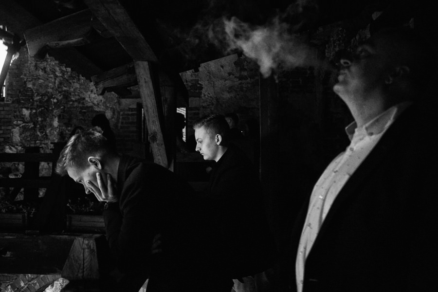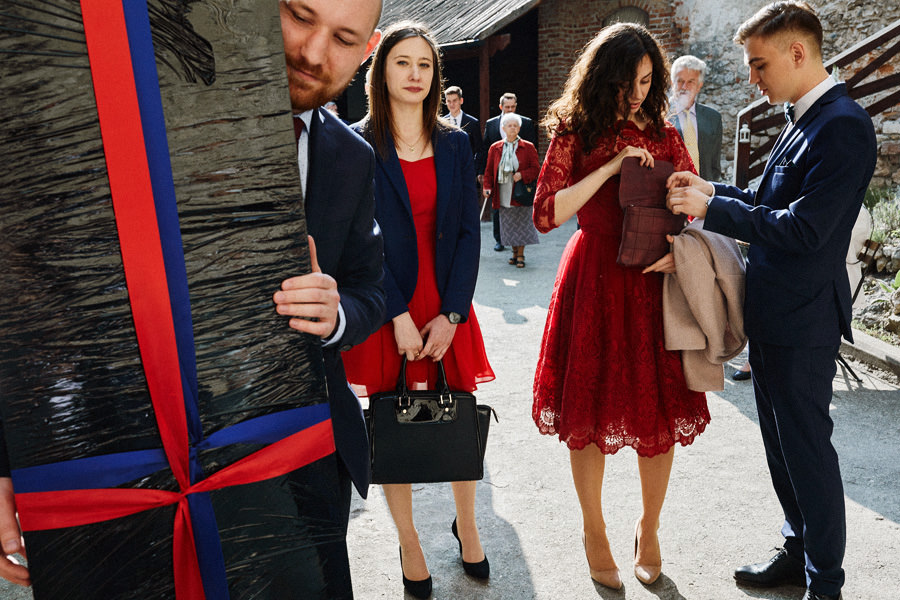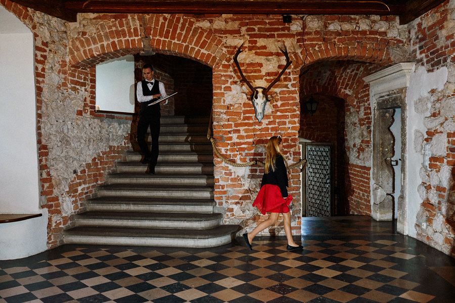 Reportaż to dynamika, wieloplany, interakcje między ludźmi, gdzie każde zdjęcie do osobna historia, ale razem to historia doskonała. Tak sobie to wyobrażamy. Tymczasem są też sytuacje, że jest bardzo kameralnie, nie ma bieganiny, jest za to uważność. Czasem fotograf daje się wciągnąć w chaos, a czasem jest po to, żeby nie mącić ciszy. Zanim będzie przysięga, zanim zacznie się wesele na zamku w Korzkwi, jest potrzebny ten moment wyciszenia, spokojnego startu. Czy udało się pokazać spokój? 🙂
