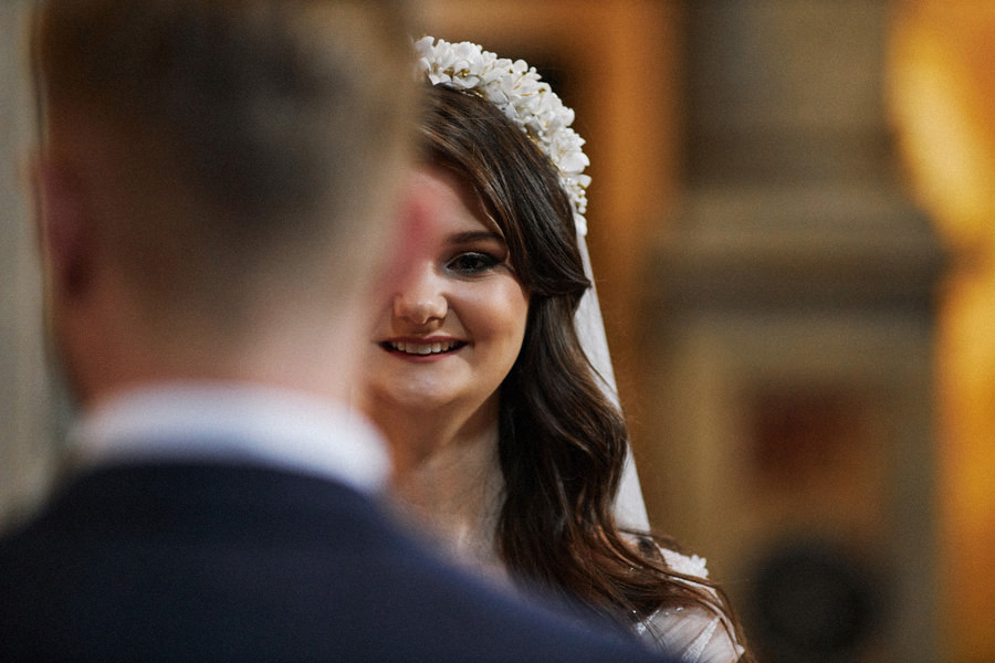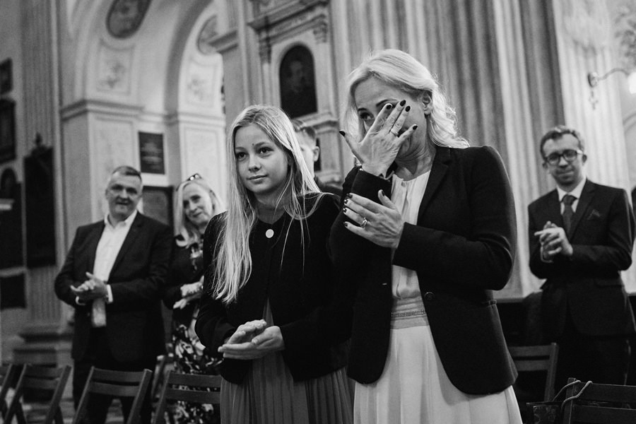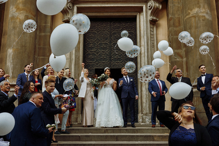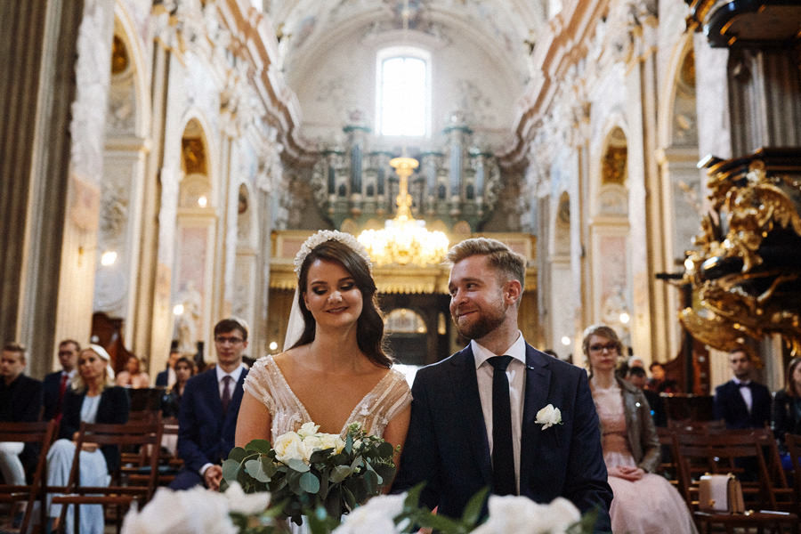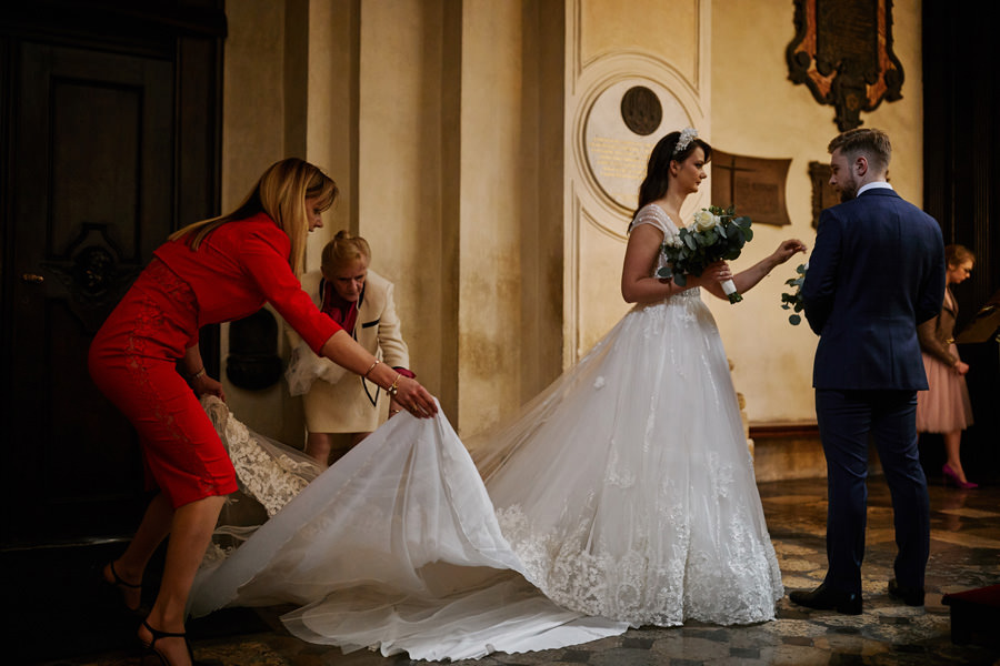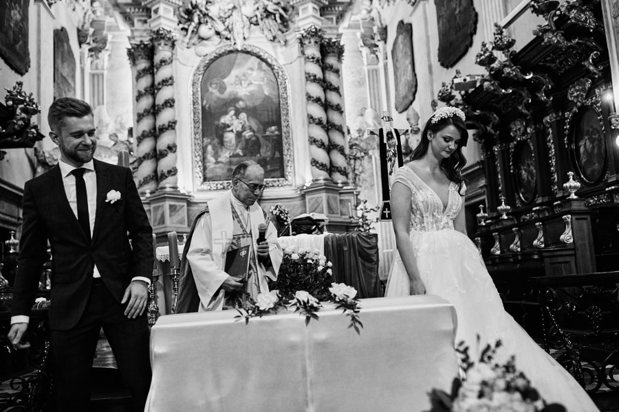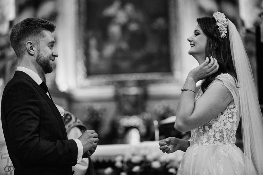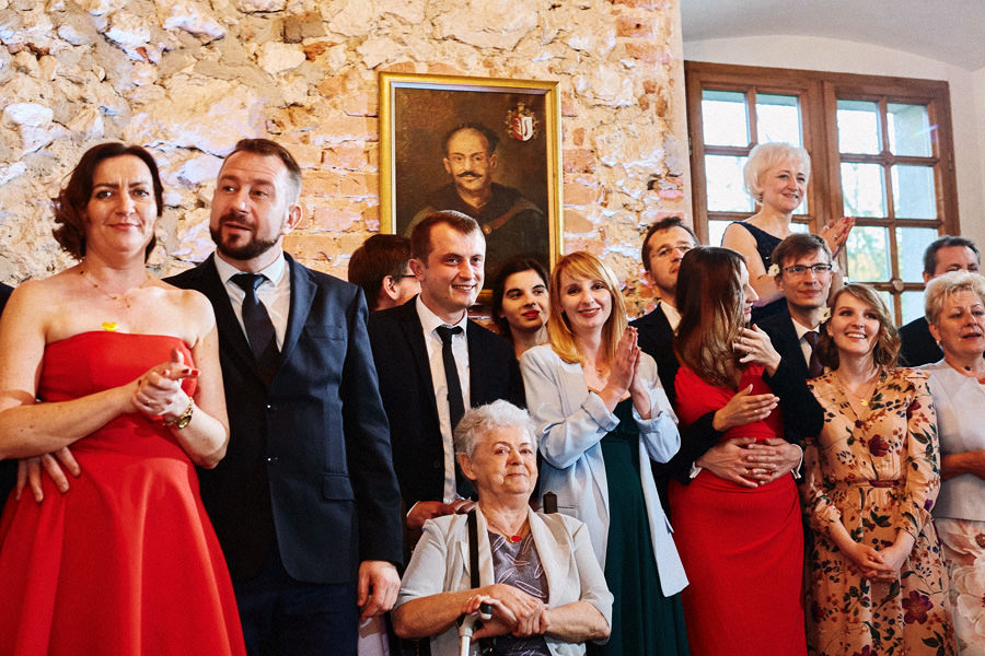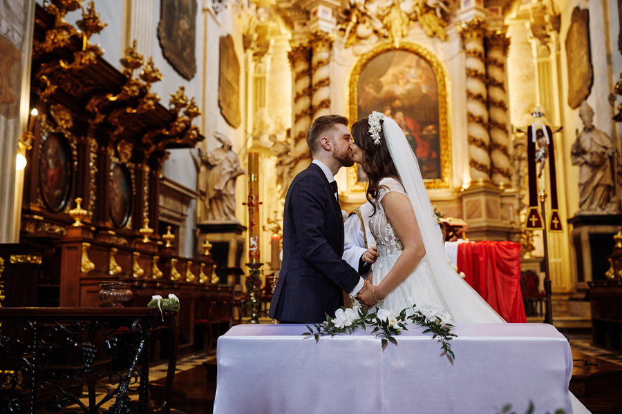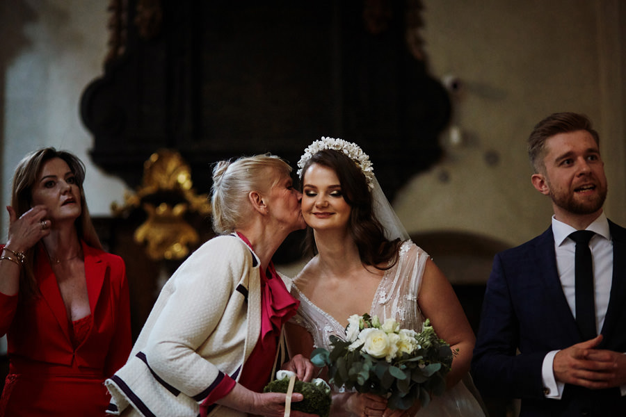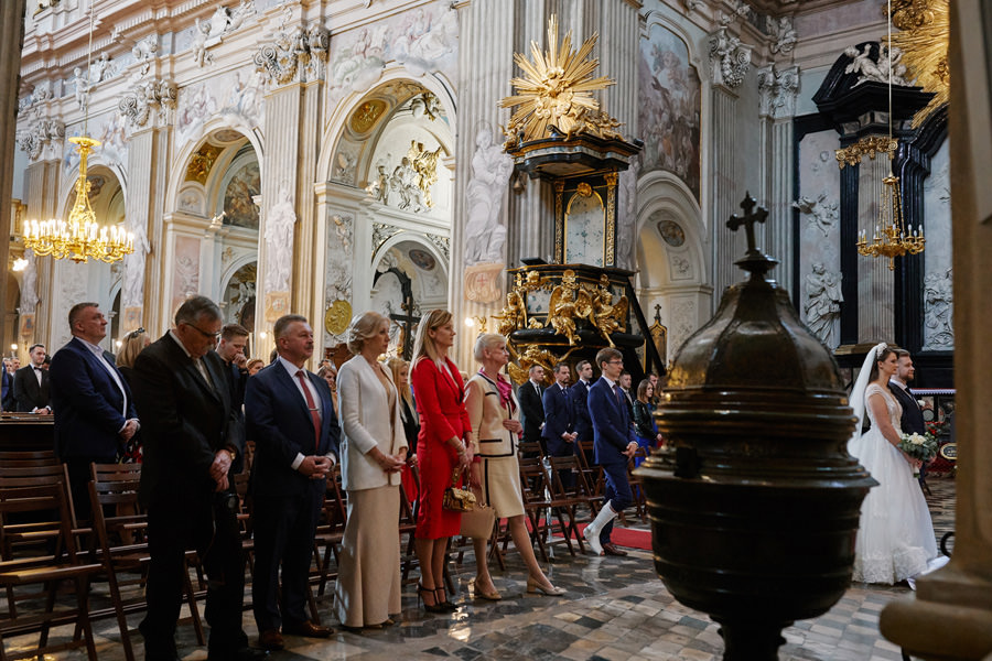 Kraków słynie z pięknych kościołów, ale wśród nich święta Anna to zdecydowanie moja ulubiona świątynia. Wszystko tu jest doskonałe – barokowy przepych równoważony jest strzelistością i lekkością wnętrza, a światło jest tak malarskie, że zdjęcia wyglądają jak obrazy. Zuzanna i Mateusz przysięgali otoczeni miłością. Ich przysięga była pełna emocji, a jej świadkowie mocno poruszeni. To te momenty, gdy fotograf naprawdę czuje, że ma świetną pracę – fantastycznie jest przyglądać się szczęściu. Zwłaszcza gdy w perspektywie jest wesele na zamku w Korzkwi!