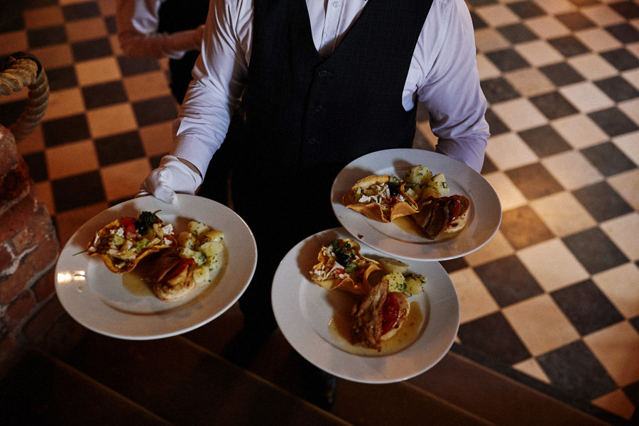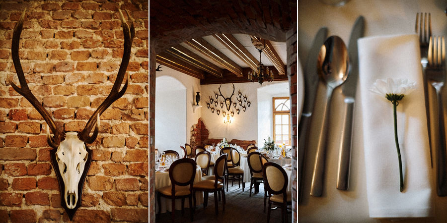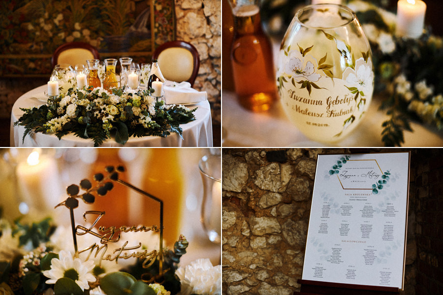 No dobra, co z tym zamkiem? Czy wesele na zamku w Korzkwi to klimat księżniczek i nieco przyciężki glamour? Wręcz przeciwnie. Zamek Korzkiew jest zamkiem średniowiecznym i leży na szlaku Orlich Gniazd – w pięknej Jurze Krakowsko-Częstochowskiej. Jednak w czasie „potopu szwedzkiego” został zniszczony, a potem odbudowany jako rezydencja myśliwska. Być może stracił tym samym na okazałości, ale zdecydowanie zyskał kameralny klimat. Mimo tego że jest to zamek na wzgórzu, nie przytłacza, a wręcz przeciwnie – daje mnóstwo przestrzeni o oddechu. Komnaty są piękne i szlachetne w swojej prostocie. Idealnie odzwierciedlają myśliwski charakter zamku. Jednocześnie zarówno zamkowe wnętrza, jak i piękny dziedziniec – są bardzo plastyczne. Można dekorować je w dowolnym klimacie, ale można też postawić też na minimalizm – pójść w subtelne dekoracje kwiatowe, a na dziedzińcu wyłącznie świetlne girlandy. Efekt jest przepiękny i mam nadzieję, że przekonacie się o tym przeglądając zdjęcia :).