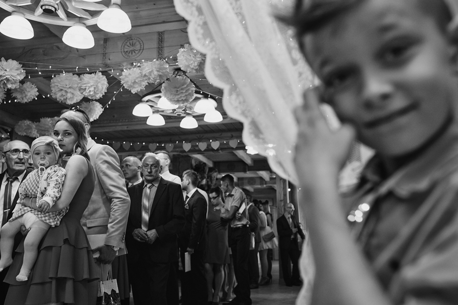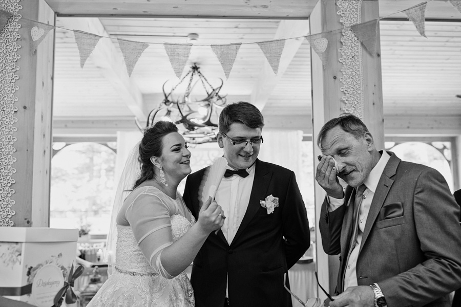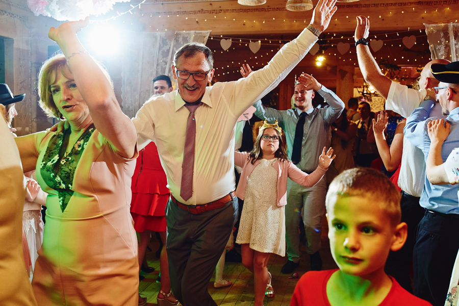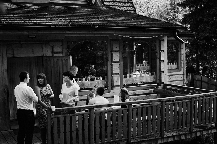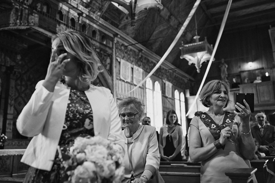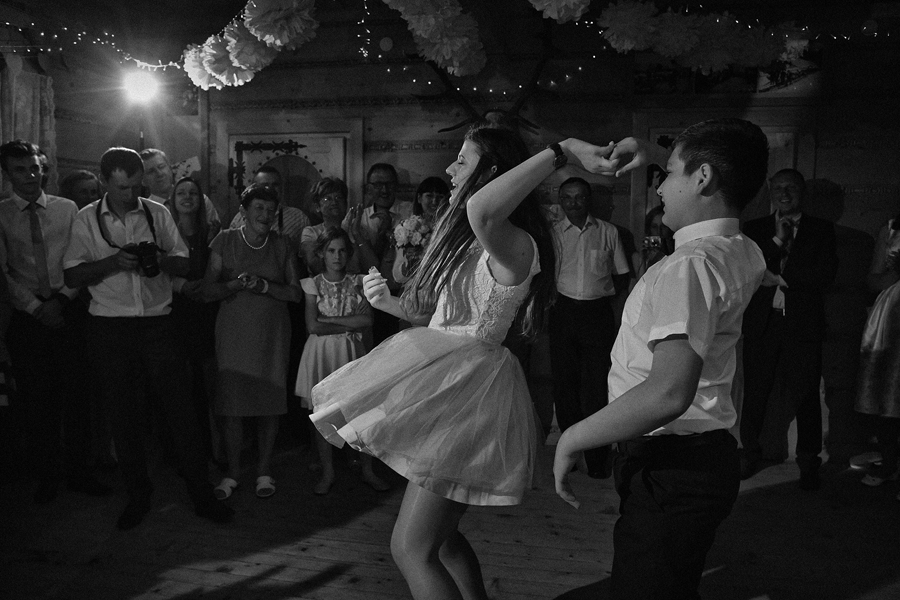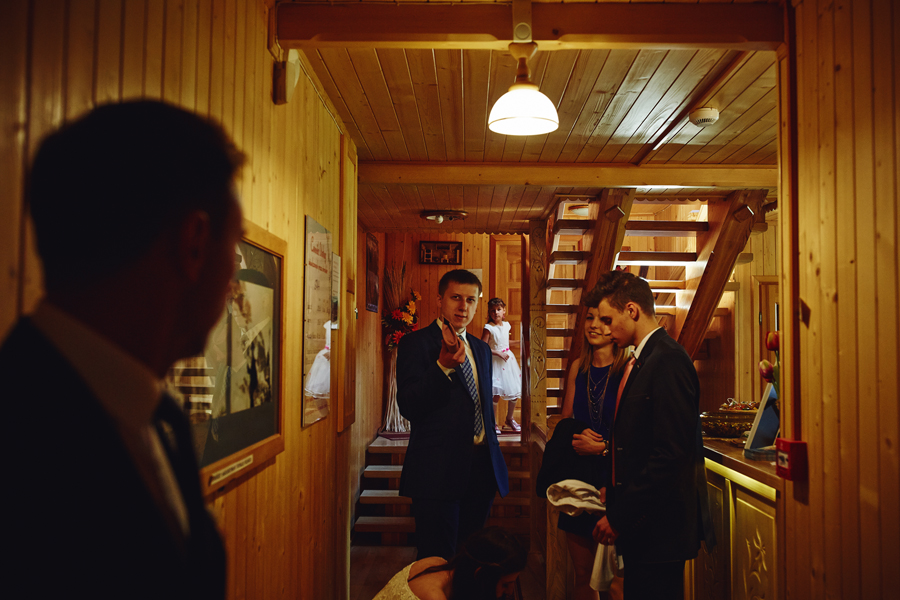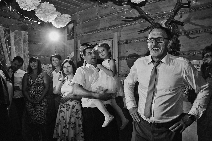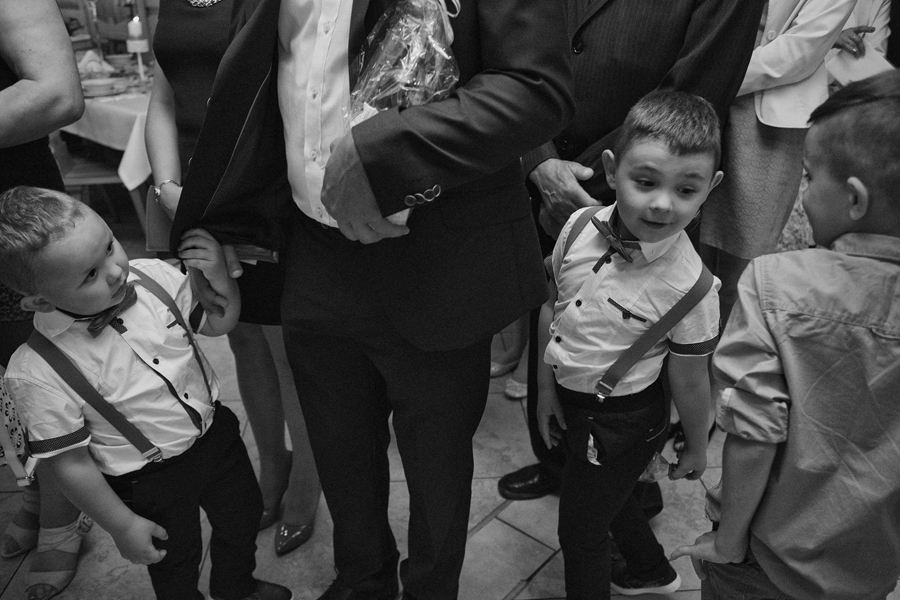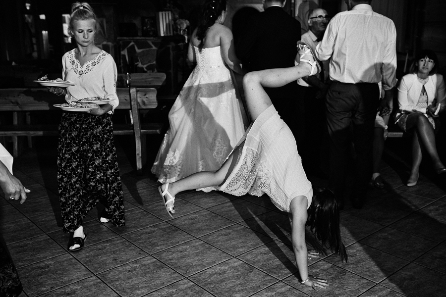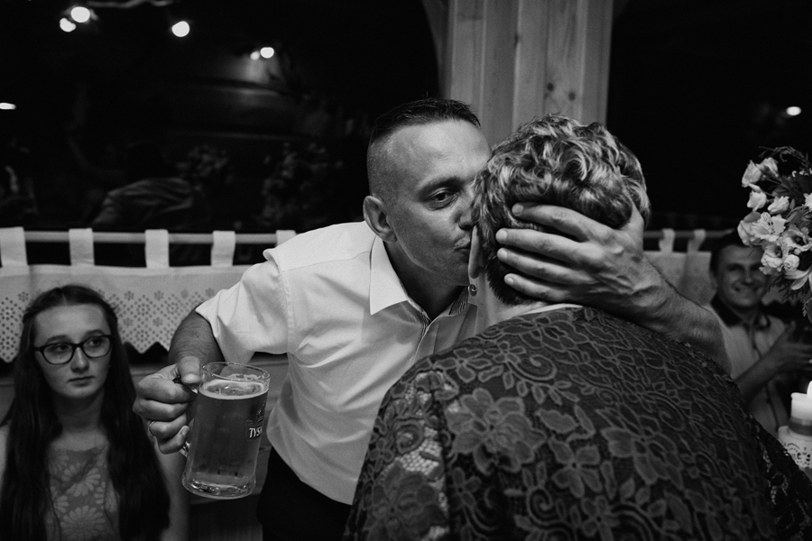 Nie było to jednak jedno z tych wesel typu slow, gdzie akcja rozgrywa się powoli, gdzie wszyscy przemieszczają się niespiesznie, gdzie detalami weselnymi i okoliczną przyrodą buduje się klimat. Tu jednak mieliśmy prawdziwie śląski temperament! Kasię poznaliśmy już wcześniej, gdyż jej ślub był trzecim, na którym byliśmy w tej rodzinie. Śmiało więc możemy powiedzieć, że naprawdę czuliśmy się jej częścią. Dwa poprzednie wesela pokazały nam wyraźnie, że w ich żyłach faktycznie płynie krew, nie woda i że potrafią bardzo głęboko się wzruszać, ale też bawić się do upadłego. Zapraszamy na dużą dawkę gęstych, reporterskich kadrów, intensywnie kolorowych i równie intensywnie czarno-białych.