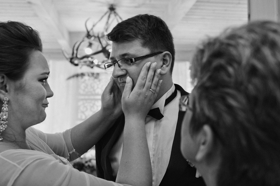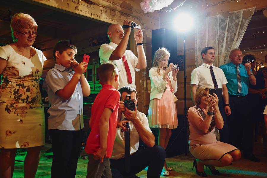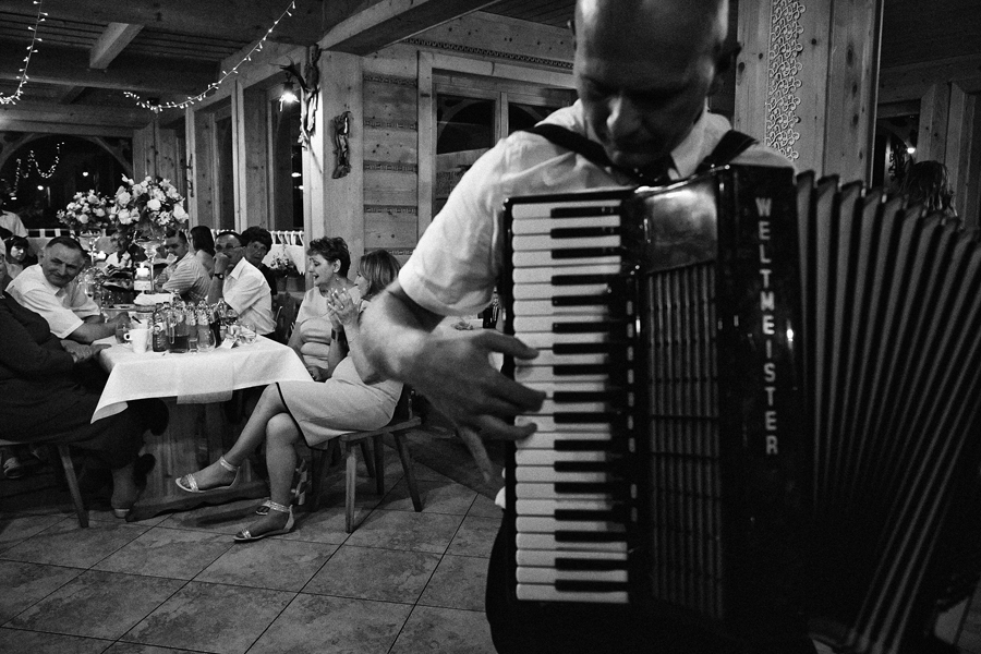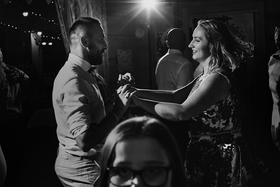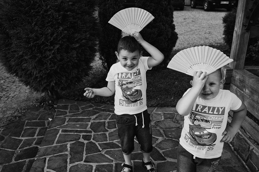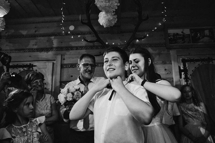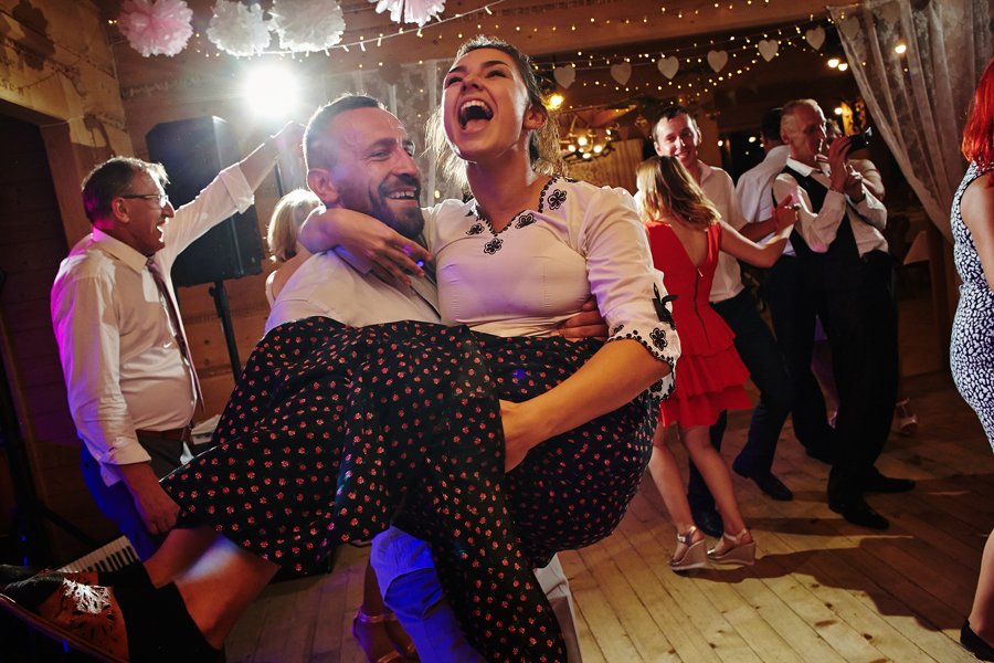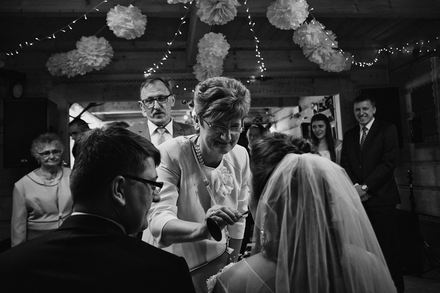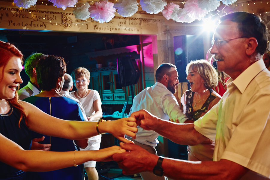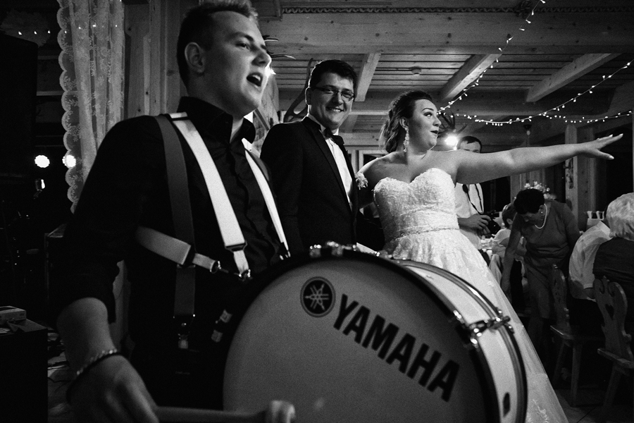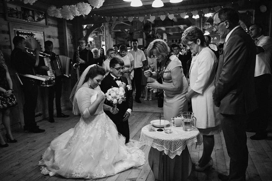 Nie było to jednak jedno z tych wesel typu slow, gdzie akcja rozgrywa się powoli, gdzie wszyscy przemieszczają się niespiesznie, gdzie detalami weselnymi i okoliczną przyrodą buduje się klimat. Tu jednak mieliśmy prawdziwie śląski temperament! Kasię poznaliśmy już wcześniej, gdyż jej ślub był trzecim, na którym byliśmy w tej rodzinie. Śmiało więc możemy powiedzieć, że naprawdę czuliśmy się jej częścią. Dwa poprzednie wesela pokazały nam wyraźnie, że w ich żyłach faktycznie płynie krew, nie woda i że potrafią bardzo głęboko się wzruszać, ale też bawić się do upadłego. Zapraszamy na dużą dawkę gęstych, reporterskich kadrów, intensywnie kolorowych i równie intensywnie czarno-białych.