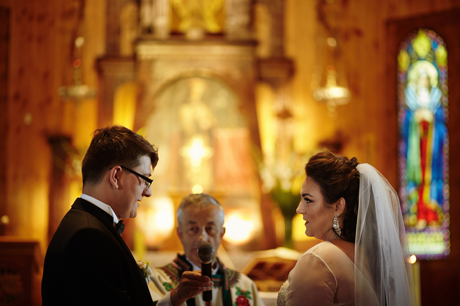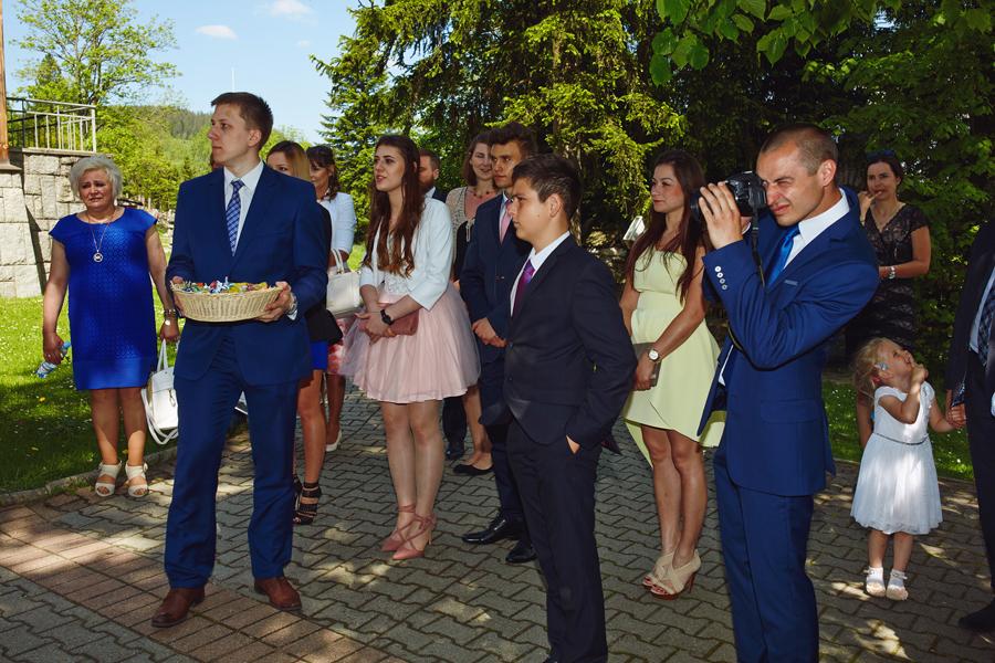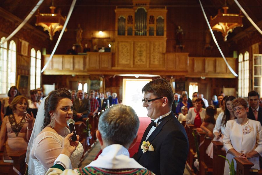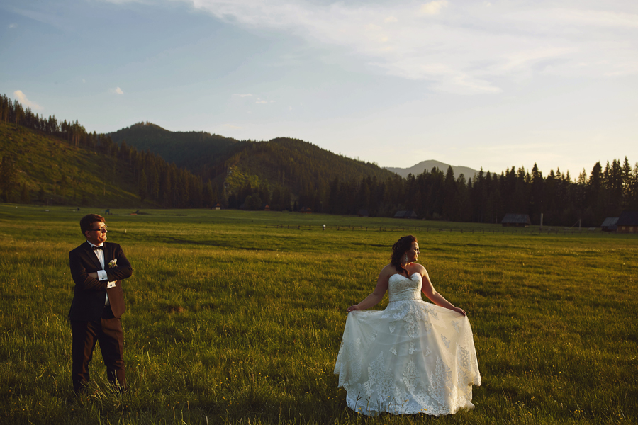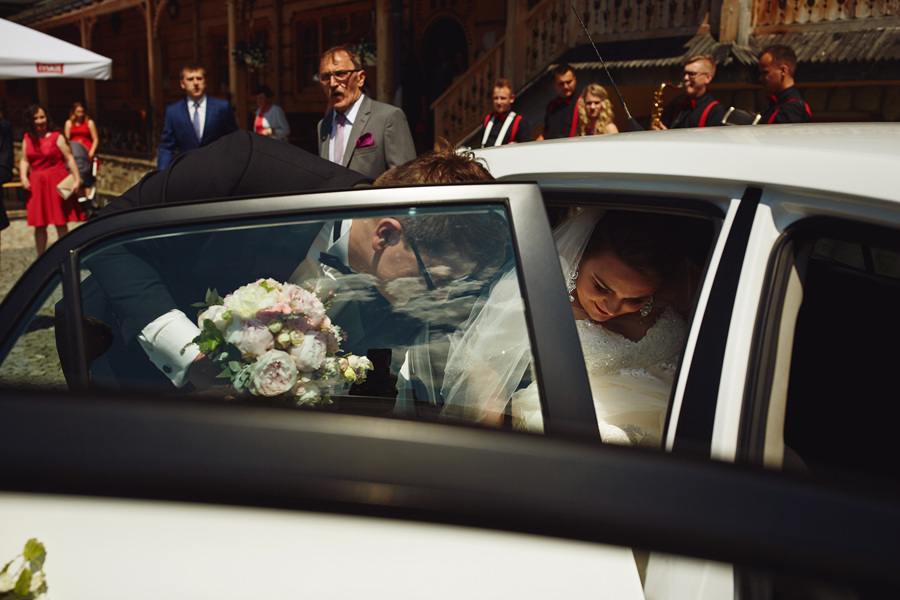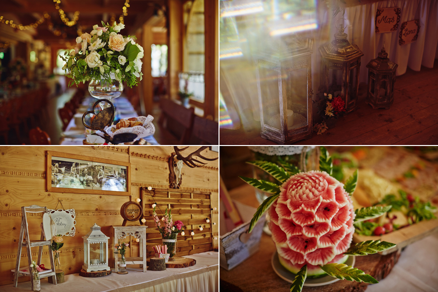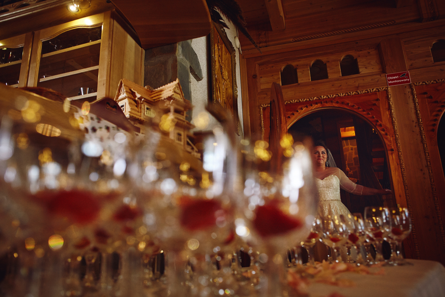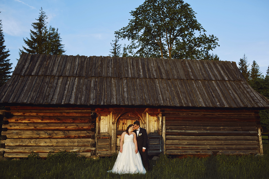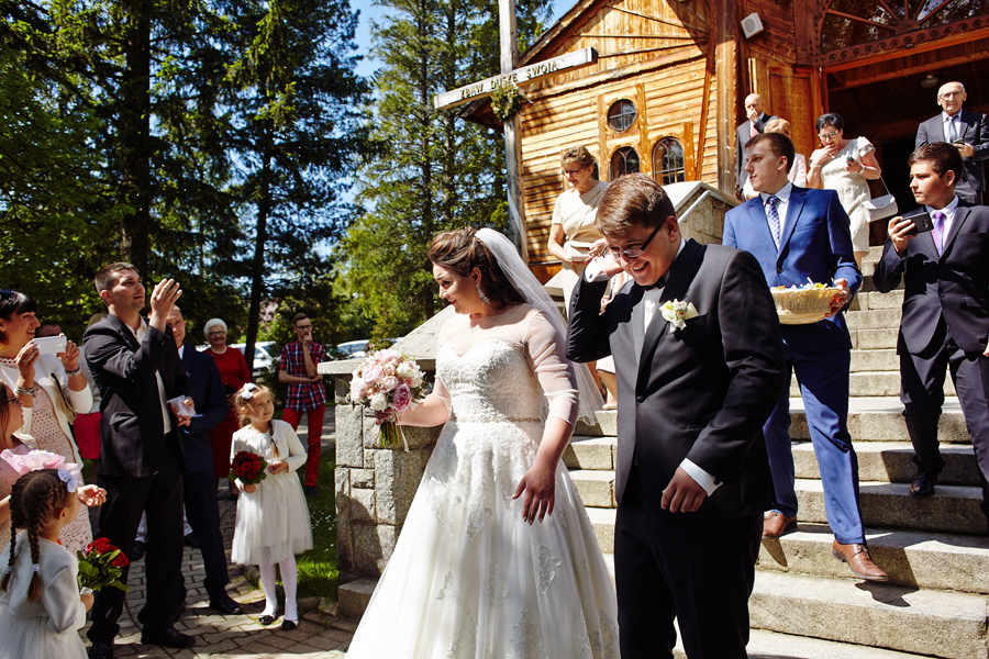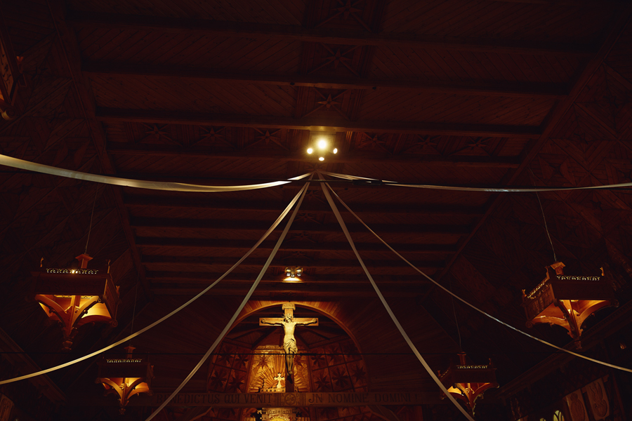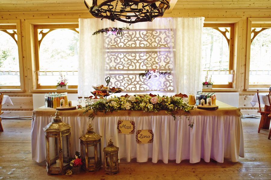 A gdyby tak rzucić wszystko i wyjechać… nie, nie w Bieszczady, w Tatry! Wyjechać po prostu nie oglądając się zupełnie na to, że jest się góralem… ale ze Śląska! Tak właśnie postanowili zrobić Kasia i Daniel. Zagrali va banque, nie pozostawiając rodzinie wyboru, ale fundując im w zamian weekend wrażeń u podnóży Tatr. Wybór położonej w Kościelisku Gazdówki pod Lasem na miejsce wesela oraz pięknego, zabytkowego, drewnianego kościółka na miejsce ceremonii ślubnej, był tyleż zaskakujący, co i niezwykle konsekwentny pod względem estetycznym. Zaskakujący oczywiście ze względu na odległość, którą musiała przebyć para młoda wraz ze swoimi gośćmi. Konsekwencja estetyczna zaś ujawniła się w drewnianej architekturze obu miejsc, zdobionej motywami kultury ludowej, zaś dekoratorzy dołożyli wszelkich starań, aby ślubne i weselne dekoracje pozostawały w klimacie górskiego wesela.