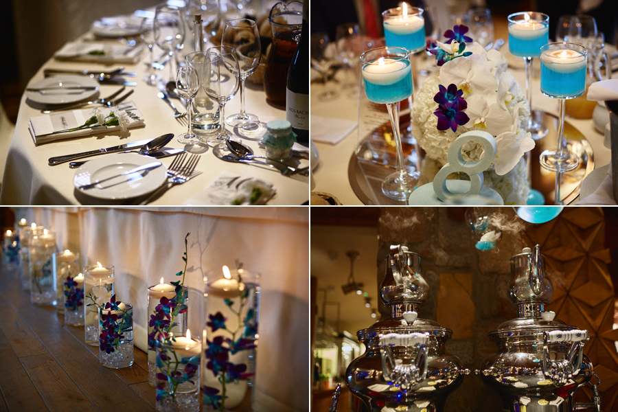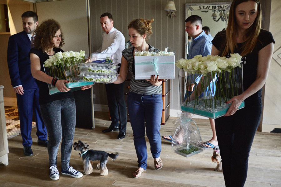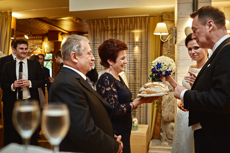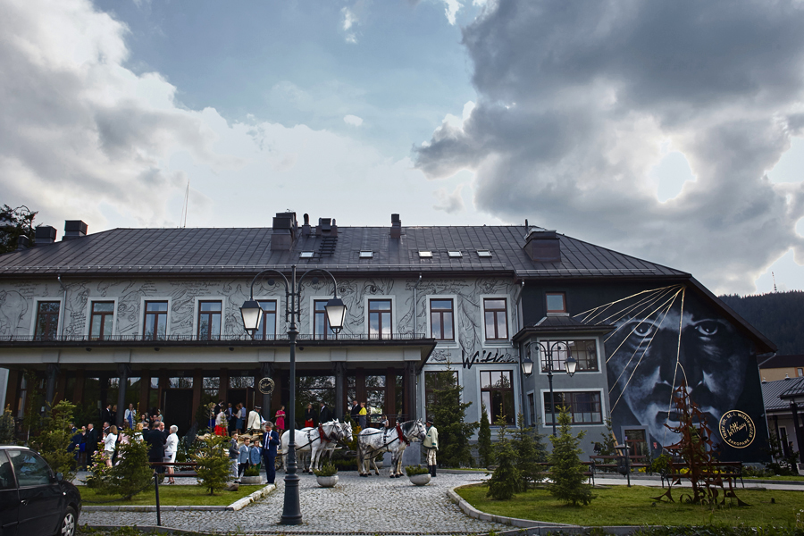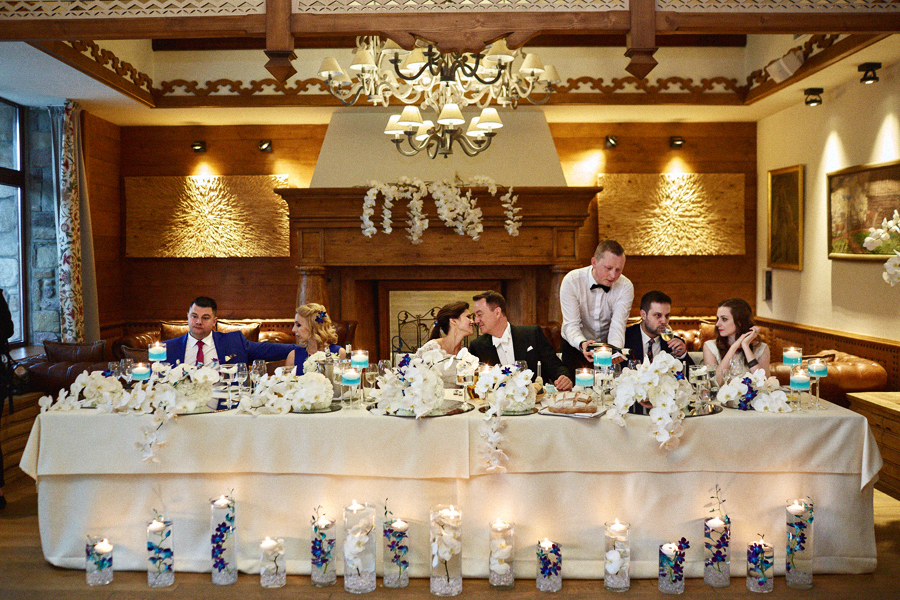 Po tych niesamowitych zaślubinach wszyscy goście przejechali dorożkami przez całe Zakopane do hotelu Aries, gdzie już czekało przygotowane dla nich przyjęcie. Było to naprawdę kolejne niezwykłe przedsięwzięcie i niemały wyczyn organizatorki tego wydarzenia, bo taka ilość dorożek nieco sparaliżowała ruch w mieście. Wszystko jednak udało się znakomicie i nawet udało nam się umknąć przed deszczem. Hotel powitał parę chlebem i solą, a nas wszystkich niezwykłymi dekoracjami, których kolorem przewodnim był niebieski i różne jego odcienie. Kuchnia poczęstowała nas znakomitym obiadem, a zespół Freshback – fantastyczną muzyką.