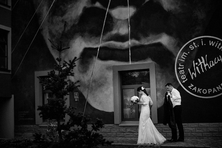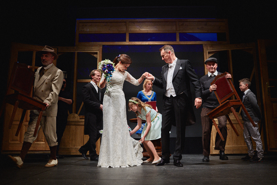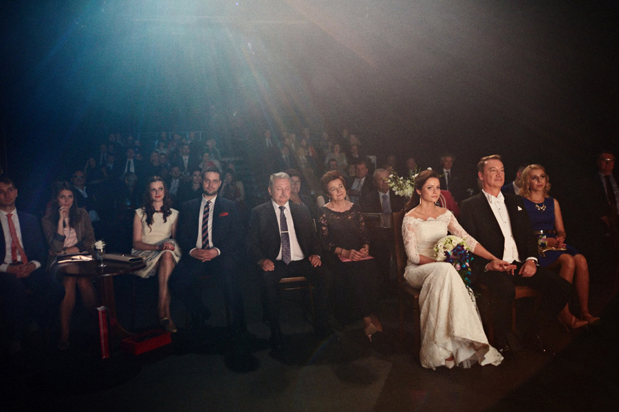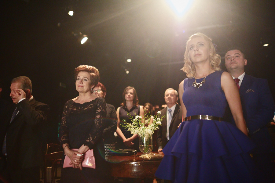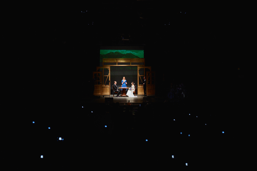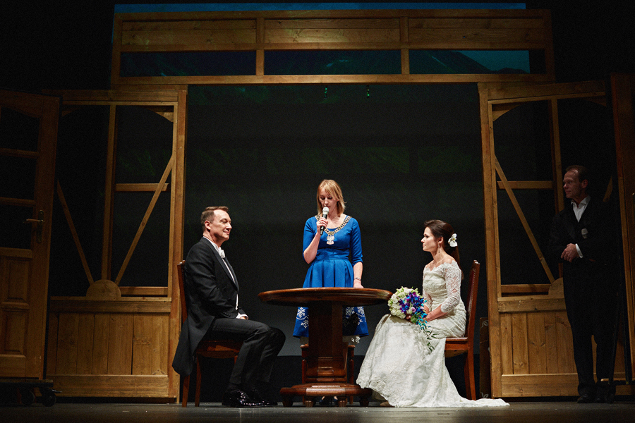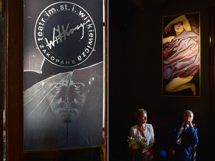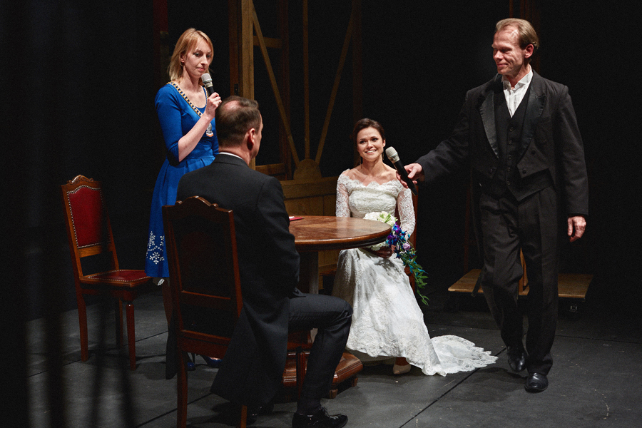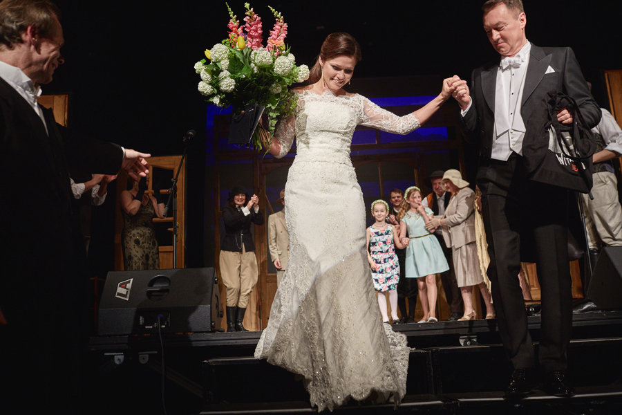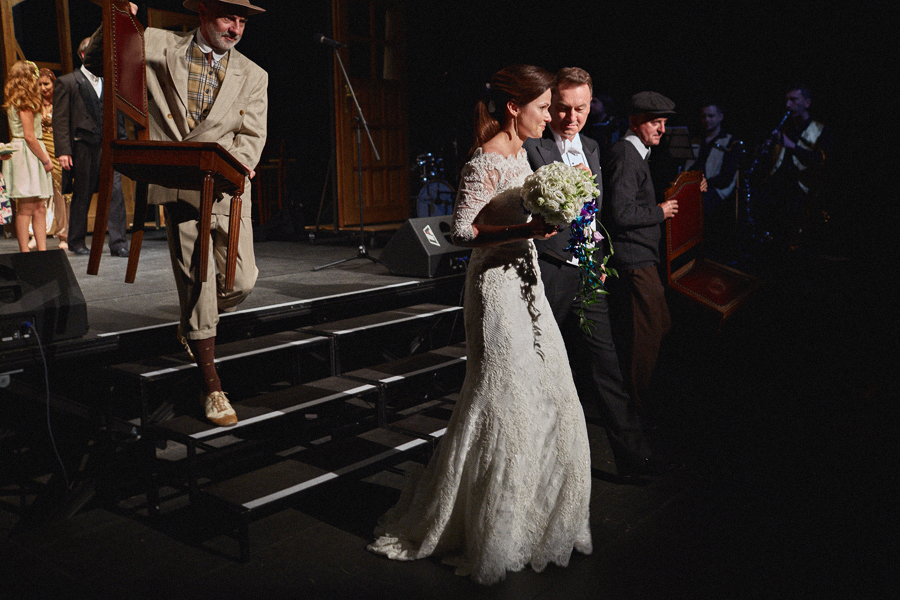 Do samego końca nie było wiadomo, jak to wszystko będzie wyglądało, kiedy dokładnie będzie ślub, jak będzie rozwiązana kwestia oświetlenia, jak my będziemy mogli się poruszać, aby zrobić dobre zdjęcia jednocześnie nie zakłócając sztuki. Kto nie widział tej sztuki – ogromnie polecam! Tymczasem my wiedzieliśmy tylko, że będzie tam nadprogramowa scena, scena ślubu pary, która przyjechała odwiedzić Zakopane. Zgromadzeni goście oglądali sztukę nie do końca świadomi, co się zaraz stanie. I wreszcie, ku niemałemu zaskoczeniu wszystkich, stało się. Po ceremonii ślubu Młodożeńcy zasiedli na widowni, by obejrzeć sztukę do końca. Myślę, że oglądając te zdjęcia wiele osób będzie sobie zadawało pytanie, czy to rzeczywiście był prawdziwy ślub. Sceniczna fikcja mieszała się z rzeczywistością, ale zapewniam, że ślub był najprawdziwszy.