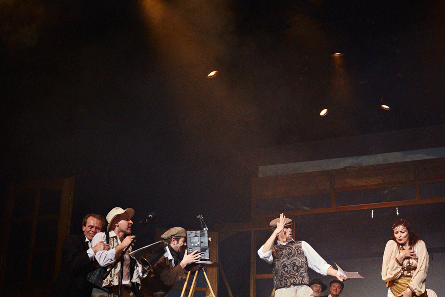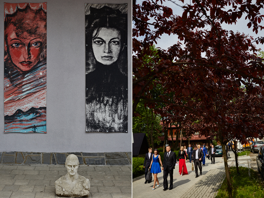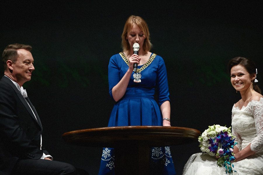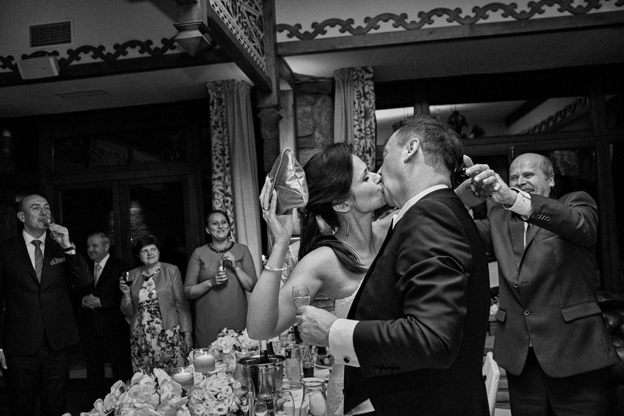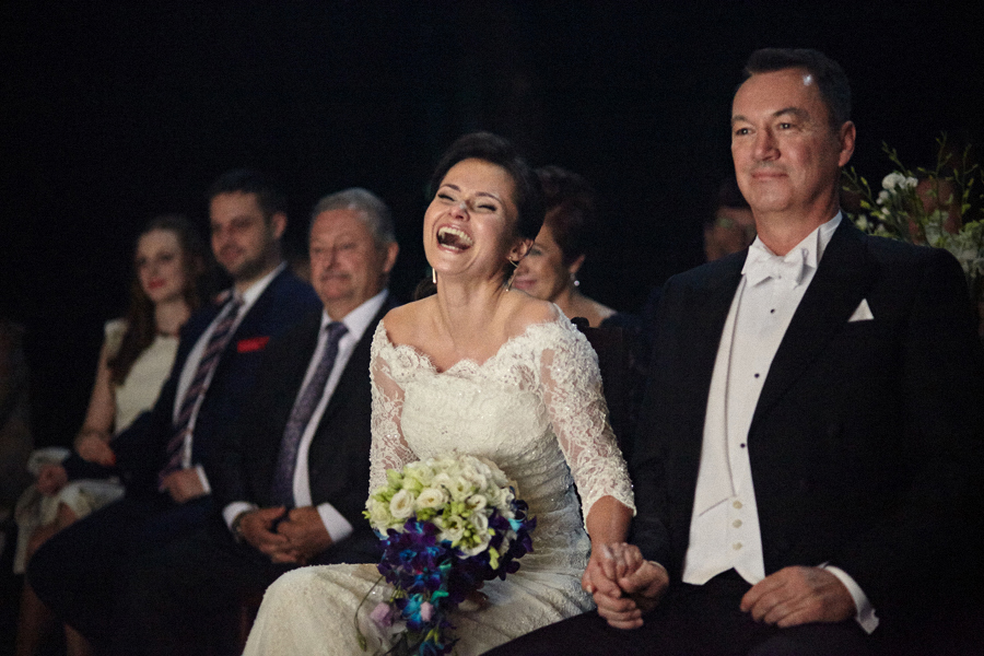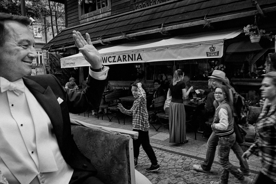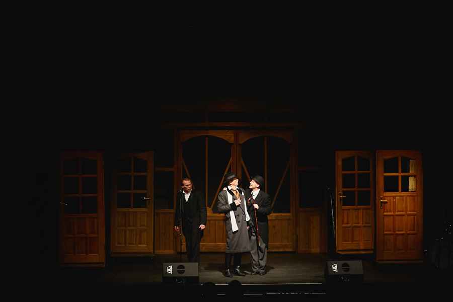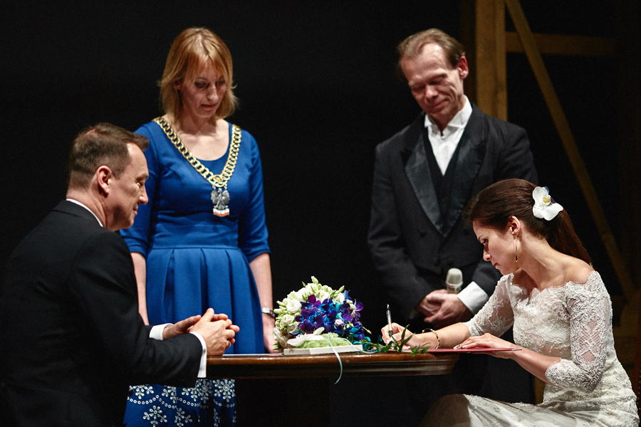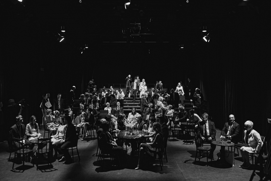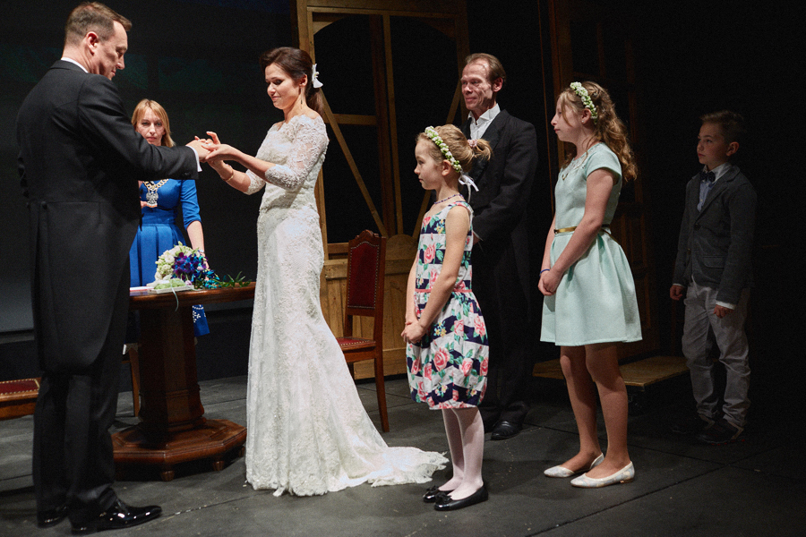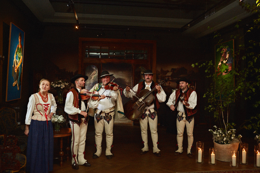 Do samego końca nie było wiadomo, jak to wszystko będzie wyglądało, kiedy dokładnie będzie ślub, jak będzie rozwiązana kwestia oświetlenia, jak my będziemy mogli się poruszać, aby zrobić dobre zdjęcia jednocześnie nie zakłócając sztuki. Kto nie widział tej sztuki – ogromnie polecam! Tymczasem my wiedzieliśmy tylko, że będzie tam nadprogramowa scena, scena ślubu pary, która przyjechała odwiedzić Zakopane. Zgromadzeni goście oglądali sztukę nie do końca świadomi, co się zaraz stanie. I wreszcie, ku niemałemu zaskoczeniu wszystkich, stało się. Po ceremonii ślubu Młodożeńcy zasiedli na widowni, by obejrzeć sztukę do końca. Myślę, że oglądając te zdjęcia wiele osób będzie sobie zadawało pytanie, czy to rzeczywiście był prawdziwy ślub. Sceniczna fikcja mieszała się z rzeczywistością, ale zapewniam, że ślub był najprawdziwszy.
