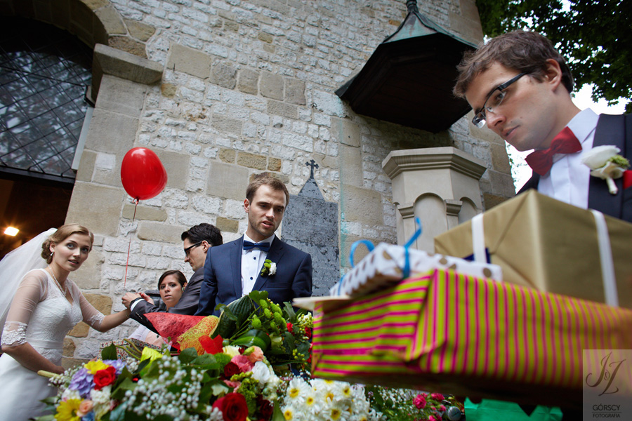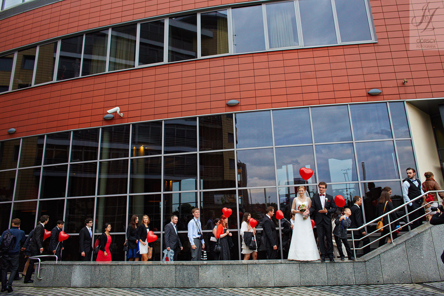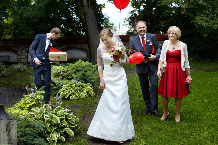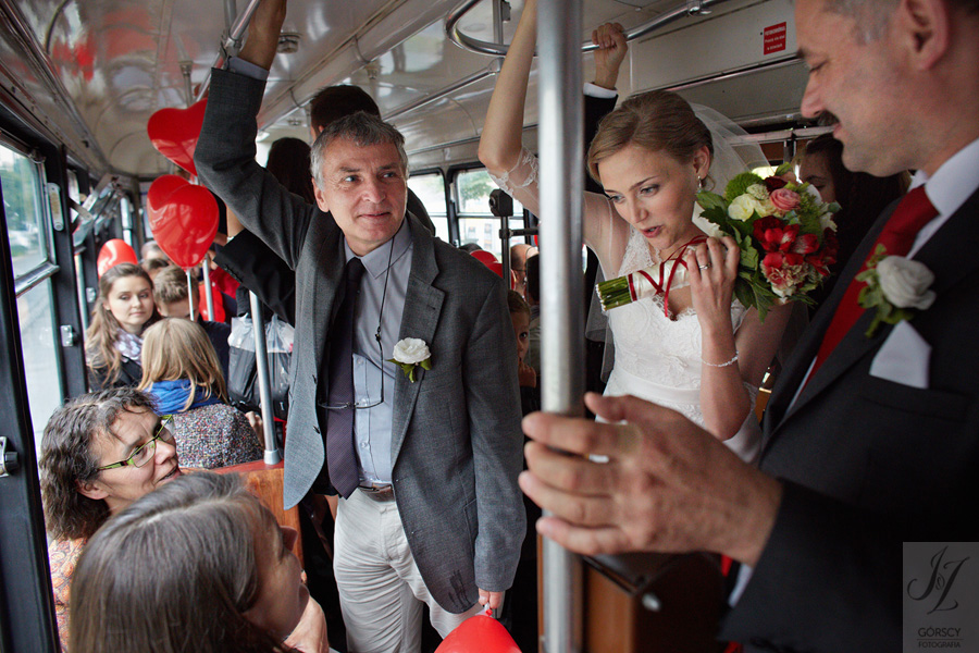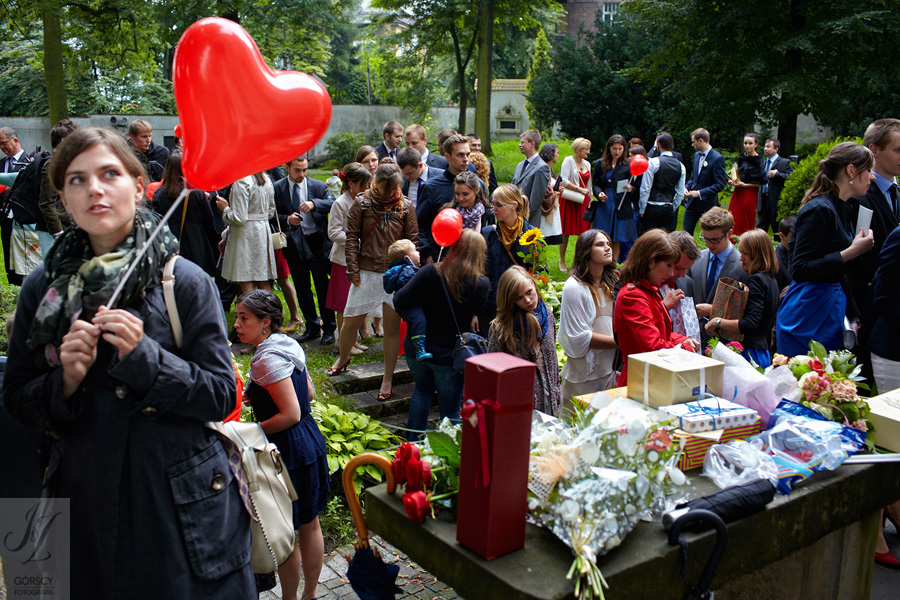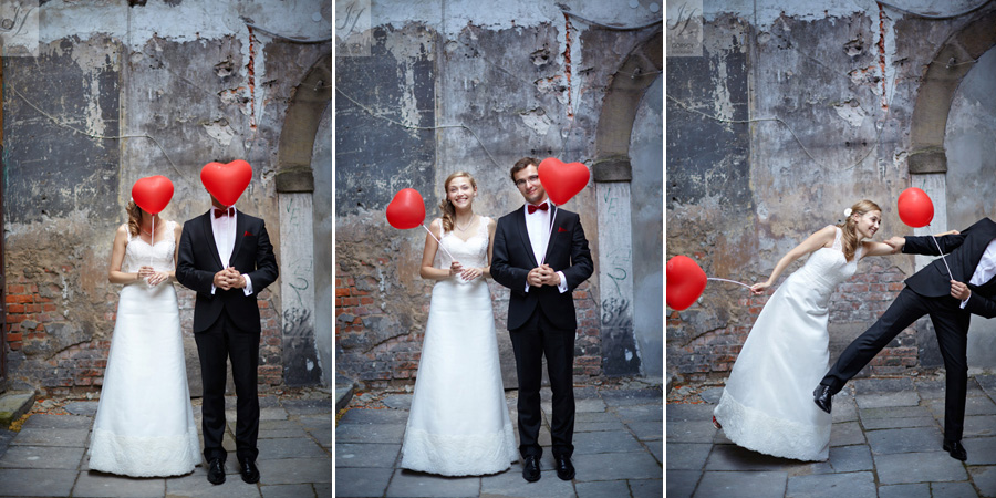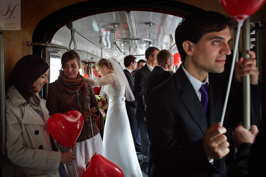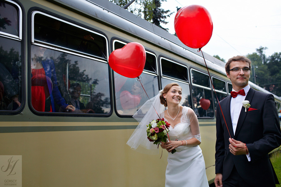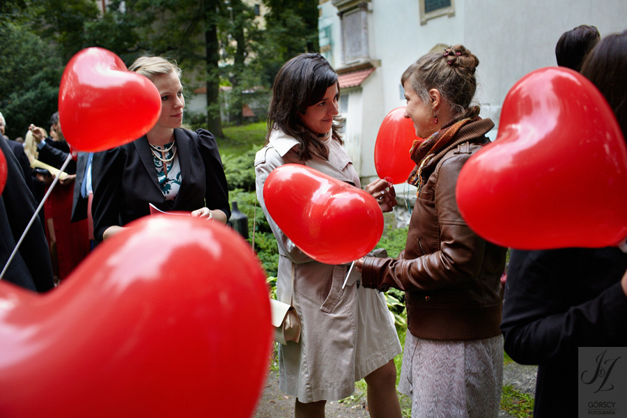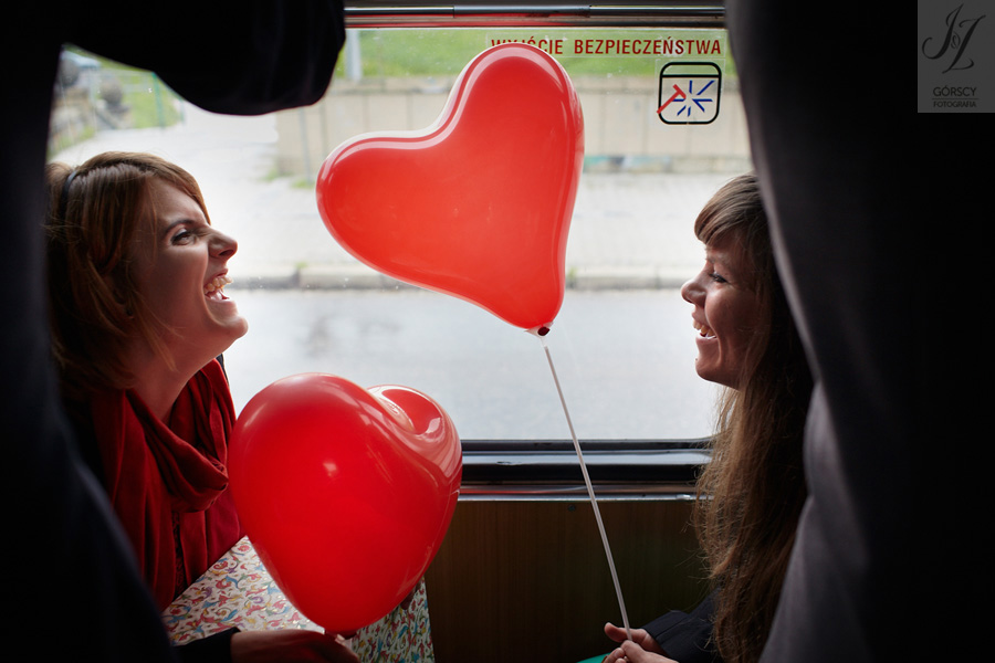 Lipiec. Deszczowy, bo, jak wiadomo, mamy w naszym kraju dwie pory roku: zimę i porę deszczową. No więc tak naprawdę wszystko zaczęło się zimą, kiedy fotografowaliśmy ślub Pauliny i Michała, który miał miejsce w Bazylice Mariackiej. Ślubu udzielał przyjaciel Młodej Pary – ksiądz Andrzej Jeleń, a nasza, jak się okazało, przyszła panna młoda, Magda, śpiewała w chórze. Na weselu Pauliny i Michała właśnie poznaliśmy bliżej Magdę i Kubę oraz całą, niezwykłą i pełną energii grupę przyjaciół. Ogromnie się ucieszyliśmy, że będziemy mieli okazję spotkać się ponownie na ich ślubie. Po raz kolejny uczestniczyliśmy w niezwykłej Mszy św. w kościele Najświętszego Salwatora, który na tamten moment zamienił się w dom. Mały dom, który musiał pomieścić ponad sto osób, trzeba go było więc nieco przemeblować, poprzenosić kościelne ławki, by zrobić miejsce dla chóru, w którym Panna Młoda po raz pierwszy nie zaśpiewała, bo tym razem miała przed sobą inne zadania. Ślubu znów udzielił ksiądz Andrzej Jeleń i po raz kolejny była to przepiękna ceremonia, pełna wzruszeń i serdecznej, rodzinnej atmosfery. Nawet ponura aura przestała mieć jakiekolwiek znaczenie, tym bardziej, że Młoda Para miała na nią specjalny sposób. W czasie życzeń rozdała gościom czerwone balony-serca, które ożywiły kolorem wszystko dookoła. A potem, tramwajem, pojechały z nami na energetyczne wesele.