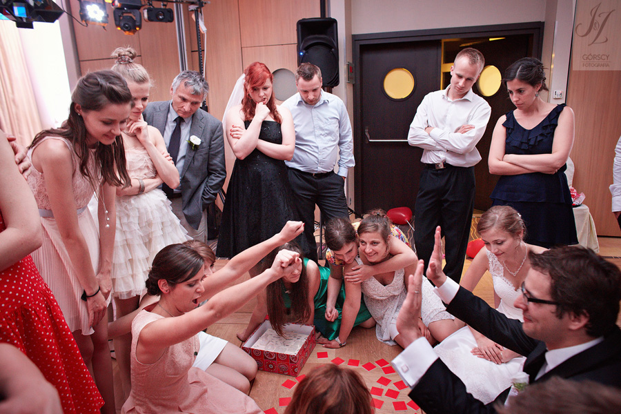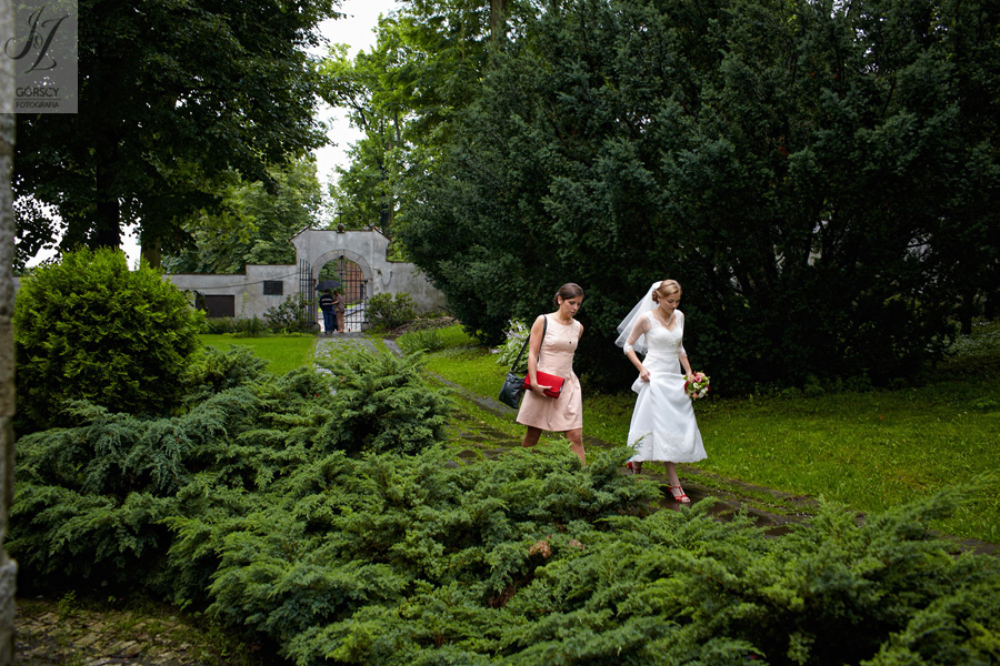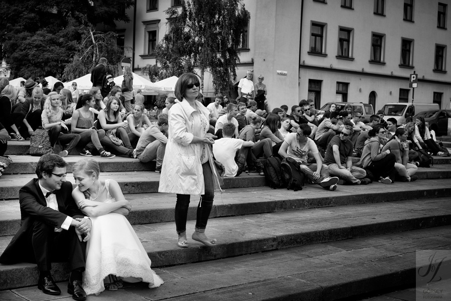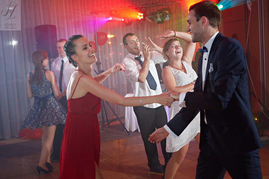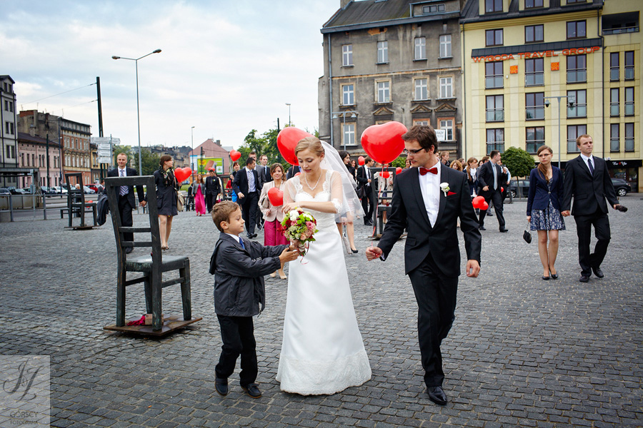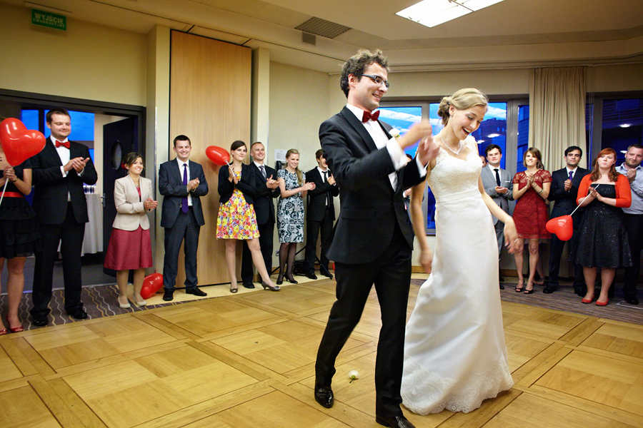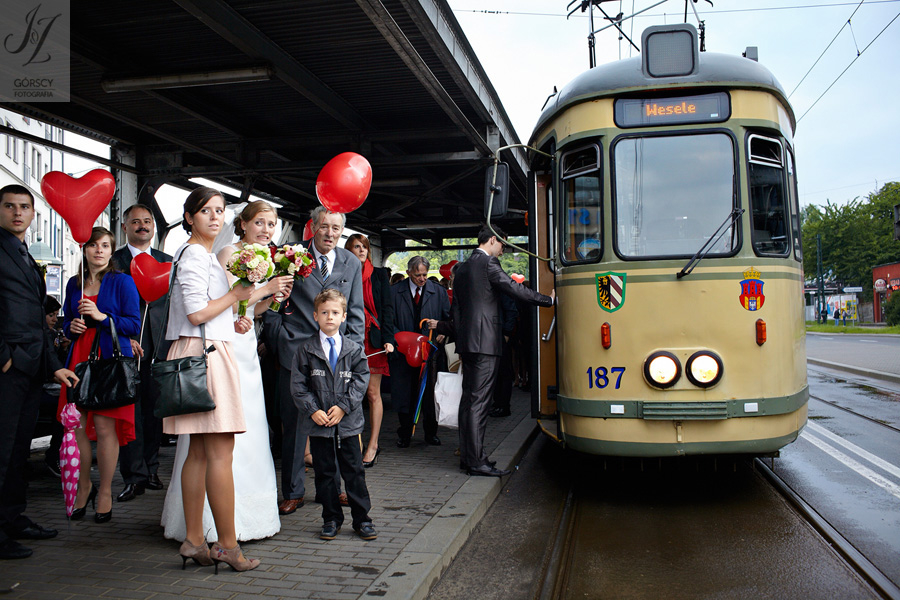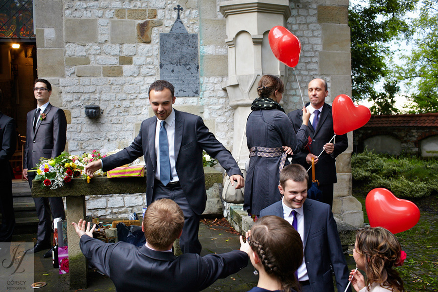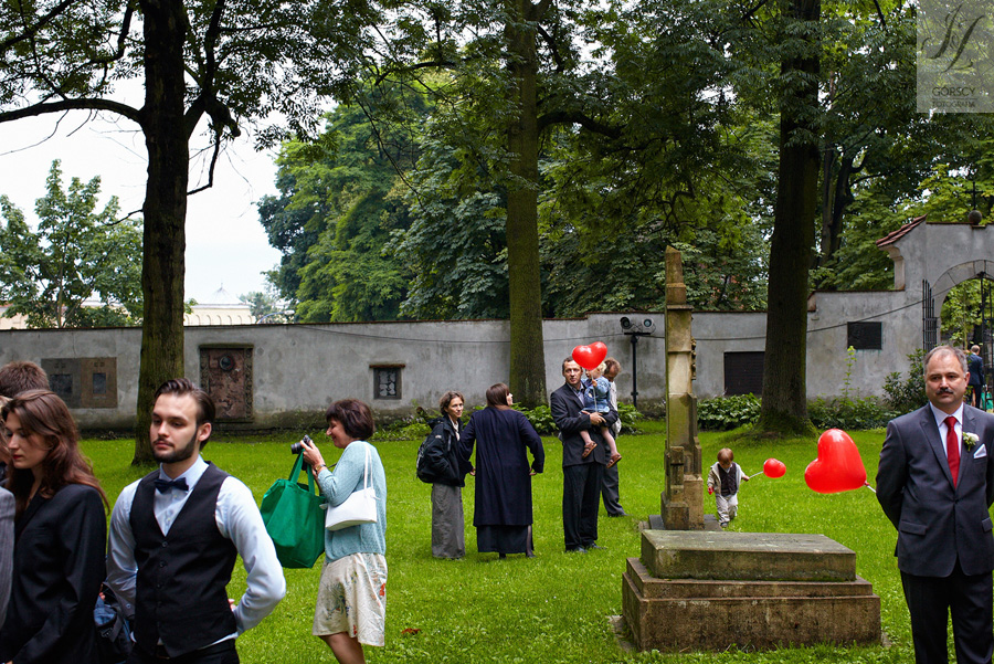 Lipiec. Deszczowy, bo, jak wiadomo, mamy w naszym kraju dwie pory roku: zimę i porę deszczową. No więc tak naprawdę wszystko zaczęło się zimą, kiedy fotografowaliśmy ślub Pauliny i Michała, który miał miejsce w Bazylice Mariackiej. Ślubu udzielał przyjaciel Młodej Pary – ksiądz Andrzej Jeleń, a nasza, jak się okazało, przyszła panna młoda, Magda, śpiewała w chórze. Na weselu Pauliny i Michała właśnie poznaliśmy bliżej Magdę i Kubę oraz całą, niezwykłą i pełną energii grupę przyjaciół. Ogromnie się ucieszyliśmy, że będziemy mieli okazję spotkać się ponownie na ich ślubie. Po raz kolejny uczestniczyliśmy w niezwykłej Mszy św. w kościele Najświętszego Salwatora, który na tamten moment zamienił się w dom. Mały dom, który musiał pomieścić ponad sto osób, trzeba go było więc nieco przemeblować, poprzenosić kościelne ławki, by zrobić miejsce dla chóru, w którym Panna Młoda po raz pierwszy nie zaśpiewała, bo tym razem miała przed sobą inne zadania. Ślubu znów udzielił ksiądz Andrzej Jeleń i po raz kolejny była to przepiękna ceremonia, pełna wzruszeń i serdecznej, rodzinnej atmosfery. Nawet ponura aura przestała mieć jakiekolwiek znaczenie, tym bardziej, że Młoda Para miała na nią specjalny sposób. W czasie życzeń rozdała gościom czerwone balony-serca, które ożywiły kolorem wszystko dookoła. A potem, tramwajem, pojechały z nami na energetyczne wesele.