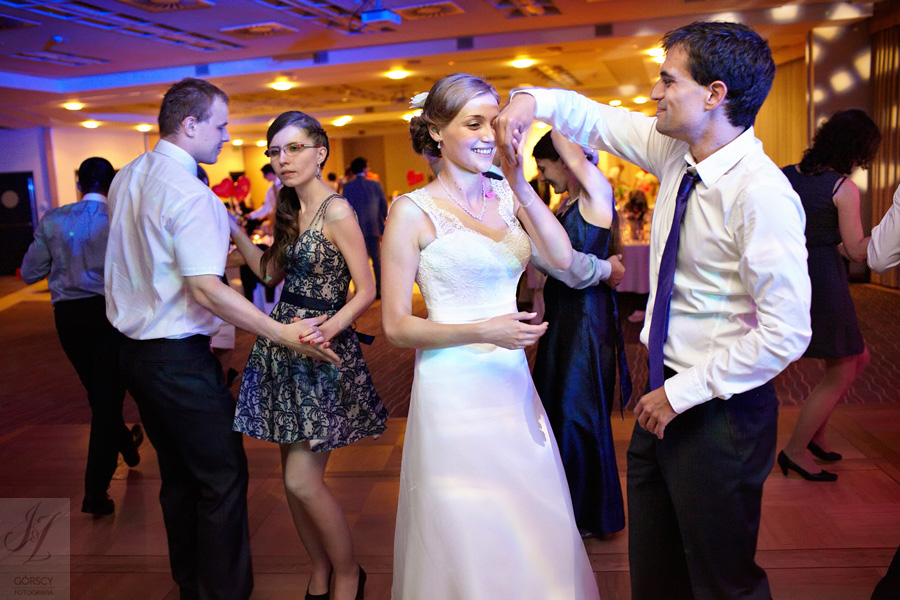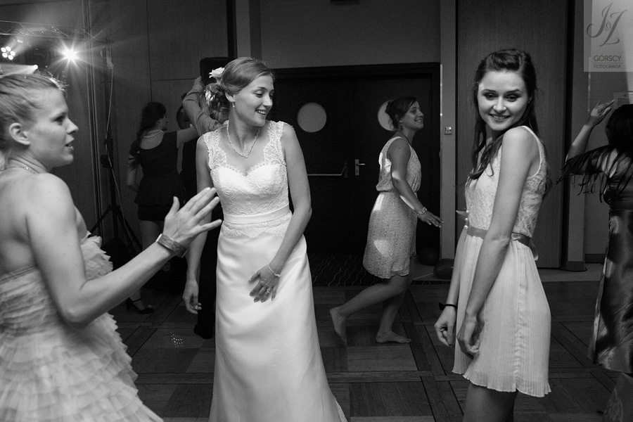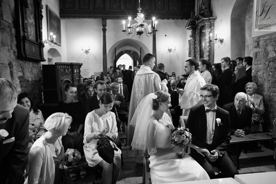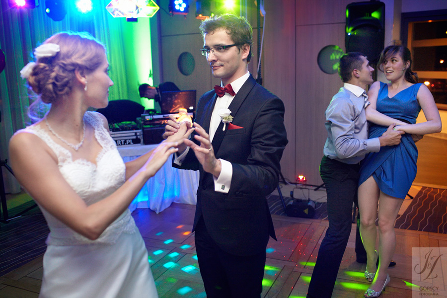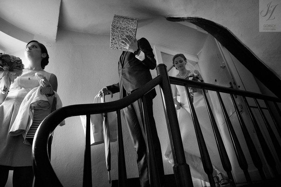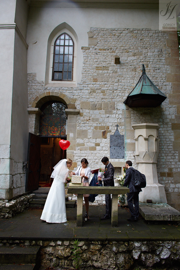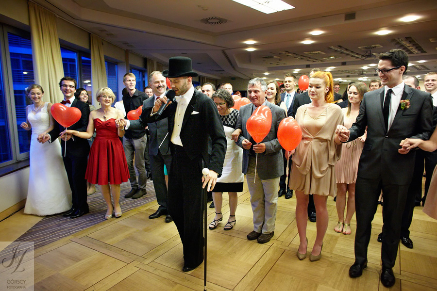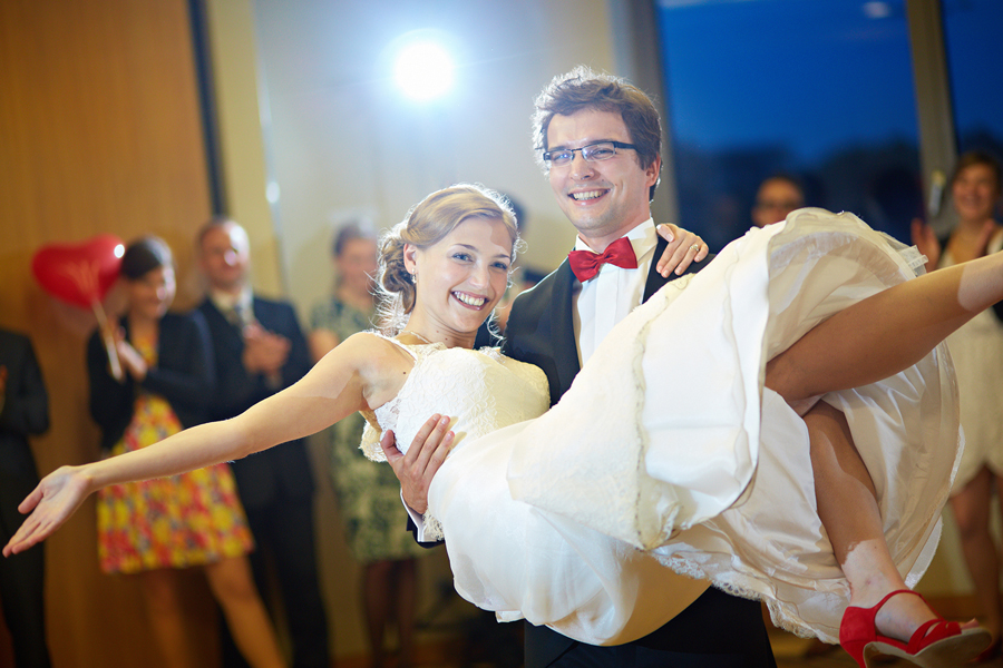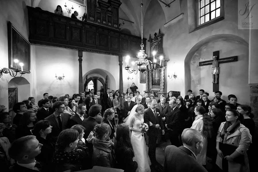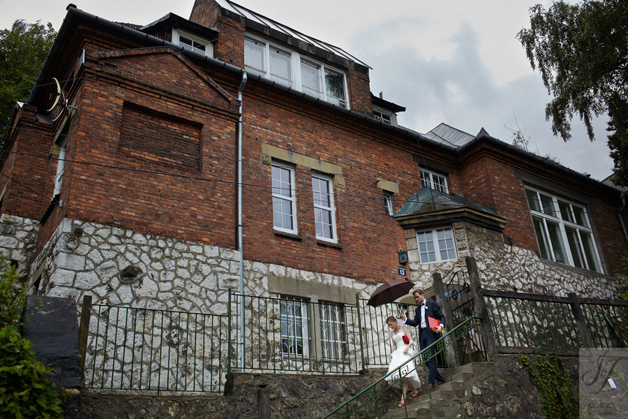 Lipiec. Deszczowy, bo, jak wiadomo, mamy w naszym kraju dwie pory roku: zimę i porę deszczową. No więc tak naprawdę wszystko zaczęło się zimą, kiedy fotografowaliśmy ślub Pauliny i Michała, który miał miejsce w Bazylice Mariackiej. Ślubu udzielał przyjaciel Młodej Pary – ksiądz Andrzej Jeleń, a nasza, jak się okazało, przyszła panna młoda, Magda, śpiewała w chórze. Na weselu Pauliny i Michała właśnie poznaliśmy bliżej Magdę i Kubę oraz całą, niezwykłą i pełną energii grupę przyjaciół. Ogromnie się ucieszyliśmy, że będziemy mieli okazję spotkać się ponownie na ich ślubie. Po raz kolejny uczestniczyliśmy w niezwykłej Mszy św. w kościele Najświętszego Salwatora, który na tamten moment zamienił się w dom. Mały dom, który musiał pomieścić ponad sto osób, trzeba go było więc nieco przemeblować, poprzenosić kościelne ławki, by zrobić miejsce dla chóru, w którym Panna Młoda po raz pierwszy nie zaśpiewała, bo tym razem miała przed sobą inne zadania. Ślubu znów udzielił ksiądz Andrzej Jeleń i po raz kolejny była to przepiękna ceremonia, pełna wzruszeń i serdecznej, rodzinnej atmosfery. Nawet ponura aura przestała mieć jakiekolwiek znaczenie, tym bardziej, że Młoda Para miała na nią specjalny sposób. W czasie życzeń rozdała gościom czerwone balony-serca, które ożywiły kolorem wszystko dookoła. A potem, tramwajem, pojechały z nami na energetyczne wesele.