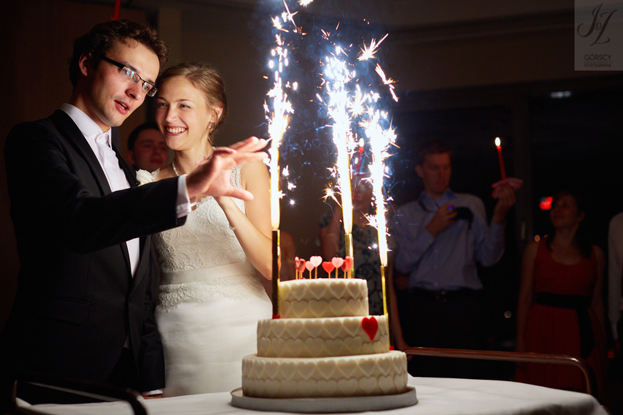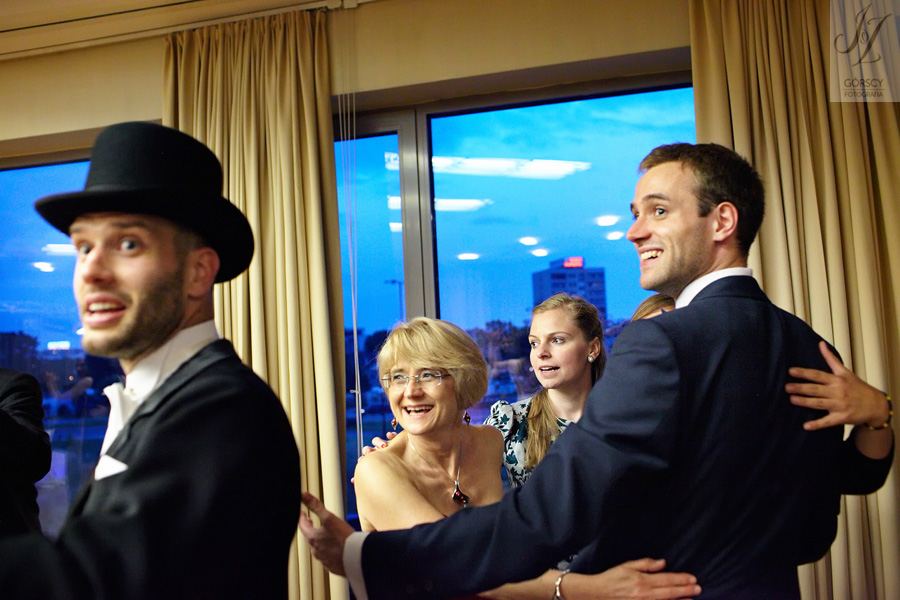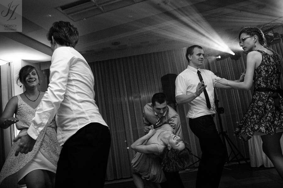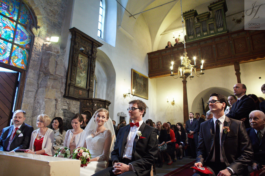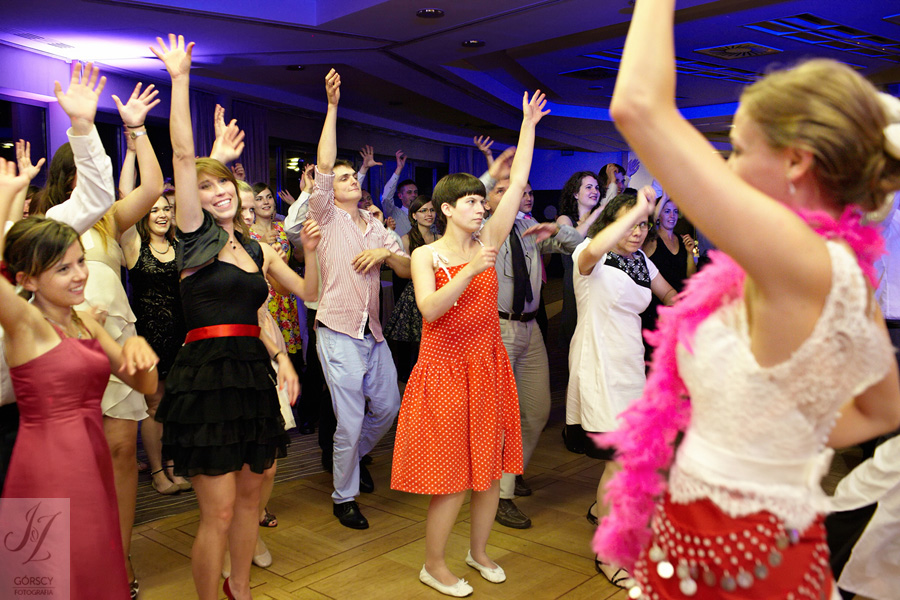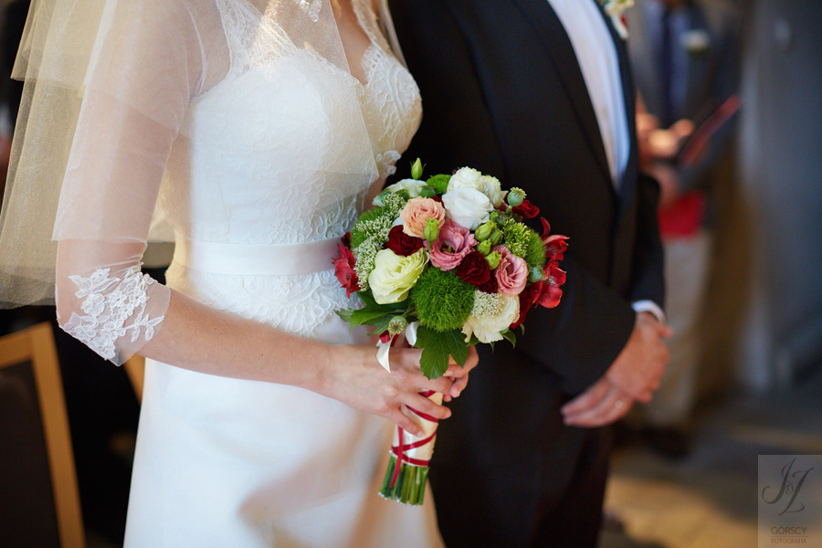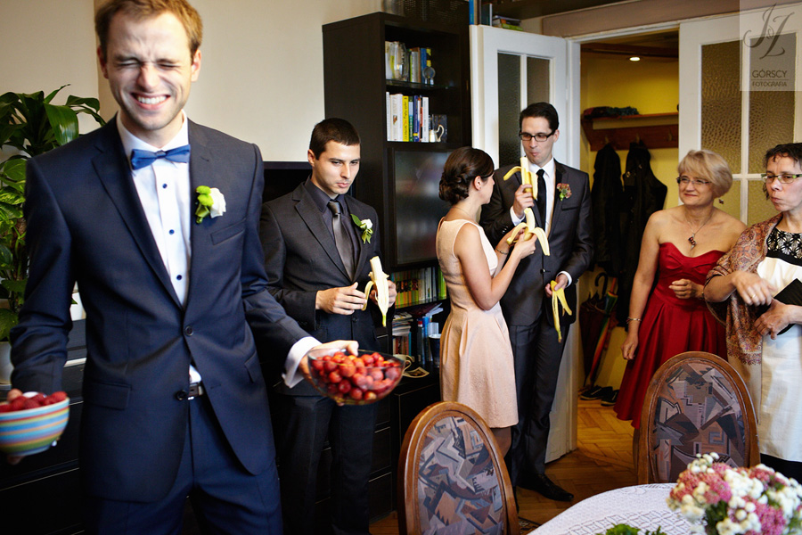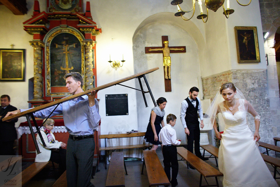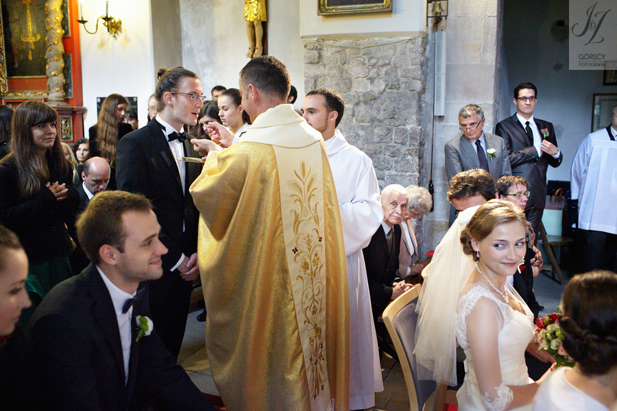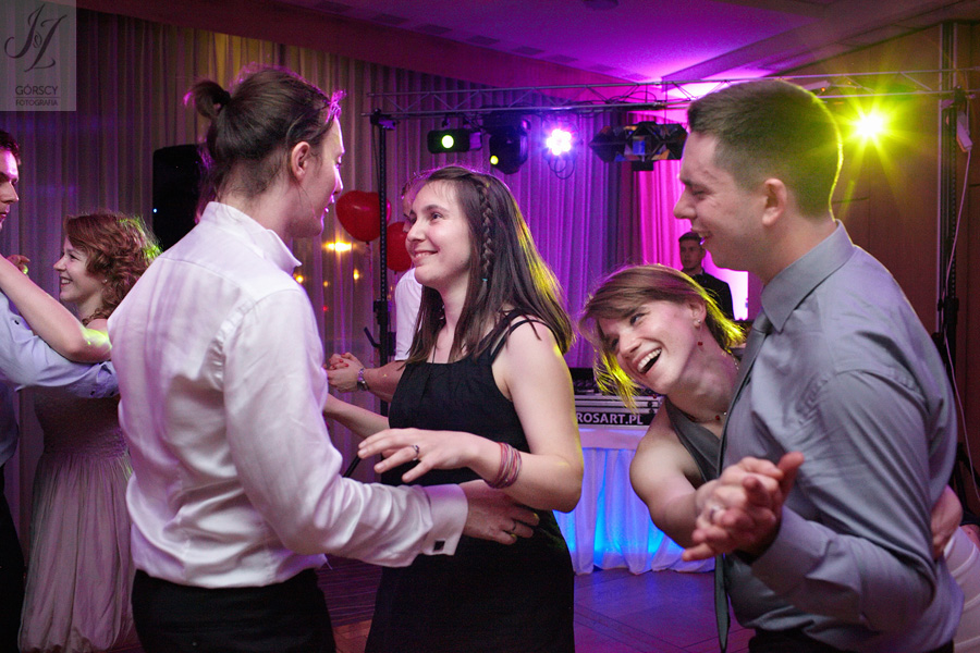 Lipiec. Deszczowy, bo, jak wiadomo, mamy w naszym kraju dwie pory roku: zimę i porę deszczową. No więc tak naprawdę wszystko zaczęło się zimą, kiedy fotografowaliśmy ślub Pauliny i Michała, który miał miejsce w Bazylice Mariackiej. Ślubu udzielał przyjaciel Młodej Pary – ksiądz Andrzej Jeleń, a nasza, jak się okazało, przyszła panna młoda, Magda, śpiewała w chórze. Na weselu Pauliny i Michała właśnie poznaliśmy bliżej Magdę i Kubę oraz całą, niezwykłą i pełną energii grupę przyjaciół. Ogromnie się ucieszyliśmy, że będziemy mieli okazję spotkać się ponownie na ich ślubie. Po raz kolejny uczestniczyliśmy w niezwykłej Mszy św. w kościele Najświętszego Salwatora, który na tamten moment zamienił się w dom. Mały dom, który musiał pomieścić ponad sto osób, trzeba go było więc nieco przemeblować, poprzenosić kościelne ławki, by zrobić miejsce dla chóru, w którym Panna Młoda po raz pierwszy nie zaśpiewała, bo tym razem miała przed sobą inne zadania. Ślubu znów udzielił ksiądz Andrzej Jeleń i po raz kolejny była to przepiękna ceremonia, pełna wzruszeń i serdecznej, rodzinnej atmosfery. Nawet ponura aura przestała mieć jakiekolwiek znaczenie, tym bardziej, że Młoda Para miała na nią specjalny sposób. W czasie życzeń rozdała gościom czerwone balony-serca, które ożywiły kolorem wszystko dookoła. A potem, tramwajem, pojechały z nami na energetyczne wesele.