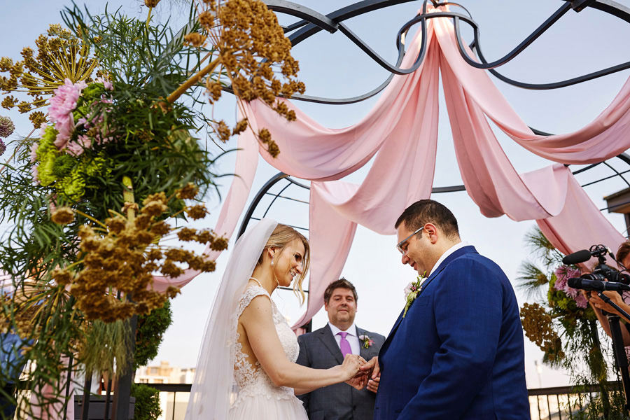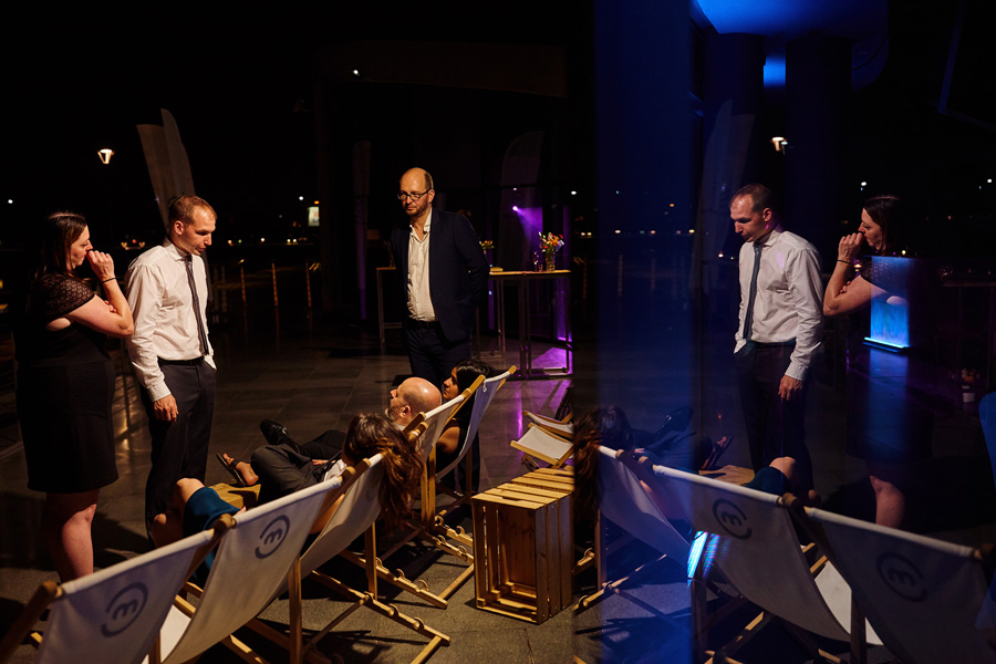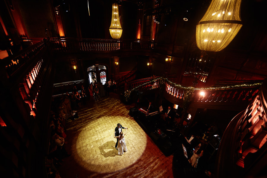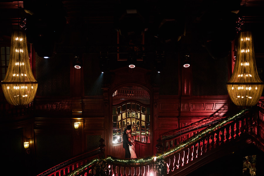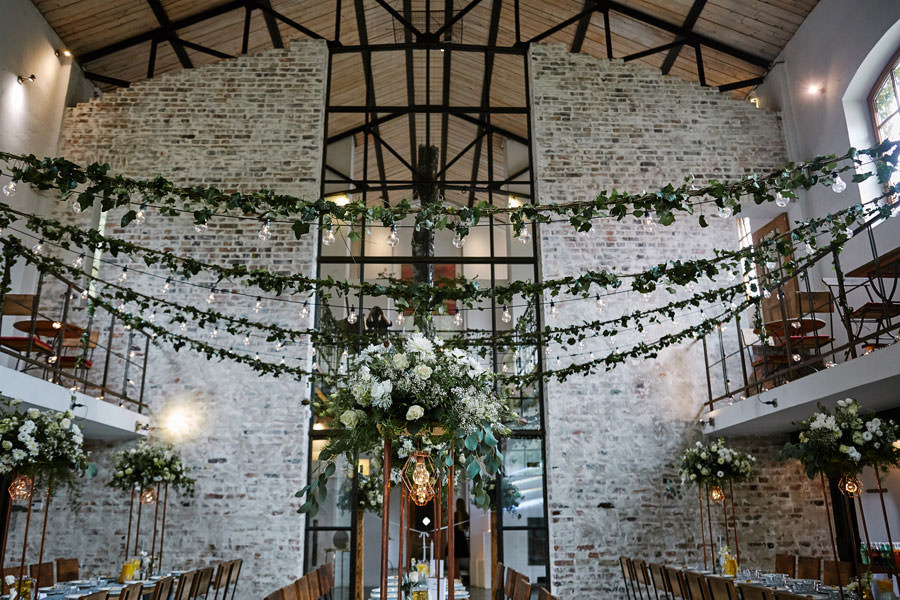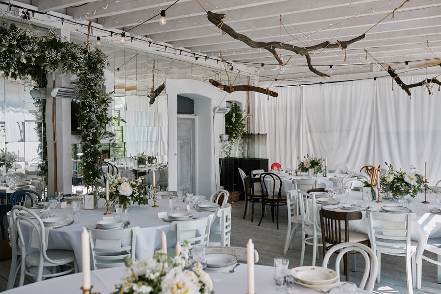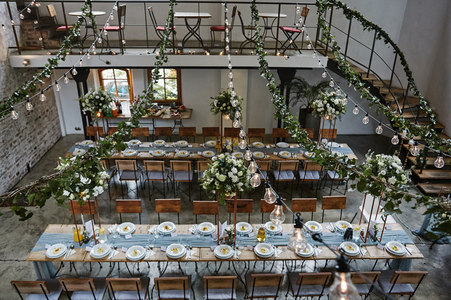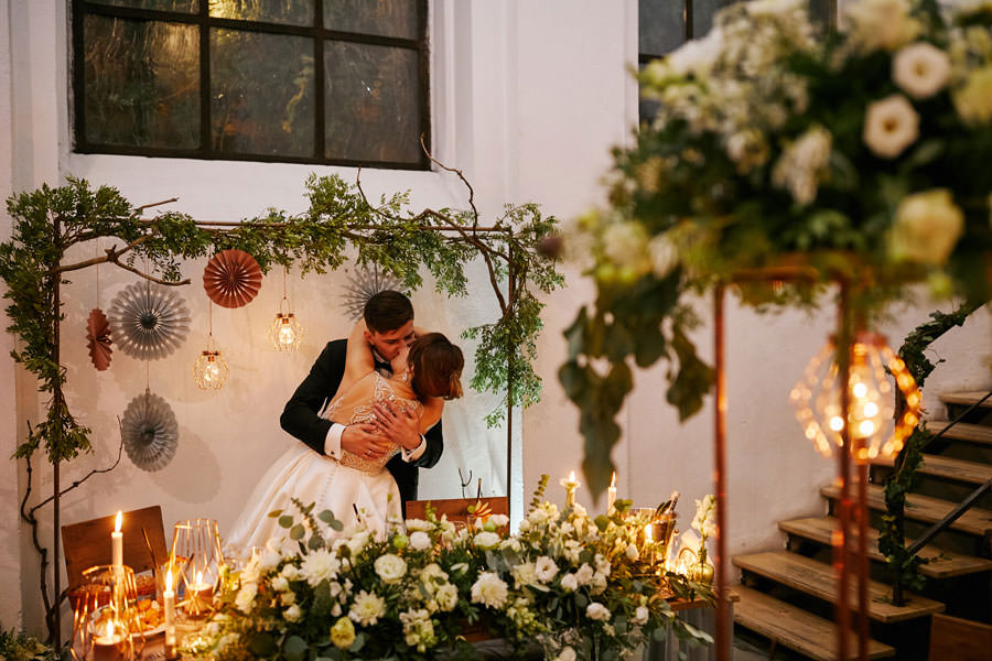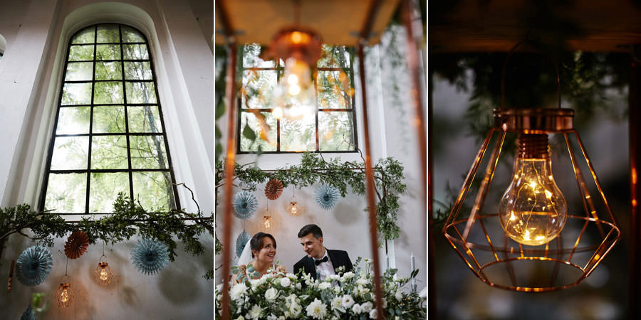 Przestrzenie Impresji to nie tylko miejsce na wesele, ale również na ślub. Ślub cywilny może odbyć się na pierwszym piętrze budynku, ale dzięki jego ażurowej konstrukcji i przeszkleniom goście wesela mogli już podziwiać wnętrza, gdzie zaraz będą celebrować radość młodych małżonków. Dekoratorzy postawili na zieleń (girlandy bluszczu, nawiązujące do Parku Hutniczego), na światło (setki drobnych żarówek, a także duże żarówki zdobiące stoły) i na miedź. Elementem dodatkowym były papierowe wycinanki, delikatne ażury – nawiązujące do samej konstrukcji budynku. A całość reportażu można obejrzeć tu.