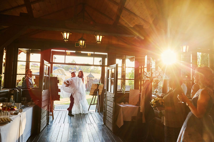Człowiek jedzie sobą północną obwodnicą Krakowa i widzi Hotel Witek. Nowocześnie – wiecie – szkło, beton, wszystko błyszczy. Kto by się spodziewał, że w niedalekiej odległości, wśród drzew, stoi sobie ukryta Witkowa Chata. Chata, która zdecydowanie musiała znaleźć się na liście „najpiękniejsze miejsca na wesele”. Jest to spore zaskoczenie, że hotel, poza salami konferencyjno-bankietowymi, posiada rustykalną chatę, idealną na imprezy w stylu boho. Chata sprawia wrażenie niewielkiej, ale bez trudu pomieści 120 osób, a to już wcale nie jest małe wesele. Szczególny klimat chata zawdzięcza nie tylko temu, że jest drewniana. Jej piękno tkwi w przeszkleniach. Chata ma dużo okien, niemal na całej długości ścian. Dzięki nim chata sprawia wrażenie ażurowej konstrukcji, pełnej światła. Dodatkowo ekspozycja okien na południe sprawia, że w momencie rozpoczęcia przyjęcia weselnego w chacie mamy najpiękniejsze światło.