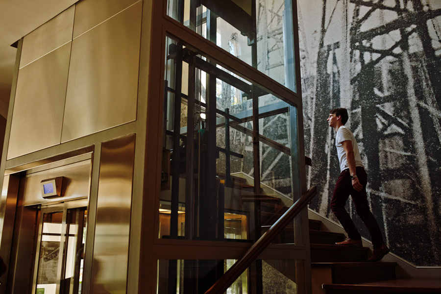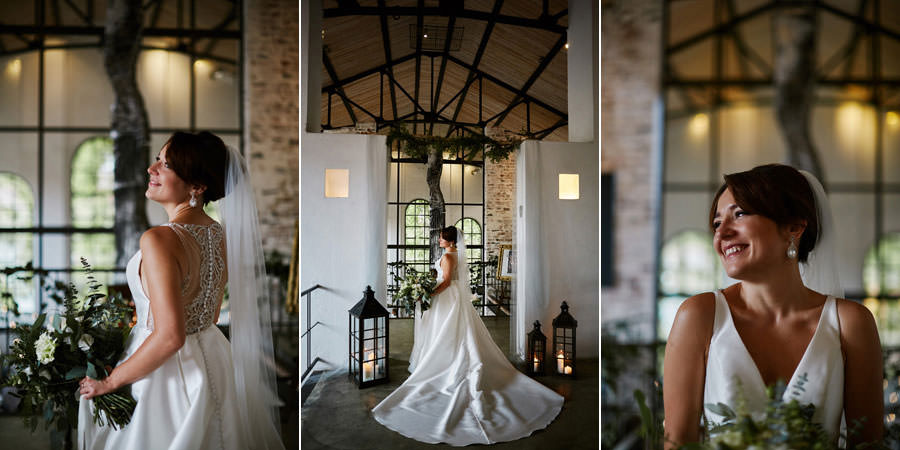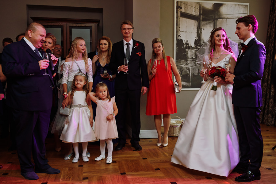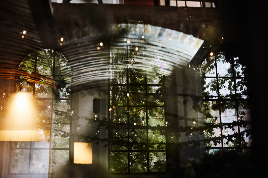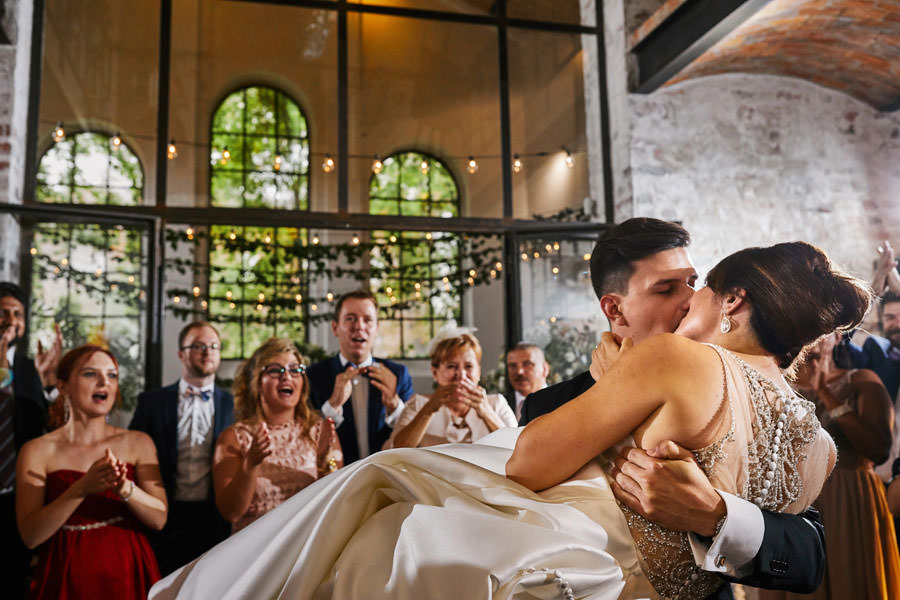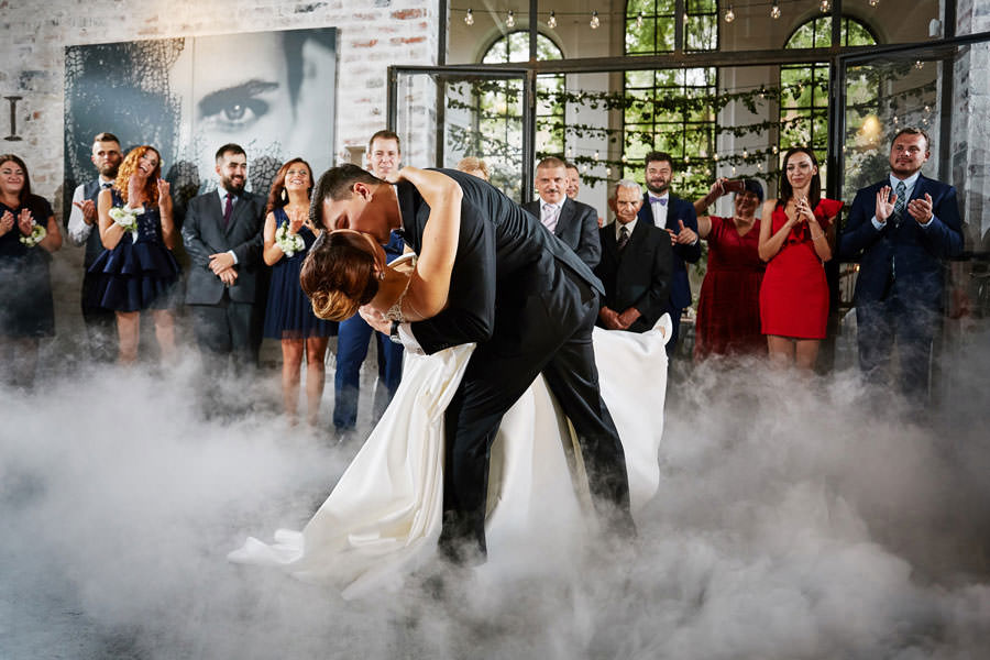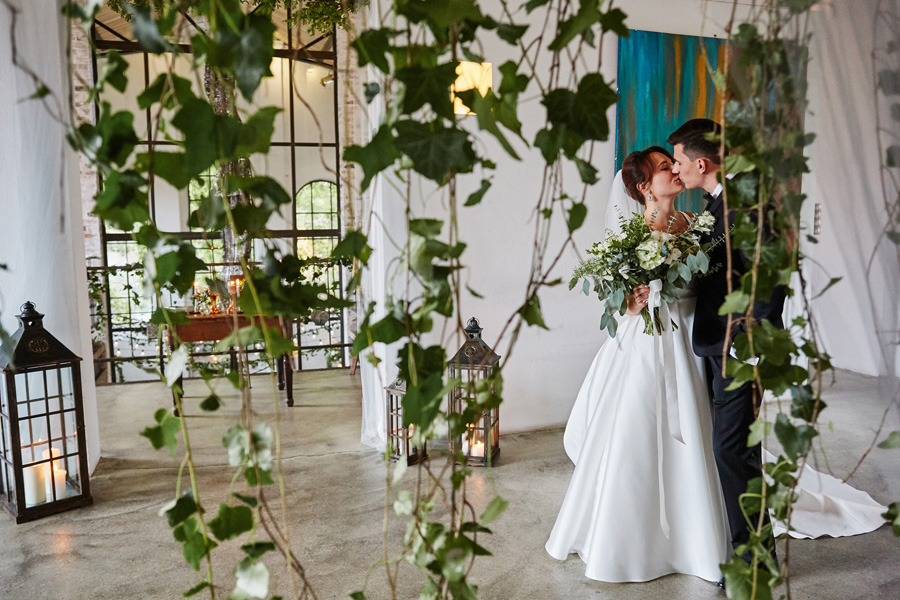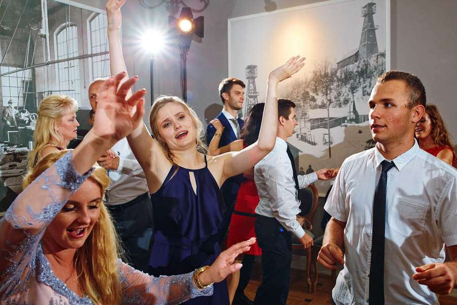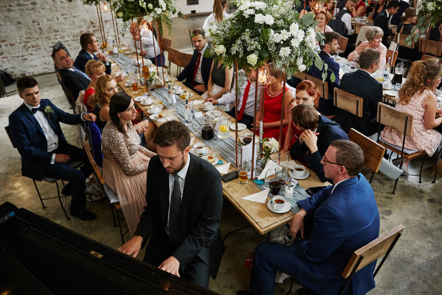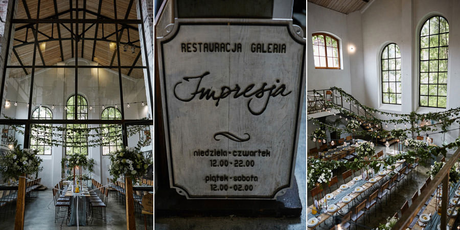 Kolejne piękne miejsce na naszej mapie top miejsc na wesele to Impresja w Zabrzu. Miejsce absolutnie niezwykłe, w którym zakochaliśmy się od pierwszego wejrzenia. Wysokie okna z zielenią w tle, surowa cegła, spękana, betonowa podłoga, ażurowe drewniane schody i balkoniki. Aż trudno uwierzyć, że to poprzemysłowa przestrzeń łaźni Huty Zabrze. Gdybym miała krótko określić klimat tego wesela, stawiałabym na postindustrialno-artystyczny. Minimalistyczny charakter wnętrz podkreślają czarno-białe zdjęcia. Ciekawe portrety, ale nade wszystko zdjęcia pokazujące historię tego miejsca. To dzięki nim z niemałym zaskoczeniem ją odkrywamy.