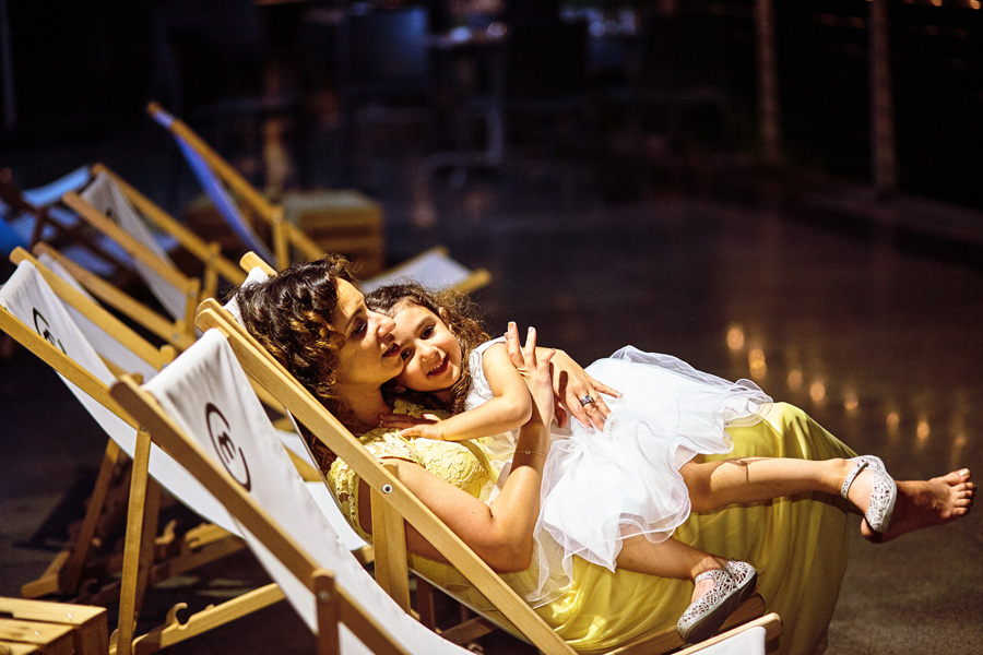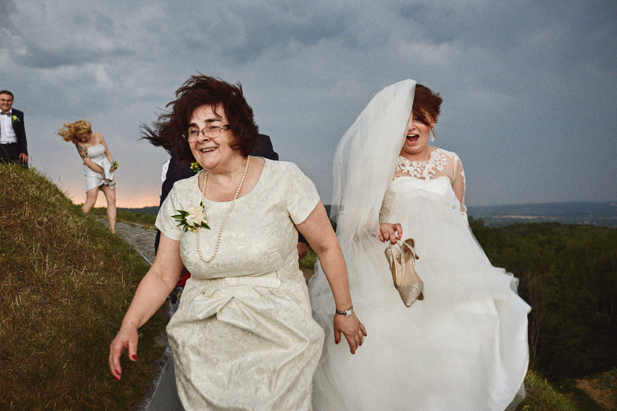Właśnie z takiej wyprawy na Kopiec podczas wesela, by zobaczyć panoramę miasta, pochodzi jedno z naszych najbardziej rozpoznawalnych zdjęć. Wycieczka na szczyt Kopca miała miejsce tuż po obiedzie. Był to upalny dzień lipca. Było duszno, a niebo miało taki kolor, że raczej nie pozostawiało złudzeń, że burza nas ominie. Zdjęcie pokazuje uciekającą pannę młodą (z butami w dłoni) i jej mamę. Dla takich właśnie chwil robi się reportaż ślubny :).