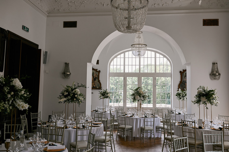 Zanim przedstawię te miejsca, widziane naszym okiem, jeszcze krótkie post scriptum do przyszłych małżonków, którzy są na etapie poszukiwań. Czasem słyszę od Was, że jakieś miejsce skradło Wasze serce, ale jednocześnie obawiacie się, bo przestrzeń w środku jest podzielona. Jeśli jest to pałac lub dwór, faktycznie jest tam zwykle sala balowa, hall lub foyer, a wokół znajdują się komnaty. Wasze obawy wiążą się z tym, że goście będą podzieleni i nie będą widzieć parkietu.