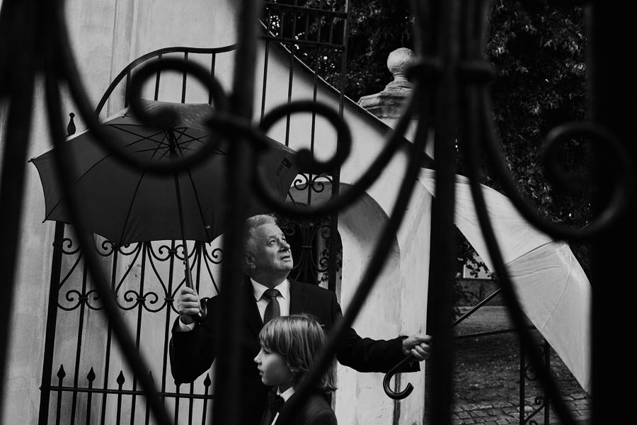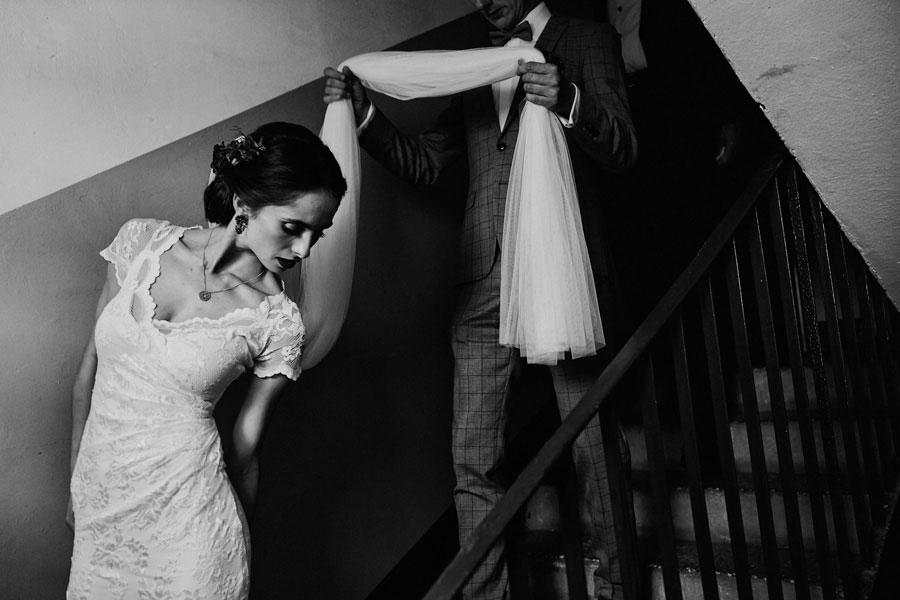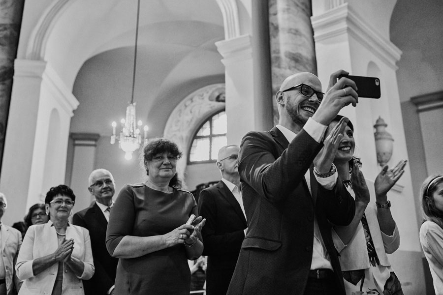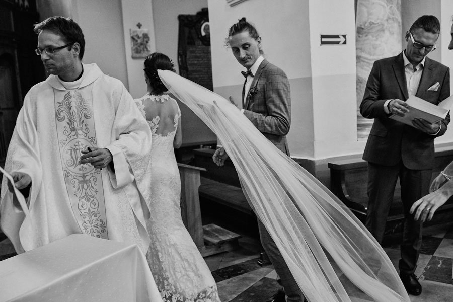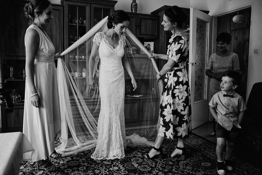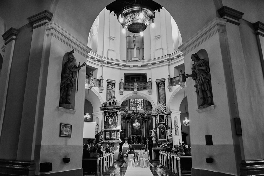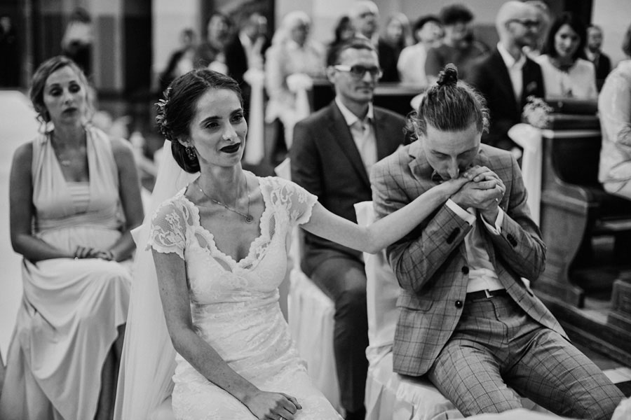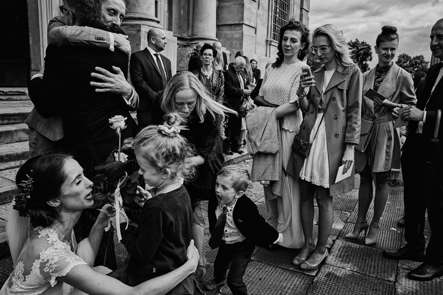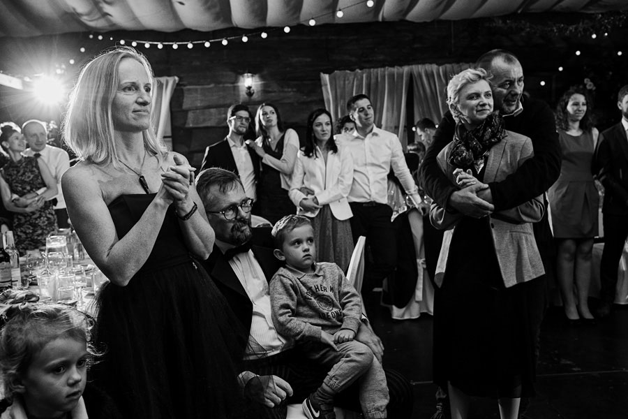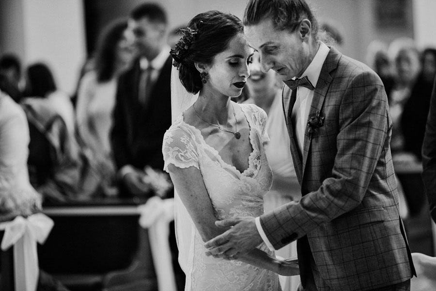 Przyjęło się w fotografii ślubnej, że w reportażu miesza się zdjęcia kolorowe z czarno-białymi. Prawie zawsze wyższość daje się tym pierwszym. Dzieje się tak ze względu na fakt, że obecność czarno-białych zdjęć w fotografii ślubnej jest dość kontrowersyjna. Powszechna jest opinia, iż czarno-białe zdjęcia są smutne i nie pasują do radosnego wydarzenia, jakim jest ślub. Nie krytykuję tego podejścia. Niemniej jednak tym, przez pryzmat czego patrzę na ich wartość, nie jest kolor lub jego brak, ale treść. Ogromne znaczenie ma też forma. Reportaże ślubne są długie, ponieważ nie jest to wyłącznie dokument o wydarzeniu. To przede wszystkim historia o ludziach. W związku z tym ważne są ich emocje, wzajemne interakcje. Wymieszanie koloru z czarno-bielą stwarza wrażenie różnorodności. Pozwala naszym oczom i mózgowi na chwilę się oderwać, odpocząć.