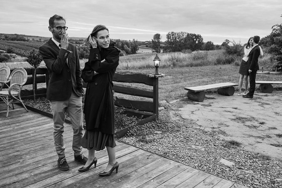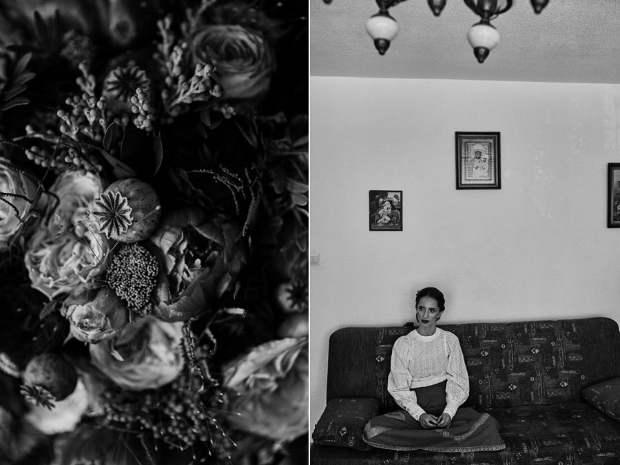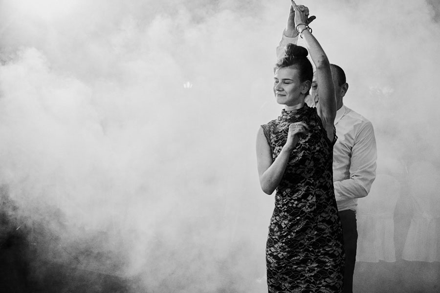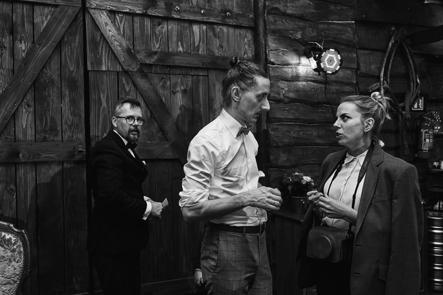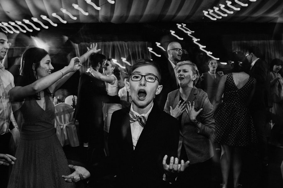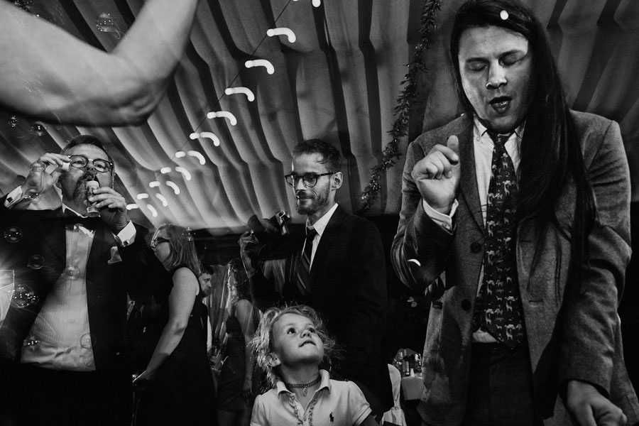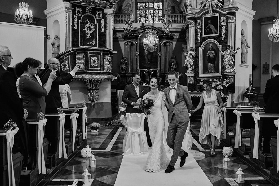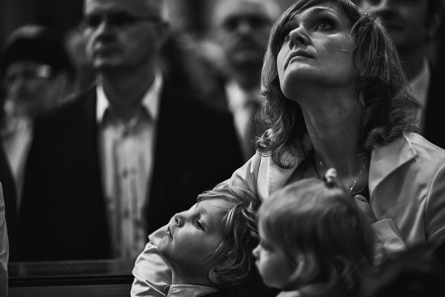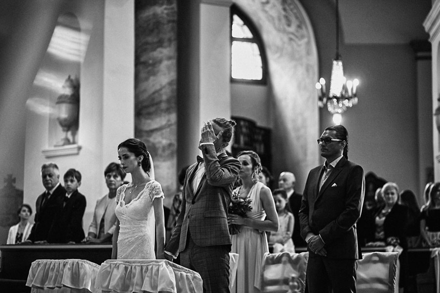 Przyjęło się w fotografii ślubnej, że w reportażu miesza się zdjęcia kolorowe z czarno-białymi. Prawie zawsze wyższość daje się tym pierwszym. Dzieje się tak ze względu na fakt, że obecność czarno-białych zdjęć w fotografii ślubnej jest dość kontrowersyjna. Powszechna jest opinia, iż czarno-białe zdjęcia są smutne i nie pasują do radosnego wydarzenia, jakim jest ślub. Nie krytykuję tego podejścia. Niemniej jednak tym, przez pryzmat czego patrzę na ich wartość, nie jest kolor lub jego brak, ale treść. Ogromne znaczenie ma też forma. Reportaże ślubne są długie, ponieważ nie jest to wyłącznie dokument o wydarzeniu. To przede wszystkim historia o ludziach. W związku z tym ważne są ich emocje, wzajemne interakcje. Wymieszanie koloru z czarno-bielą stwarza wrażenie różnorodności. Pozwala naszym oczom i mózgowi na chwilę się oderwać, odpocząć.