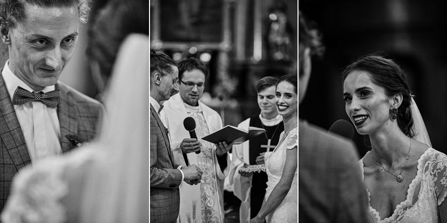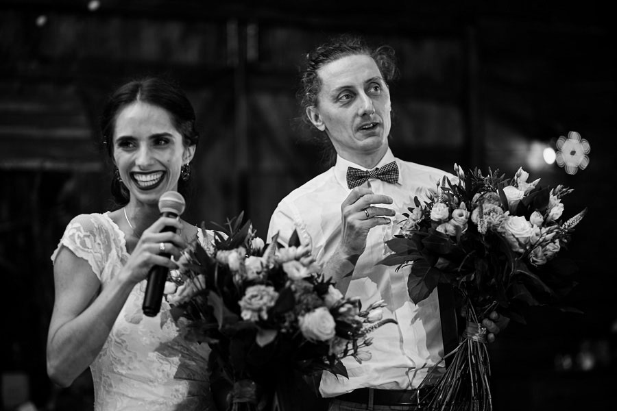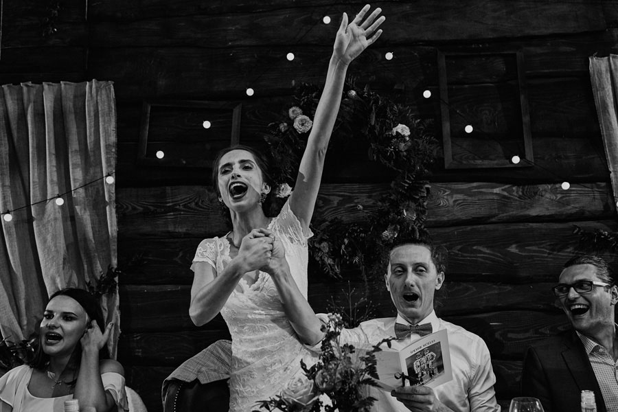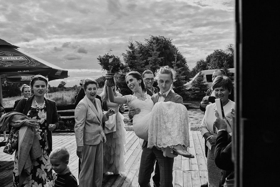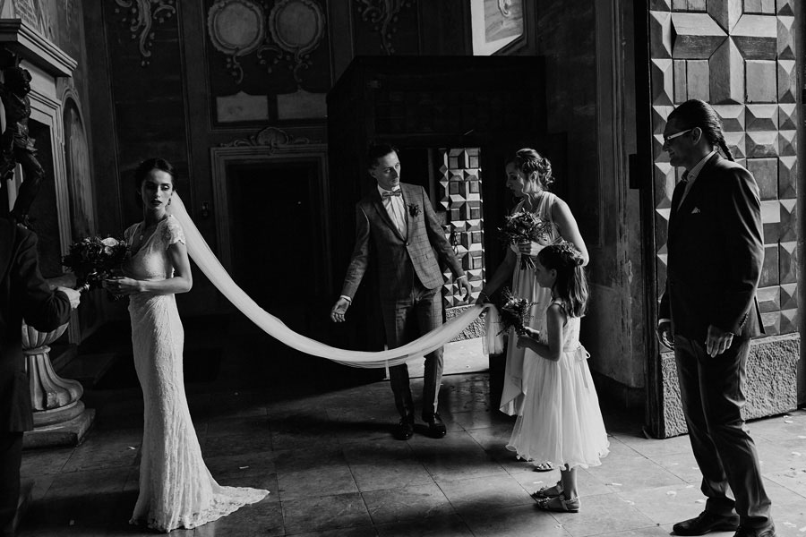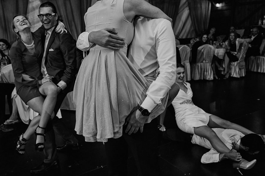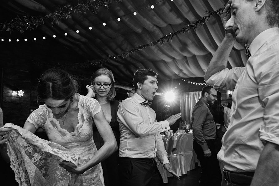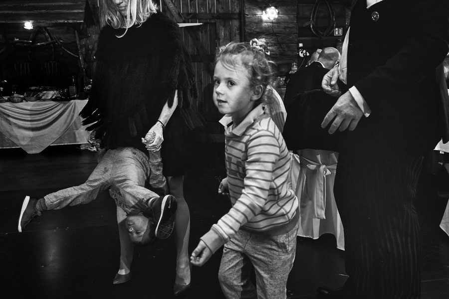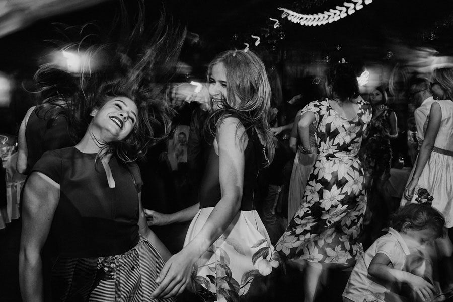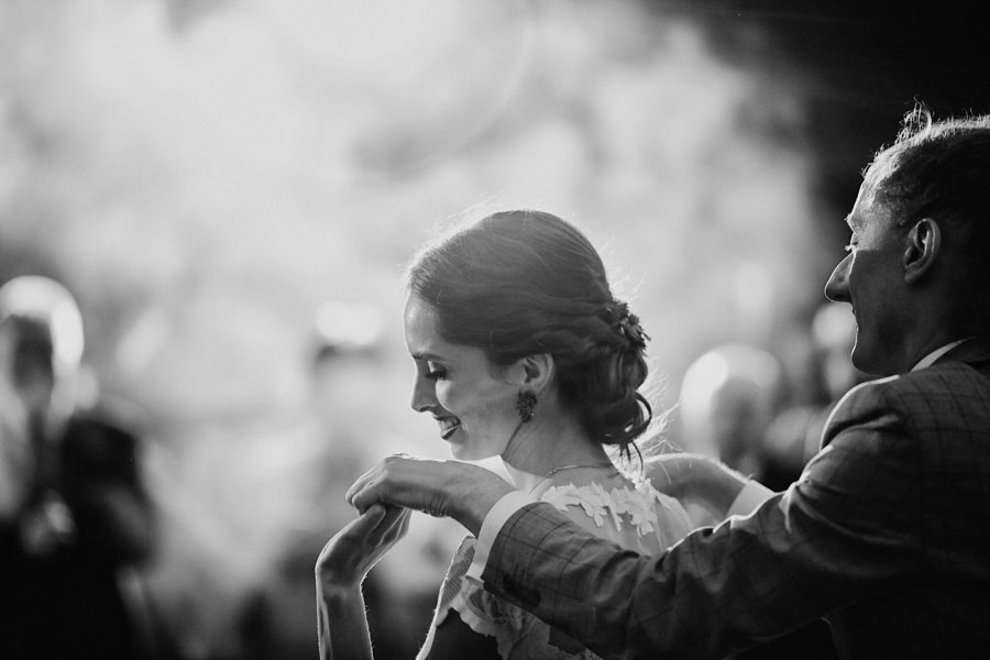 Przyjęło się w fotografii ślubnej, że w reportażu miesza się zdjęcia kolorowe z czarno-białymi. Prawie zawsze wyższość daje się tym pierwszym. Dzieje się tak ze względu na fakt, że obecność czarno-białych zdjęć w fotografii ślubnej jest dość kontrowersyjna. Powszechna jest opinia, iż czarno-białe zdjęcia są smutne i nie pasują do radosnego wydarzenia, jakim jest ślub. Nie krytykuję tego podejścia. Niemniej jednak tym, przez pryzmat czego patrzę na ich wartość, nie jest kolor lub jego brak, ale treść. Ogromne znaczenie ma też forma. Reportaże ślubne są długie, ponieważ nie jest to wyłącznie dokument o wydarzeniu. To przede wszystkim historia o ludziach. W związku z tym ważne są ich emocje, wzajemne interakcje. Wymieszanie koloru z czarno-bielą stwarza wrażenie różnorodności. Pozwala naszym oczom i mózgowi na chwilę się oderwać, odpocząć.