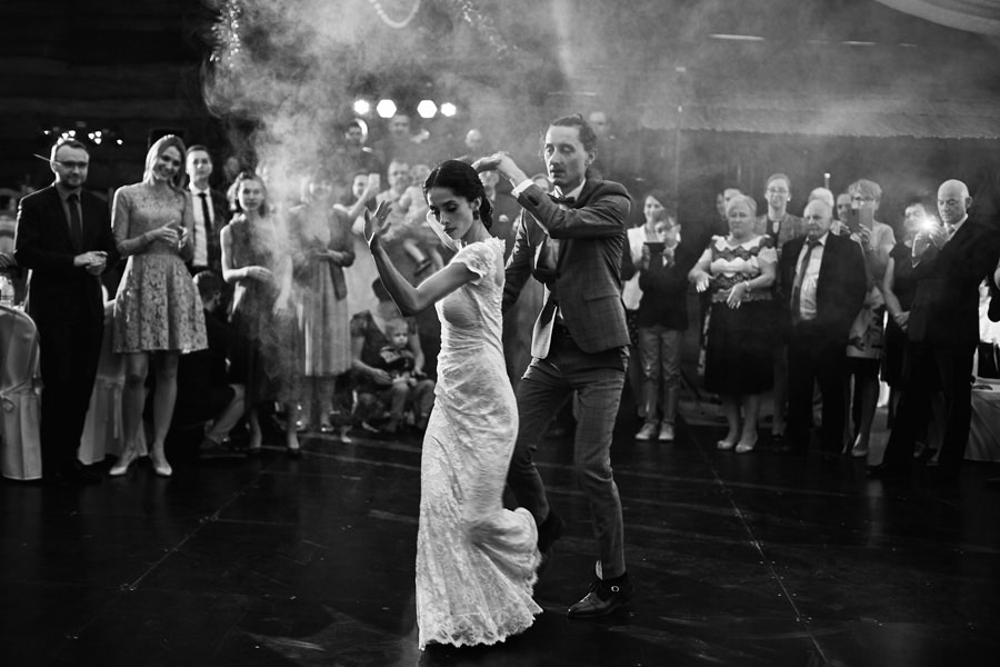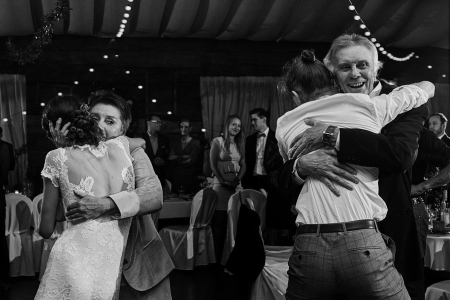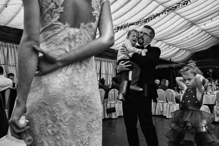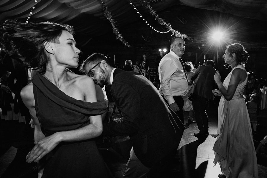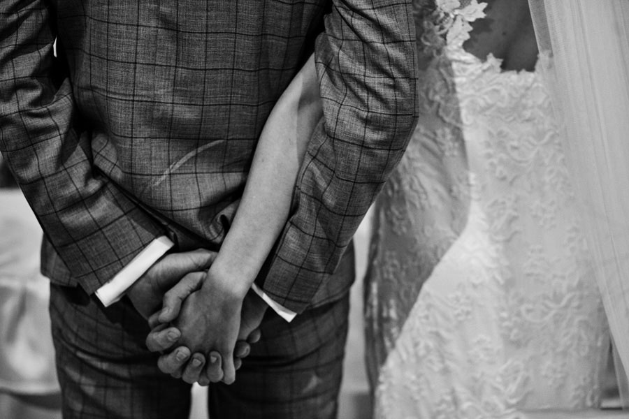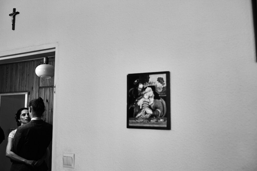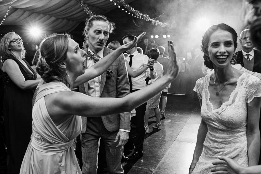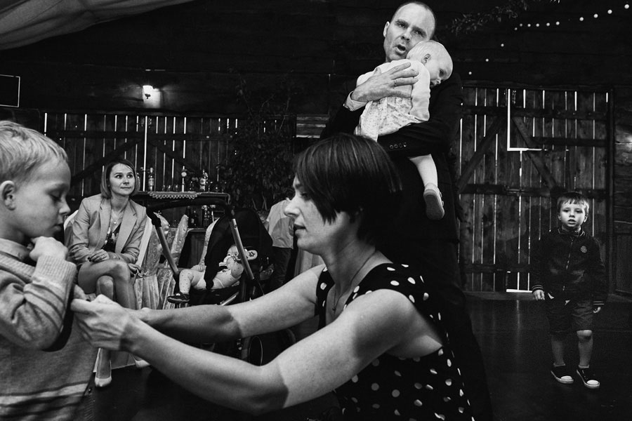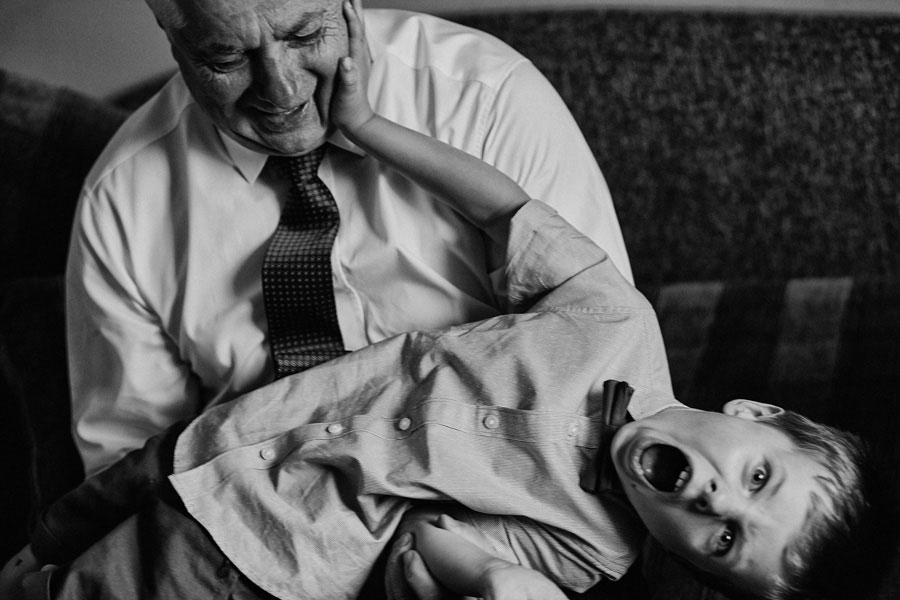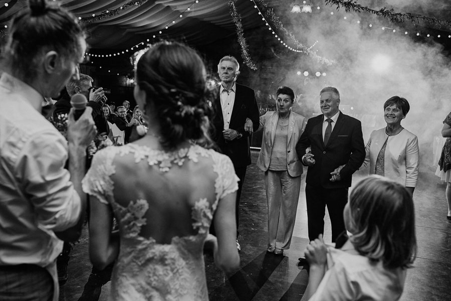 Przyjęło się w fotografii ślubnej, że w reportażu miesza się zdjęcia kolorowe z czarno-białymi. Prawie zawsze wyższość daje się tym pierwszym. Dzieje się tak ze względu na fakt, że obecność czarno-białych zdjęć w fotografii ślubnej jest dość kontrowersyjna. Powszechna jest opinia, iż czarno-białe zdjęcia są smutne i nie pasują do radosnego wydarzenia, jakim jest ślub. Nie krytykuję tego podejścia. Niemniej jednak tym, przez pryzmat czego patrzę na ich wartość, nie jest kolor lub jego brak, ale treść. Ogromne znaczenie ma też forma. Reportaże ślubne są długie, ponieważ nie jest to wyłącznie dokument o wydarzeniu. To przede wszystkim historia o ludziach. W związku z tym ważne są ich emocje, wzajemne interakcje. Wymieszanie koloru z czarno-bielą stwarza wrażenie różnorodności. Pozwala naszym oczom i mózgowi na chwilę się oderwać, odpocząć.