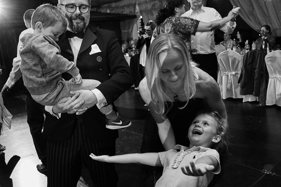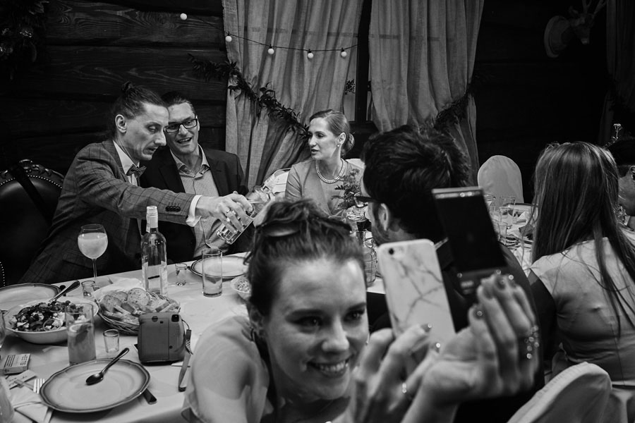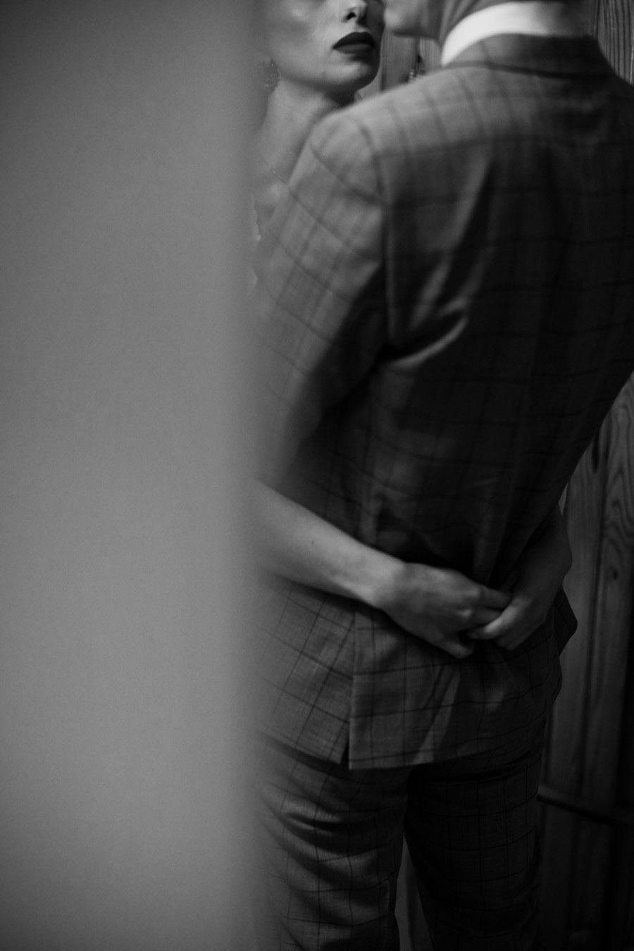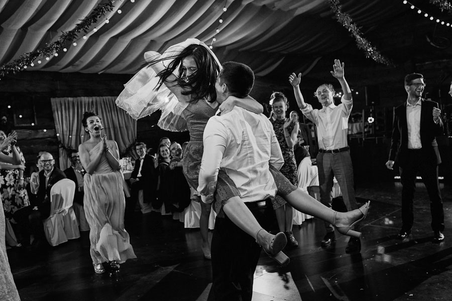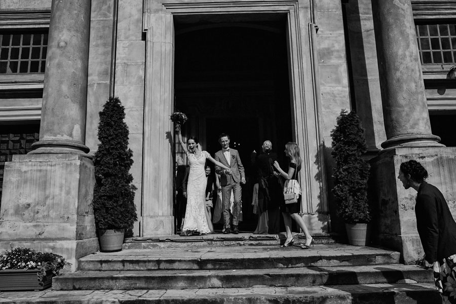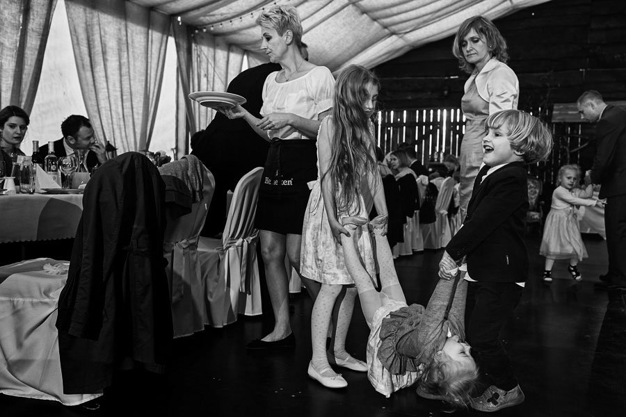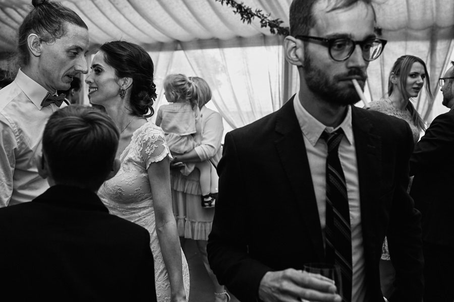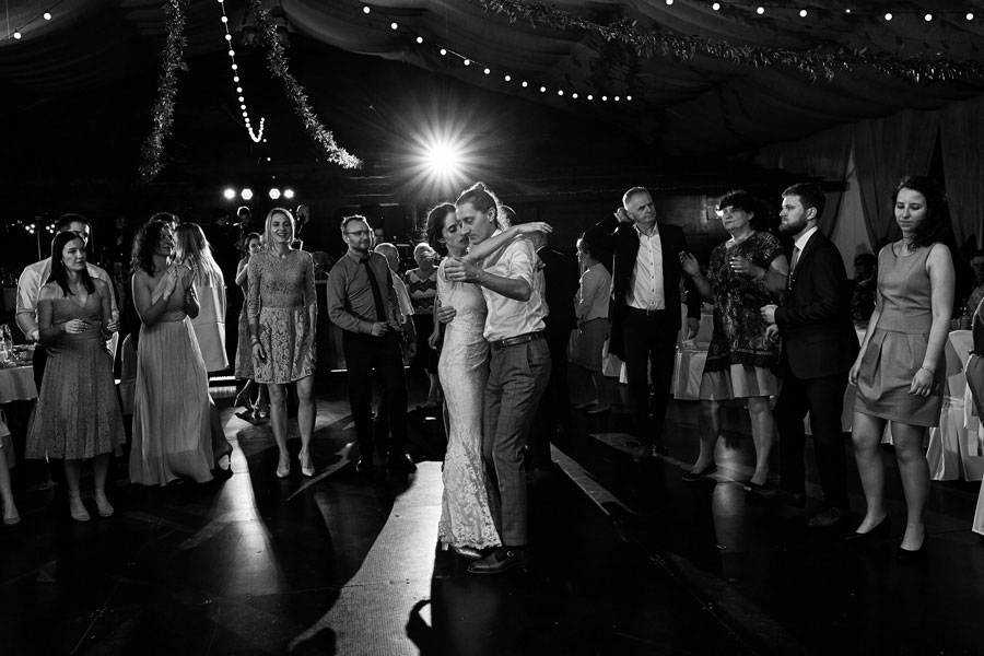 Przyjęło się w fotografii ślubnej, że w reportażu miesza się zdjęcia kolorowe z czarno-białymi. Prawie zawsze wyższość daje się tym pierwszym. Dzieje się tak ze względu na fakt, że obecność czarno-białych zdjęć w fotografii ślubnej jest dość kontrowersyjna. Powszechna jest opinia, iż czarno-białe zdjęcia są smutne i nie pasują do radosnego wydarzenia, jakim jest ślub. Nie krytykuję tego podejścia. Niemniej jednak tym, przez pryzmat czego patrzę na ich wartość, nie jest kolor lub jego brak, ale treść. Ogromne znaczenie ma też forma. Reportaże ślubne są długie, ponieważ nie jest to wyłącznie dokument o wydarzeniu. To przede wszystkim historia o ludziach. W związku z tym ważne są ich emocje, wzajemne interakcje. Wymieszanie koloru z czarno-bielą stwarza wrażenie różnorodności. Pozwala naszym oczom i mózgowi na chwilę się oderwać, odpocząć.