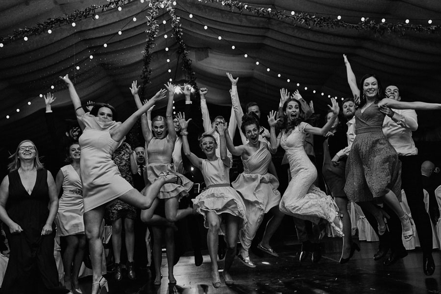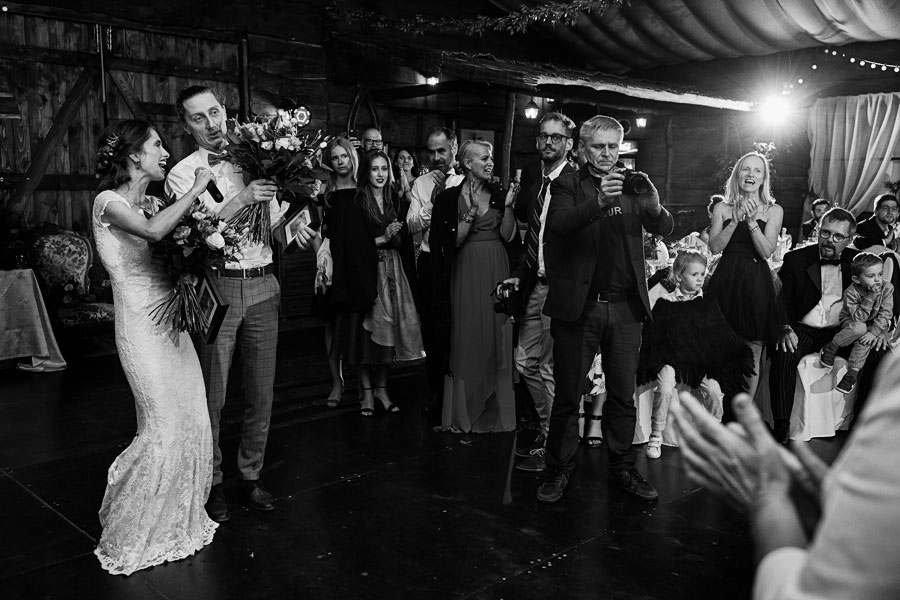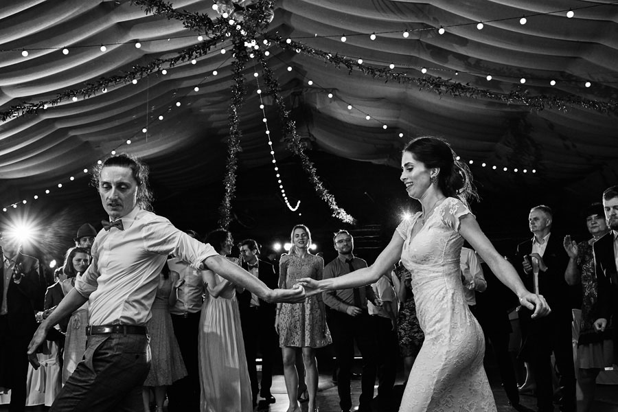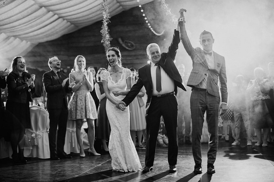 Myśleliśmy, że to będzie wesele w staropolskim dworze, a okazało się, że w pobliskiej stodole. Z pewnością ciekawszej. Zadaszonej namiotowym drapowaniem, ozdobionej bluszczem i girlandami świateł. Zatem nieoczekiwanie – wesele w stodole, a do tego przepiękne, gustowne dekoracje, trochę rustykalne, ale w zasadzie eklektyczne, ponieważ klimat sielski i wiejski urozmaicały złote, buduarowe czy też dworskie dodatki – świeczniki, fotele na toczonych nogach, szezlongi. Do tego zespół – grający muzykę nowoczesną i jazzową, i rozentuzjazmowany tłum, w którym wielu było wybornych tancerzy. Nocą ognisko. A teraz wspomnienia. A w nich jedno szczególne – że nie chciało się stamtąd wychodzić!