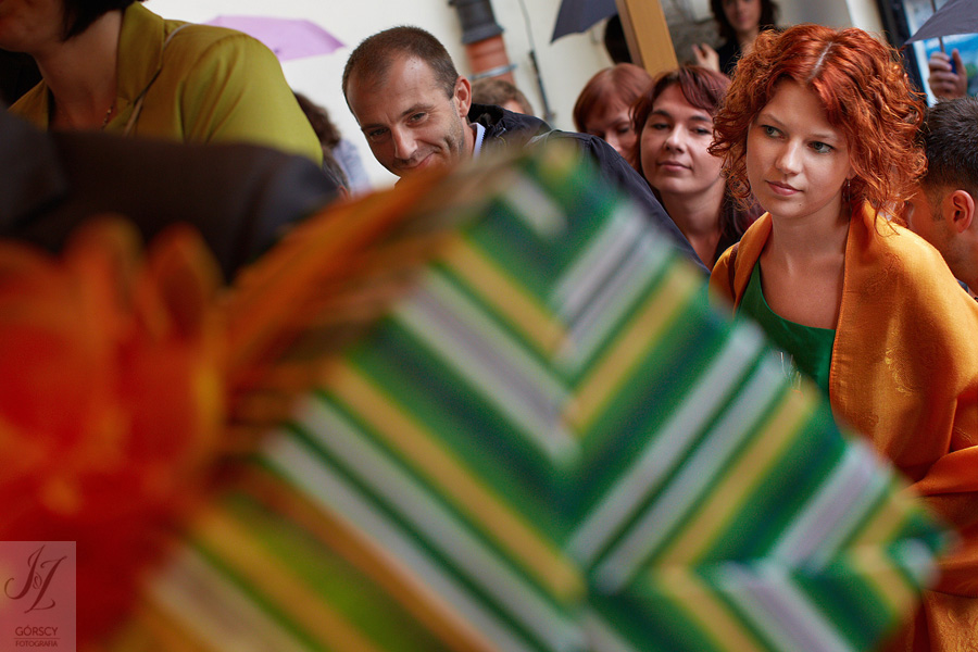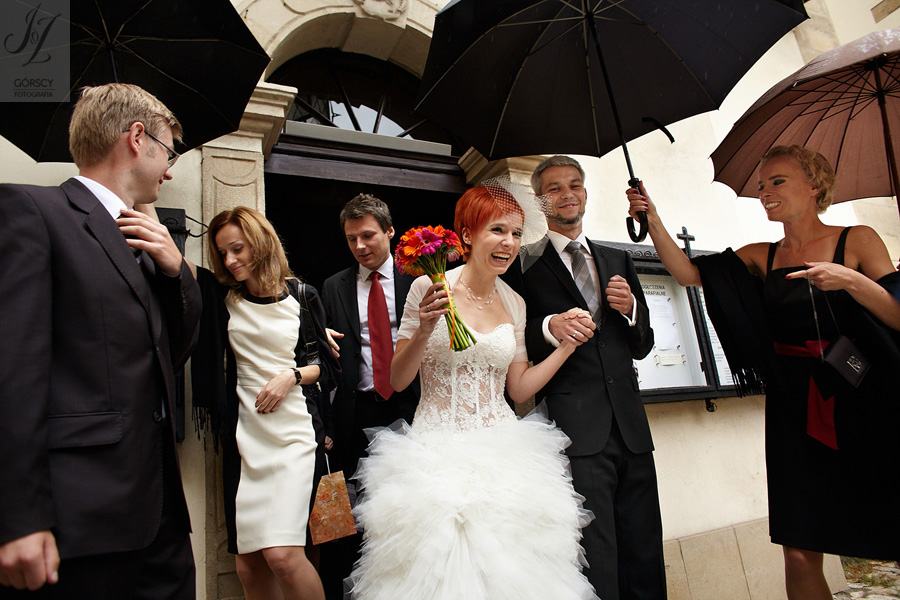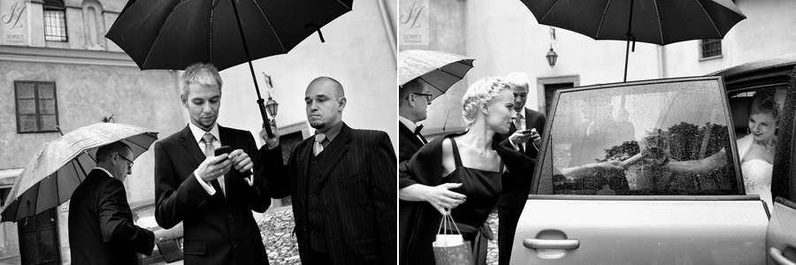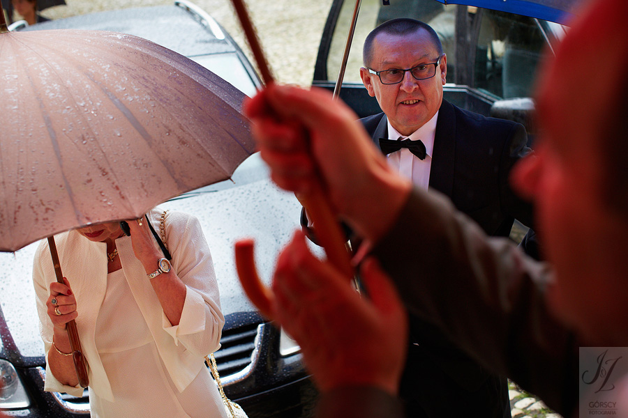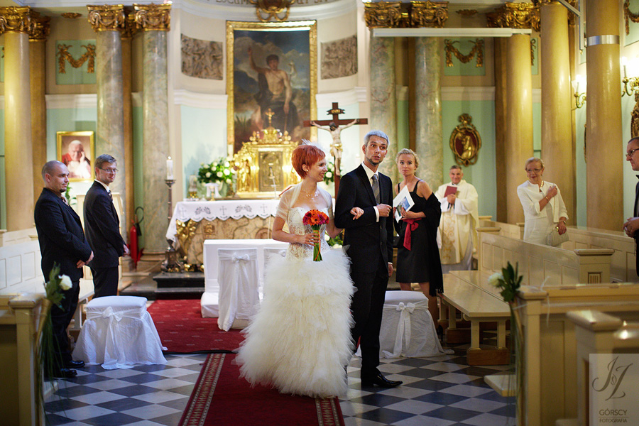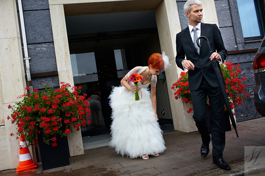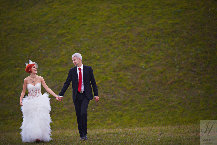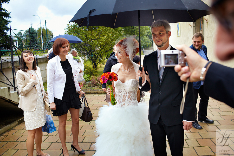 Olę i Marcina poznaliśmy już wcześniej, gdyż we wrześniu 2011 mieliśmy ogromną przyjemność fotografować ślub siostry Oli – Agaty. Już wtedy czuliśmy, że świetnie nam się współpracuje z całą rodziną, ale gdy tym razem w ramach powitania usłyszeliśmy od rodziców Oli – „Szkoda, że nie mamy już więcej córek” – wiedzieliśmy, że przed nami bardzo dobry dzień. Padało trochę, owszem, ale w żaden sposób nie ostudziło to entuzjazmu naszej energetycznej pary i ich gości. Światło słoneczne tymczasem bardzo miło dopomogło nam w czasie sesji, nasycając kolory, by zdjęcia były tak barwne, jak te dwa charaktery, czyli Ola i Marcin :).