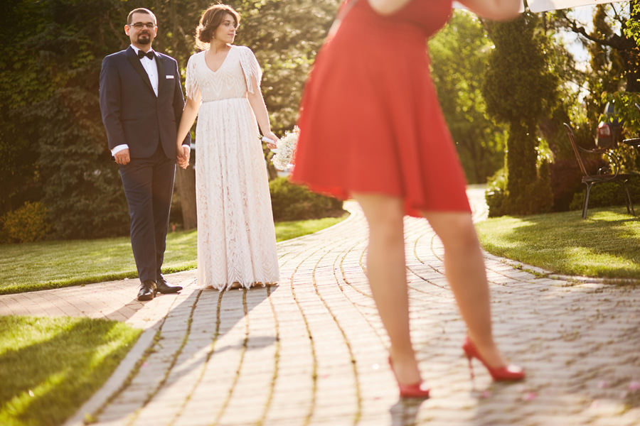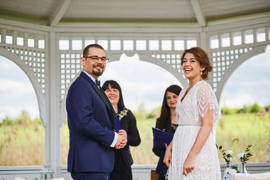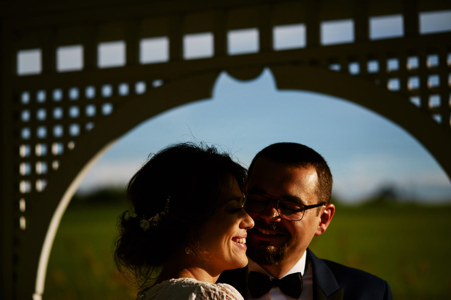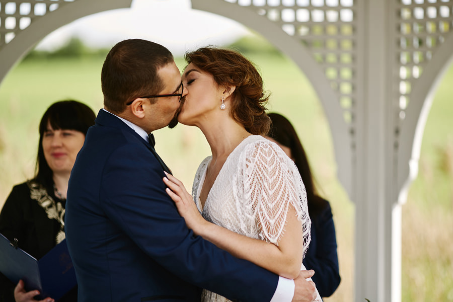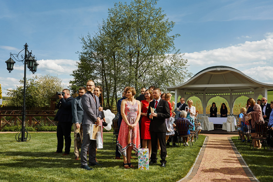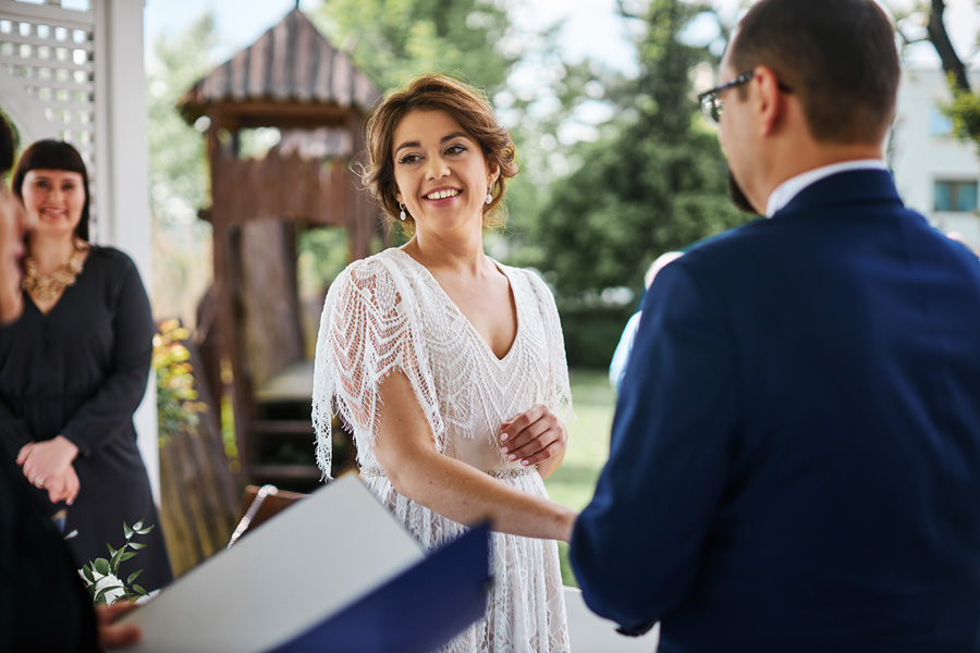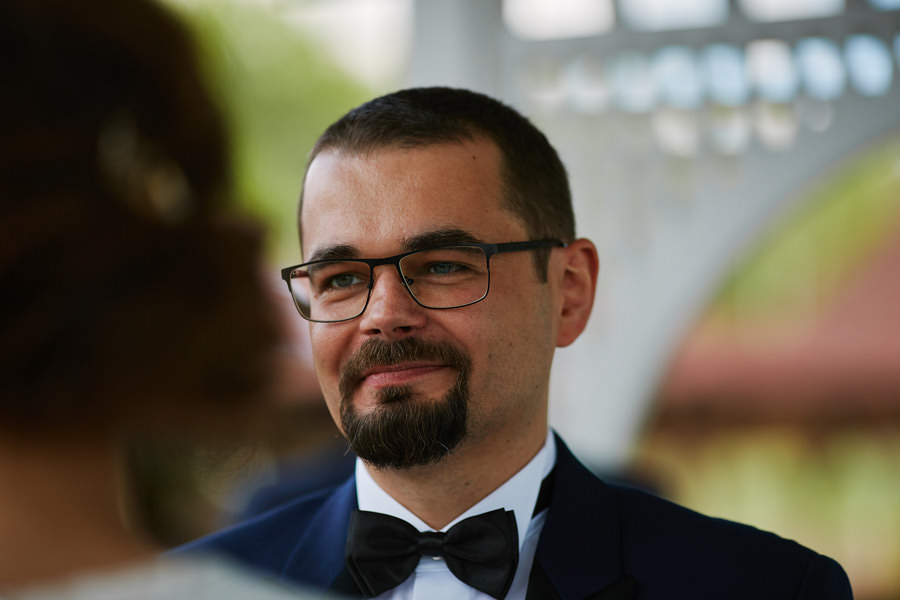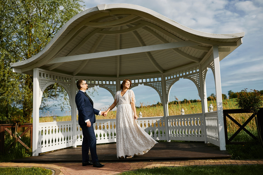Ażurowa biała altanka, piękne otoczenie, słoneczne popołudnie – idealne warunki na ślub w plenerze. Mieliśmy wielkie szczęście, że słońce tego dnia było nienachalne, a godzina ślubu popołudniowa, co stworzyło idealne warunki do fotografowania. Zapamiętałam z tego ślubu szczególną atmosferę bliskości. Widać było, że to był wyczekany dzień szczęścia, że para młoda jest ze sobą od lat i wszyscy serdecznie im kibicują, znają ich i otaczają miłością.