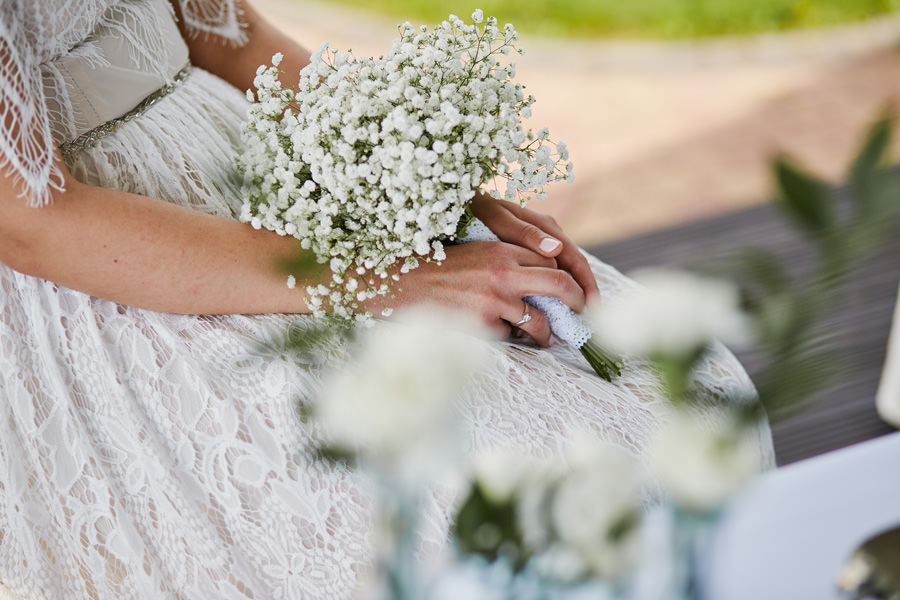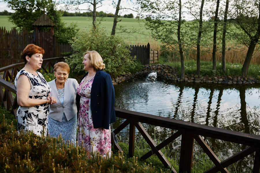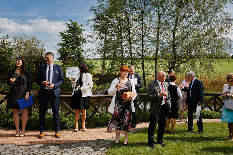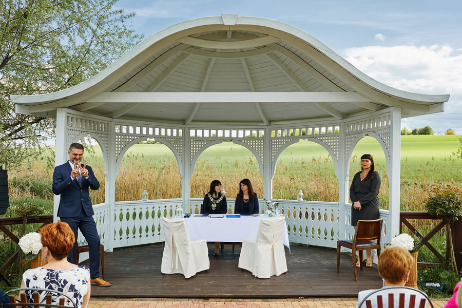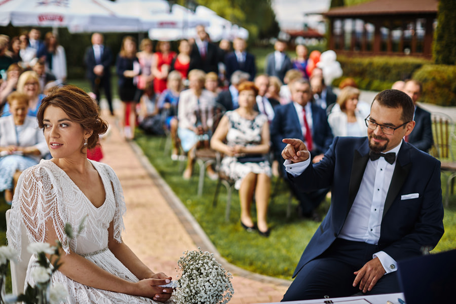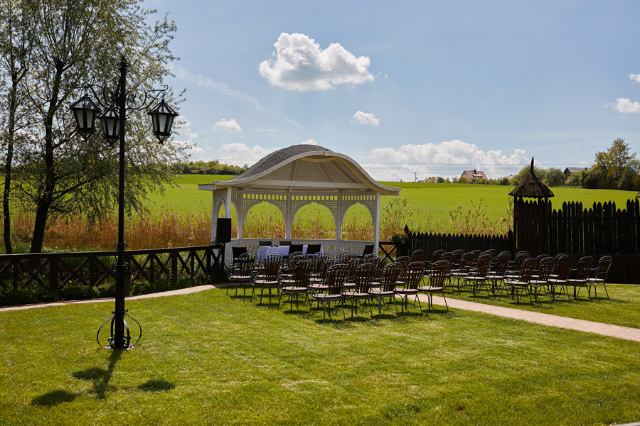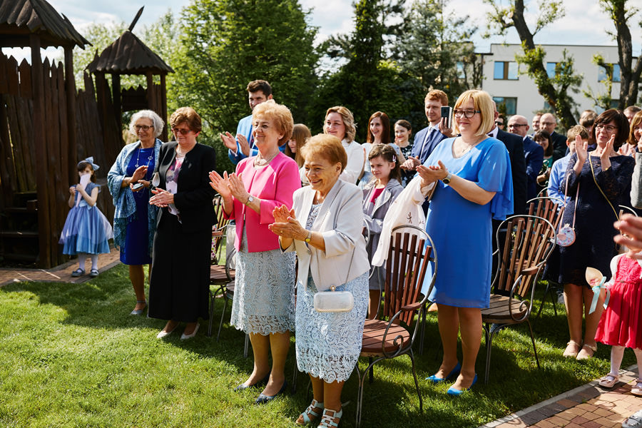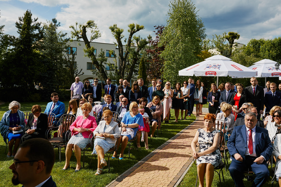 Ażurowa biała altanka, piękne otoczenie, słoneczne popołudnie – idealne warunki na ślub w plenerze. Mieliśmy wielkie szczęście, że słońce tego dnia było nienachalne, a godzina ślubu popołudniowa, co stworzyło idealne warunki do fotografowania. Zapamiętałam z tego ślubu szczególną atmosferę bliskości. Widać było, że to był wyczekany dzień szczęścia, że para młoda jest ze sobą od lat i wszyscy serdecznie im kibicują, znają ich i otaczają miłością.