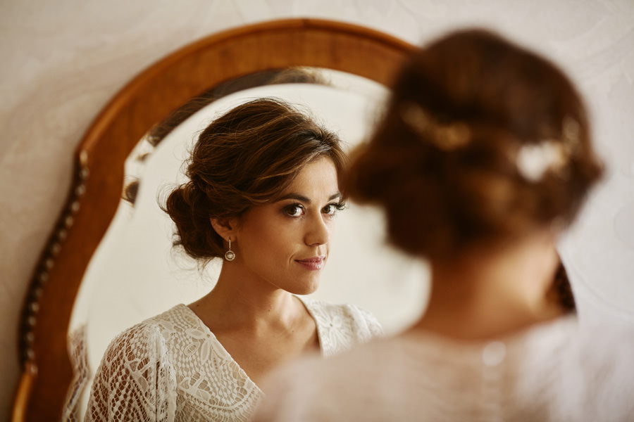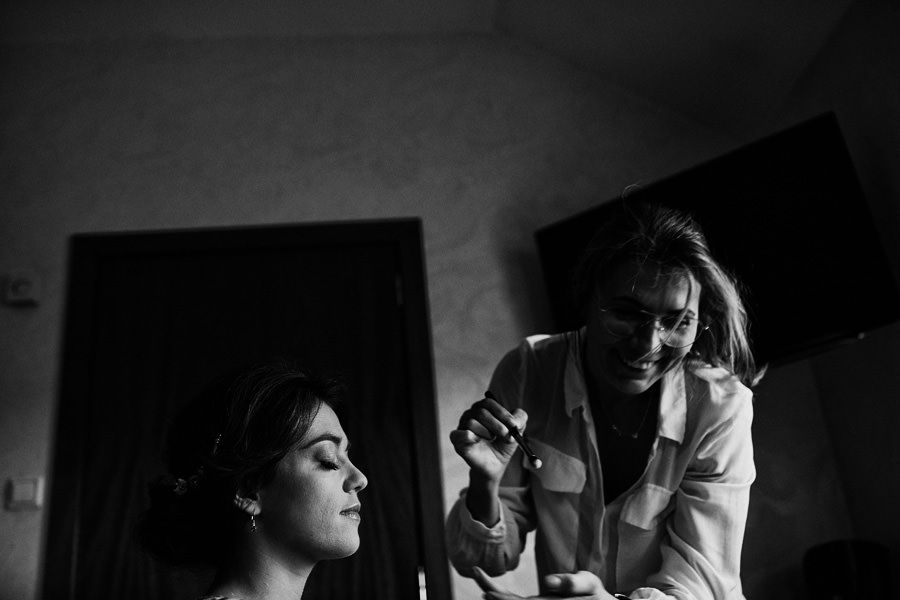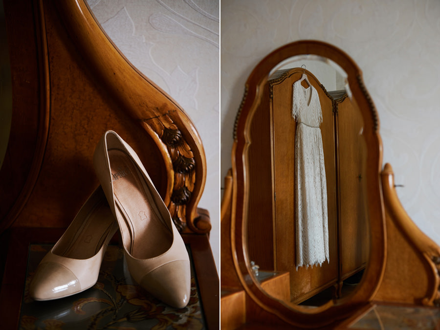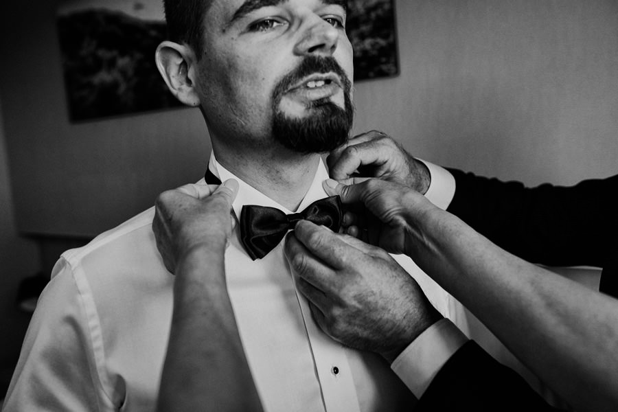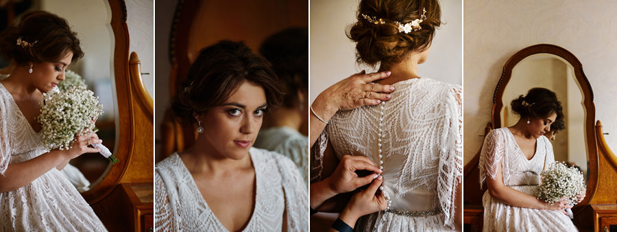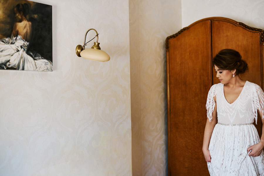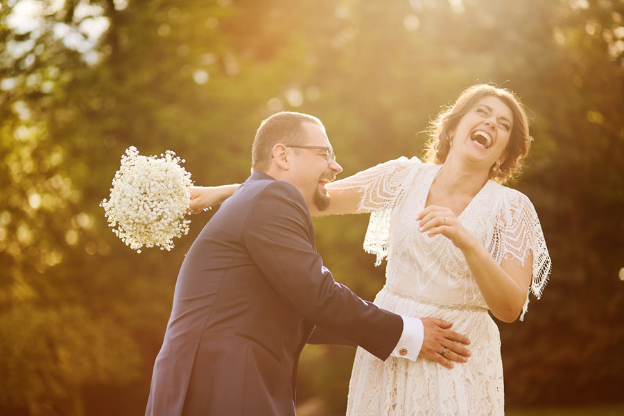 Ale zanim impreza, to najpierw trzeba się nieco ogarnąć. Założyć niesamowitą boho suknię, zamienić koszulkę z Hitchcockiem na garnitur – trochę szkoda, ale żaden konwenans by tego nie dźwignął. A potem first look i moje ukochane zdjęcie, kiedy on widzi i jej plecy i rząd guziczków, i wydaje z siebie przeciągły jęk, a ona pęka ze śmiechu ;). Bo wiecie, kto te guziki będzie rozpinał, nie? Wiadomo – nerwica na tle seksualnym murowana ;).