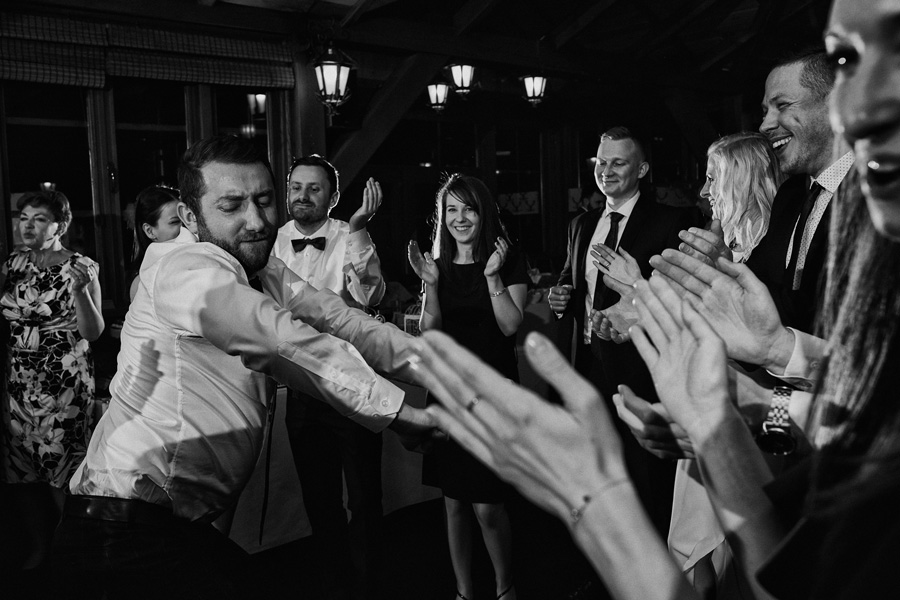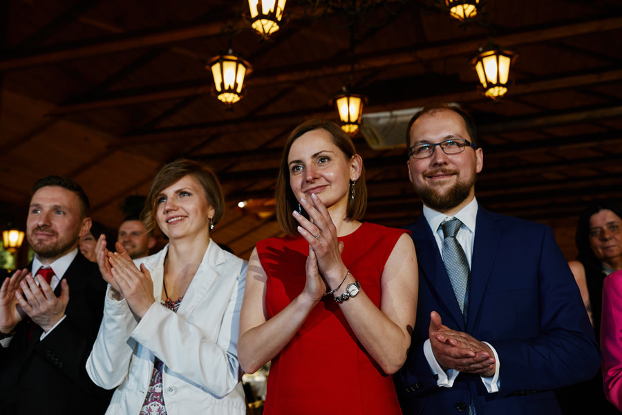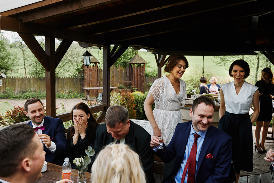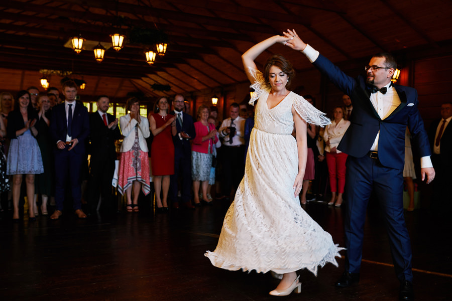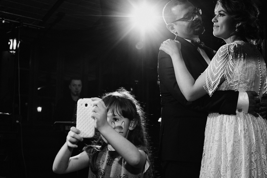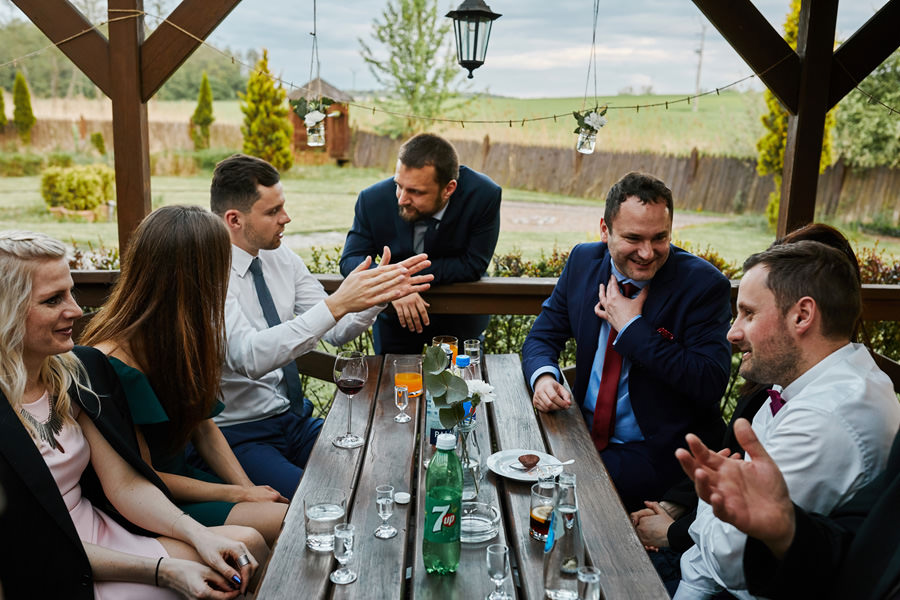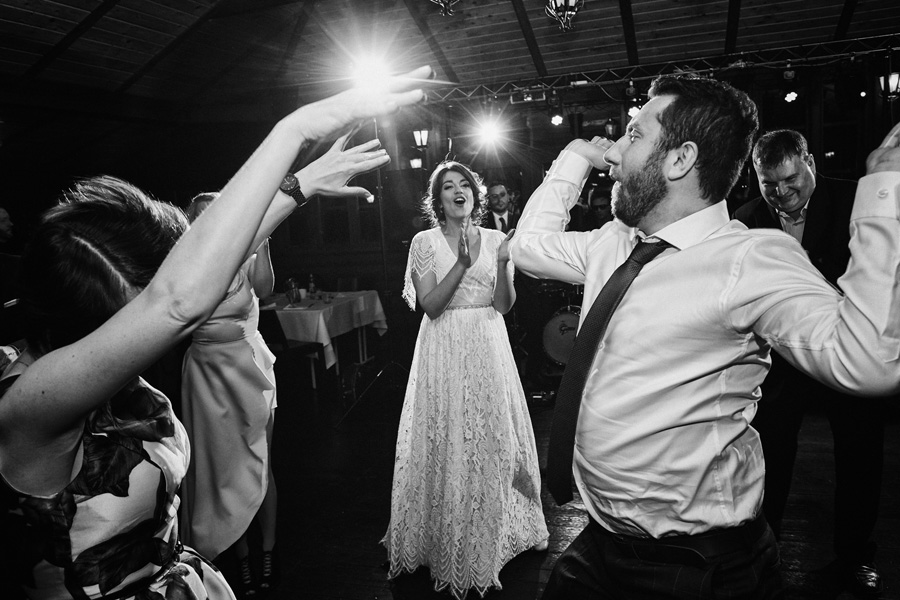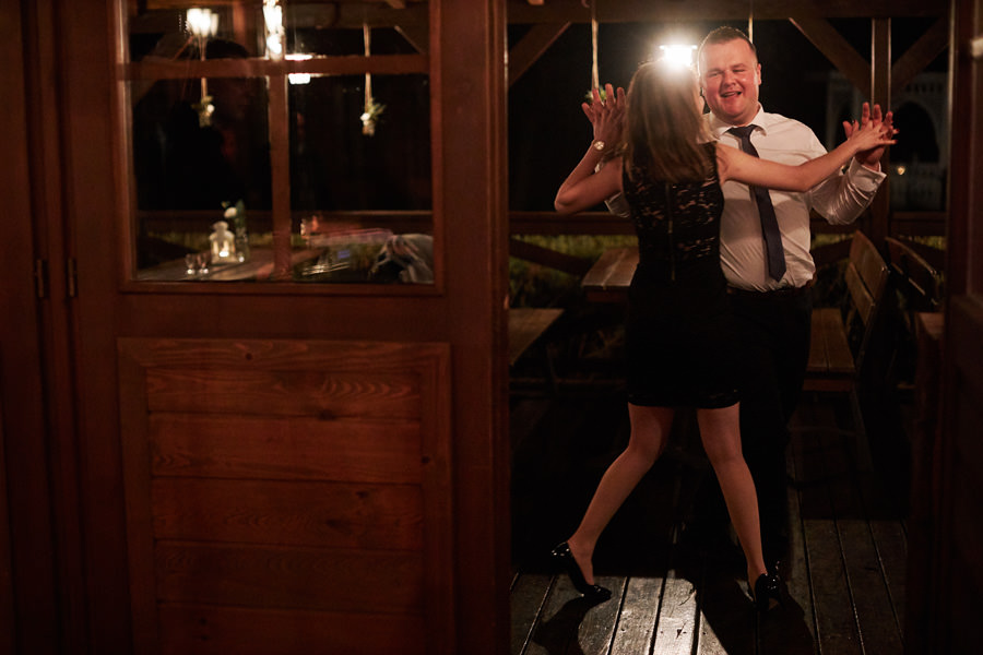 Początek był raczej raczej kameralny, niewielkie grono, spokój. Nagle pojawia się Szymon w koszulce z Hitchcockiem. Przez myśl przebiegło nam – „swój człowiek”, zapowiada się nieźle. Skupiam się na detalach – na dodatkach panny młodej, gdy nagle widzę naszyjnik, a na nim zawieszkę w kształcie mózgu. Przepiękny srebrny mózg! Wtedy już wiedzieliśmy, że to będzie ogień. Impreza zdecydowanie w naszym stylu i taka, jakie kochamy najbardziej :).