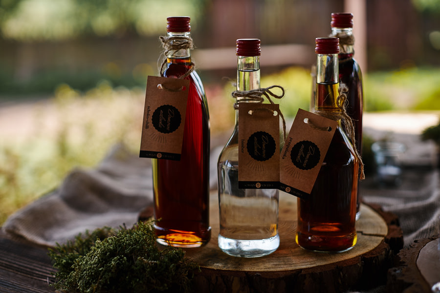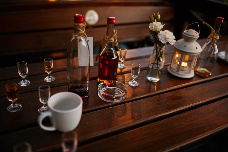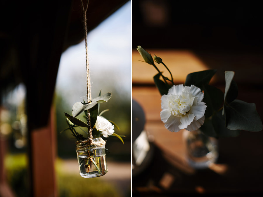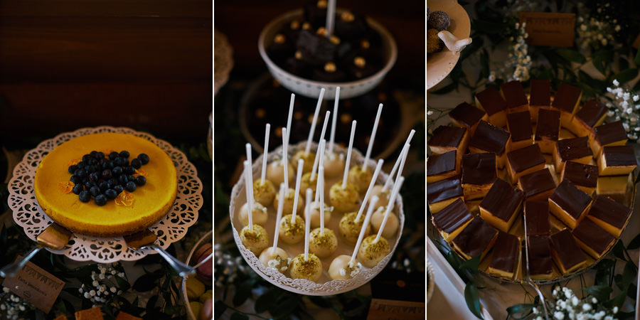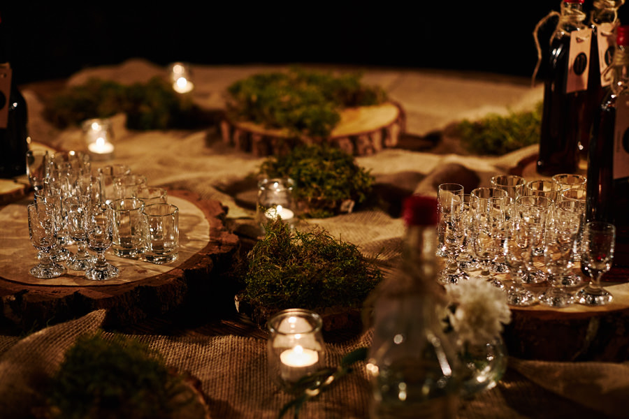 Takie miejsce jak to nawet nie wymaga, by jakoś specjalnie je dekorować. Delikatna gipsówka, białe kwiaty wiszące w małych słoiczkach, niewielkie bukiety, drewniane dodatki – to okazało się wystarczające, by wesele w Witkowej Chacie było naprawdę piękne i zapadające w pamięć. Zwłaszcza że istotnym miejscem na sali był słodki bufet. Najpiękniejszy, jaki widziałam (i pełen pyszności). Do tego na zewnątrz był przepięknie udekorowany drewnem i mchem stoliczek alkoholowy z różnego rodzaju nalewkami. Tych niestety nie próbowałam, ale z pewnością były wyborne. Przełożyło się to na wyborną imprezę. Zresztą – nie ma co przedłużać, zobaczcie sami!
