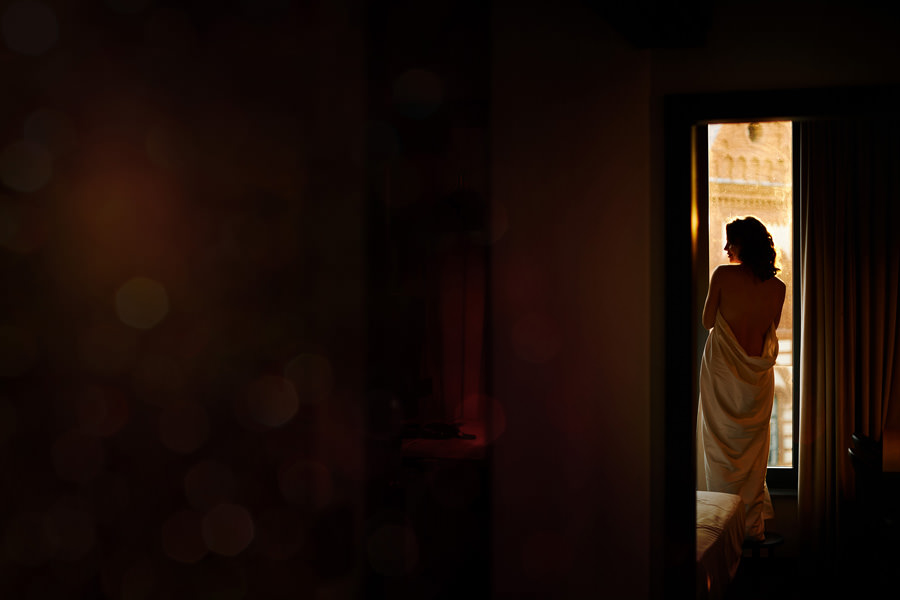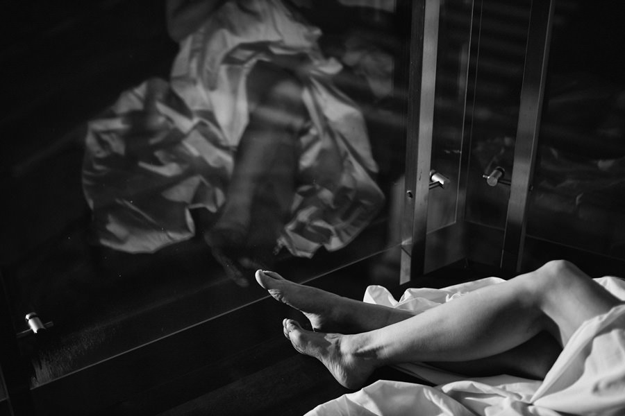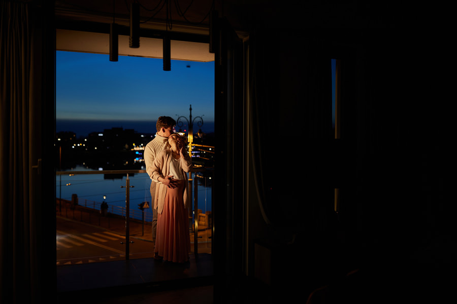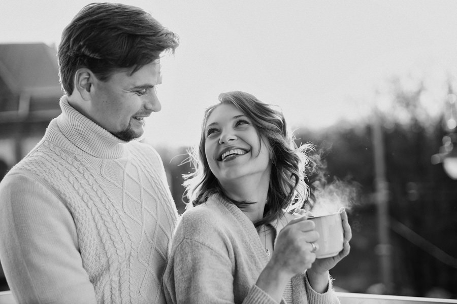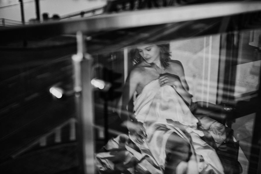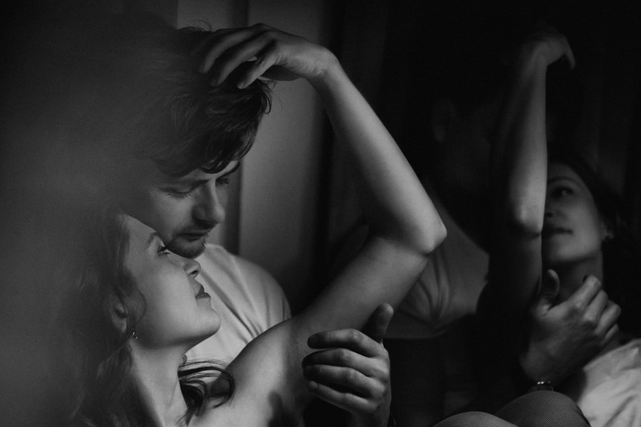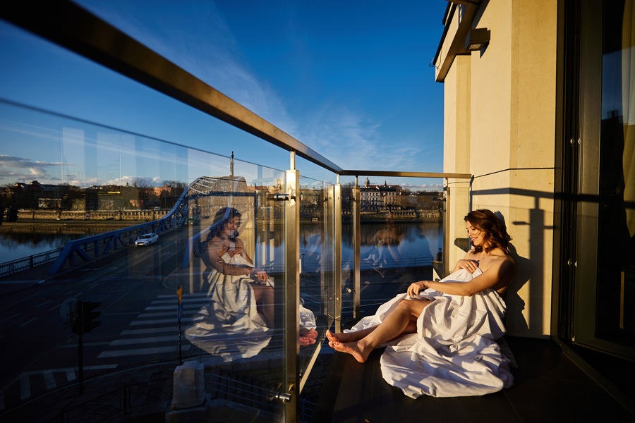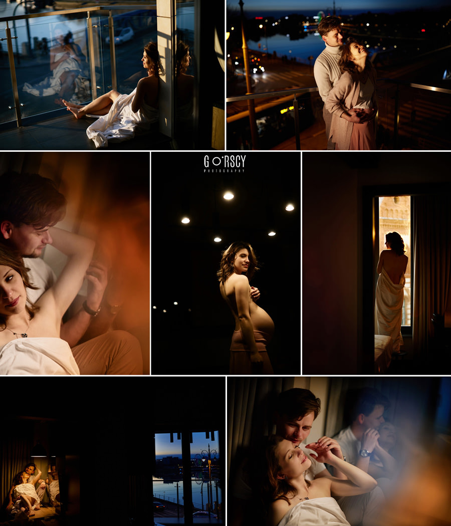 Od razu wspomnę – my nie przebieramy w tiulowe suknie. Nie dyskutuję z tą modą, po prostu nie jest to moja estetyka. Jak każda sesja zdjęciowa, również sesja ciążowa ma w sobie znaczący element kreacji, coś tu cały czas wymyślamy – od strojów, poprzez otoczenie, do pozowania – ale jednak nadrzędna jest chęć pokazania tego jak najnaturalniej, jak najbliżej prawdy. Dlatego, jeśli pary potrzebują porady – sugeruję coś prostego. T-shirt czy koszula i jeansy dla niego oraz coś, co pozwoli swobodnie odsłonić brzuch – dla niej. W sesji, którą zaraz obejrzycie, ostatecznie najlepszym strojem okazała się hotelowa poszwa :). Była wygodna, ładnie się układała, dawała konieczną swobodę i pozwoliła zbudować intymny charakter tej sesji. Osobiście zachęcam też do aktów. Nagość w ciąży jest zupełnie inna. Dla mnie jest to nagość niejako ubrana w ciążę – więc tak naprawdę wcale nie nagość. Jest w tym ludzka cielesność i jednocześnie jakiś nadludzki pierwiastek. Chyba brakuje mi słów, żeby to opisać. Jest to czysta postać piękna. Po prostu.