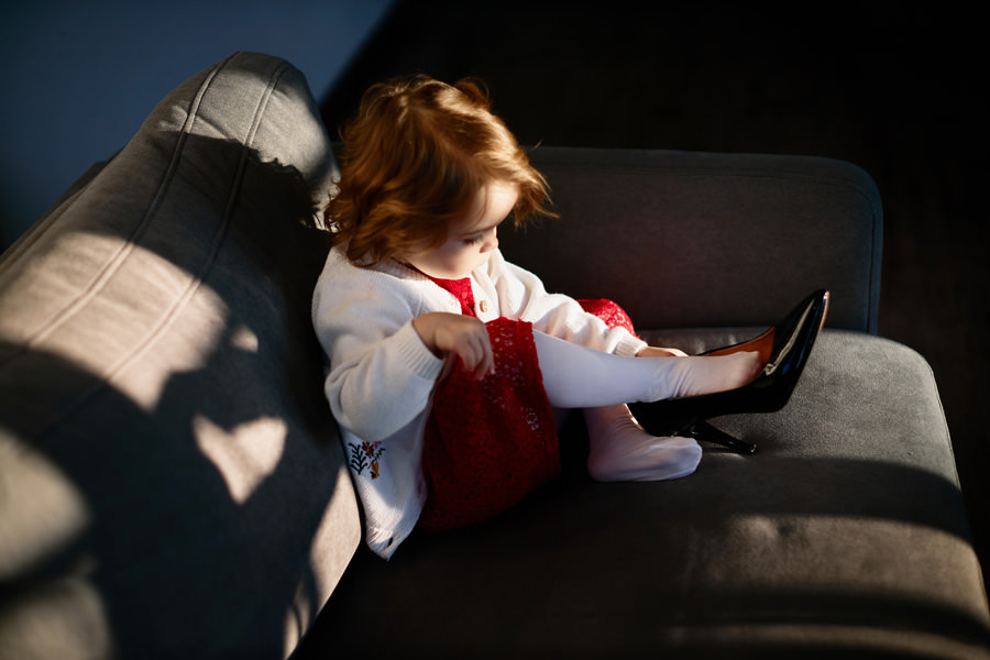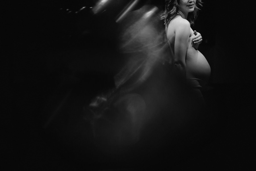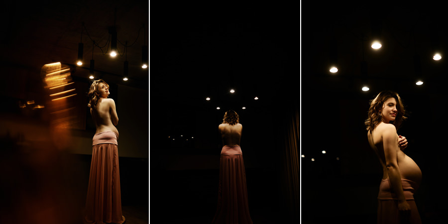 Z mojego doświadczenia w pracy przy takich sesjach wynika, że najlepszy okres jest mniej więcej między 28 a 32 tygodniem ciąży. Brzuch jest już dość duży, żeby nie pomylić ciążowego brzuszka z tym, który ma się po zbyt dużej ilości bigosu ;). Jednocześnie nie jest jeszcze zbyt ciężko, można się w miarę swobodnie poruszać. Raczej też możemy być pewni, że przyszłej mamie wystarczy cierpliwości do pozowania. Choć u nas to pozowanie jest tylko trochę pozowane, a w dużej mierze niepozowane, ale o tym za chwilę :).