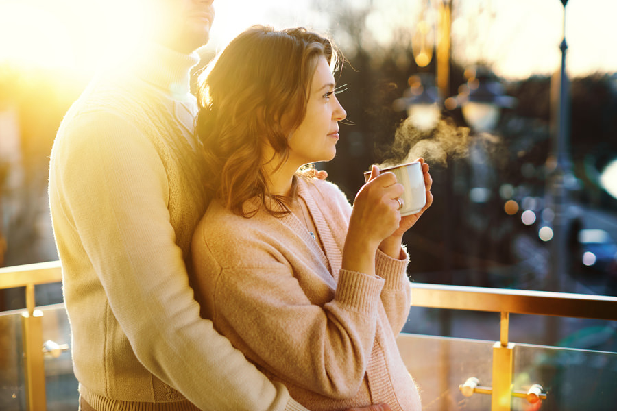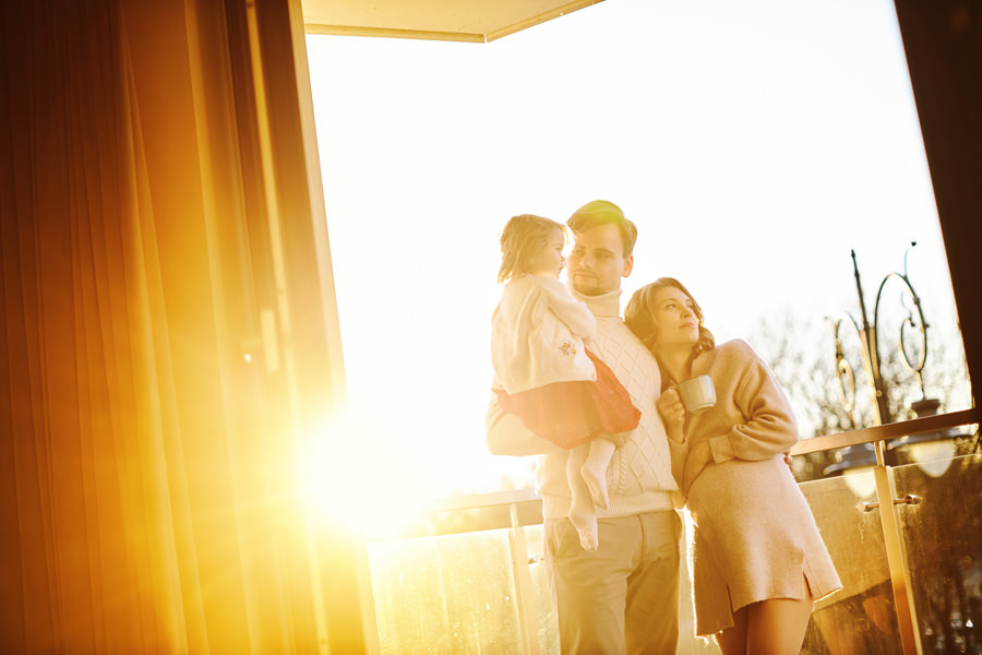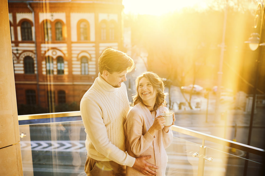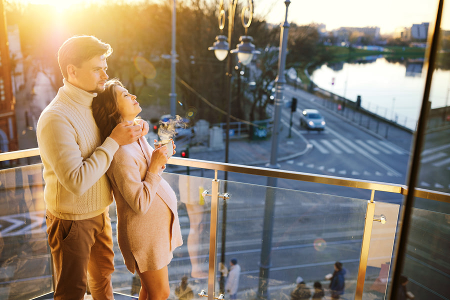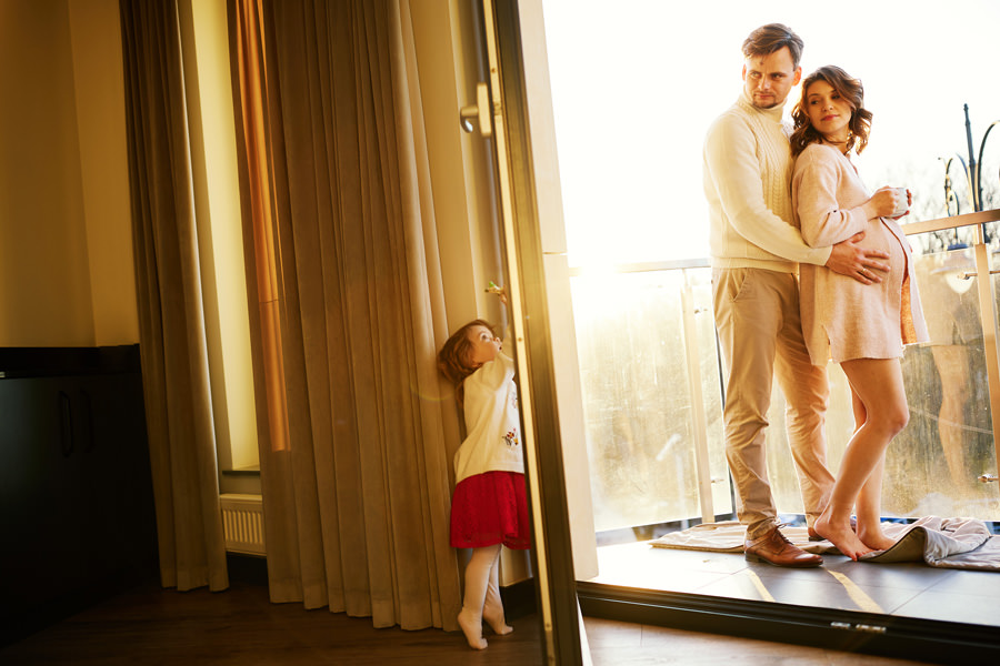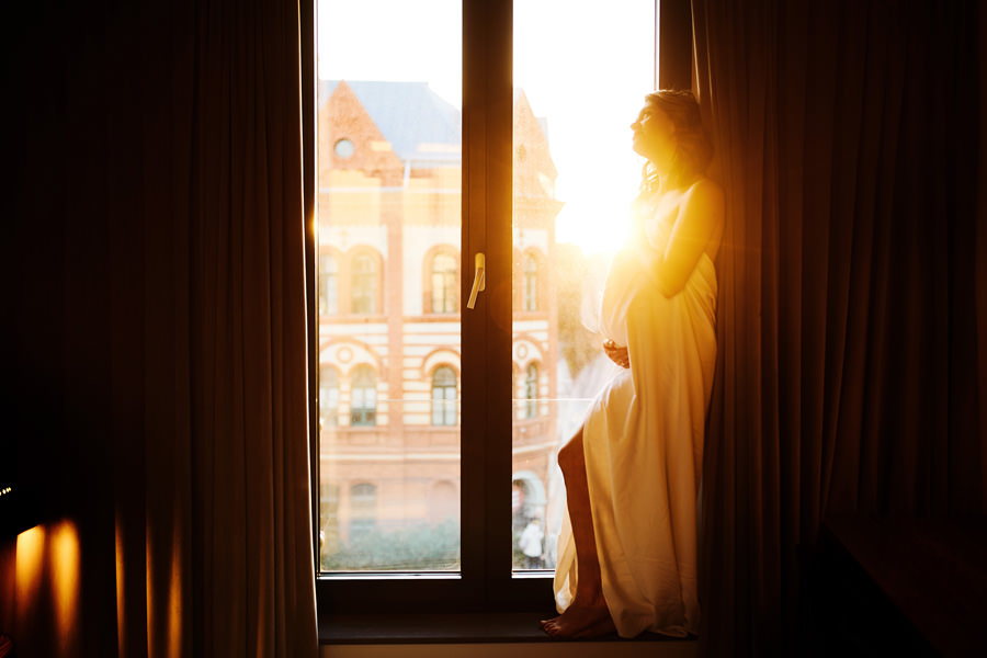 Wszystko zależy od tego, gdzie będziemy ją wykonywać. Można wykonać ją w plenerze – w naturze lub w mieście. Może mieć charakter trochę modowy i lifestylowy. Wszystko zależy od temperamentu i upodobań przyszłych rodziców. Jeśli tylko przyszła mama czuje się na siłach – ten pomysł bardzo mi się podoba. Wymaga specjalnego przygotowania, trochę jak na piknik, bo bezwzględnie musimy mieć ze sobą wodę i coś do jedzenia. I absolutnie konieczne są również wygodne buty. Częściej jednak na sesje ciążowe wybieramy wnętrza. Zwłaszcza jeśli ten magiczny miesiąc – między 28 a 32 tygodniem ciąży wypada akurat w takim momencie roku, że spacery w plenerze są słabym pomysłem. Lub gdy przyszła mama najzwyczajniej w świecie nie ma na to siły i chęci. Świetnym miejscem jest po prostu dom. A jeśli nie ma takiej możliwości – ze względu na daleki dojazd lub brak odpowiedniej przestrzeni, umawiamy się w studio lub w wynajętym apartamencie. W tym drugim przypadku można połączyć przyjemne z pożytecznym, albo raczej przyjemne z przyjemnym, bo można mieć jednego dnia sesję, a na kolejny zostać w apartamencie, zjeść pyszne śniadanie i jeszcze zwiedzić miasto.